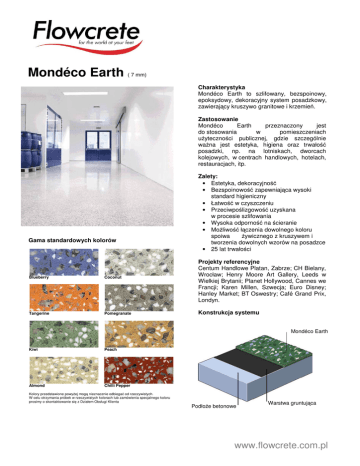 Mondéco Earth ( 7 mm) Charakterystyka Mondéco Earth to szlifowany, bezspoinowy, epoksydowy, dekoracyjny system posadzkowy, zawierający kruszywo granitowe i krzemień. Zastosowanie Mondéco Earth przeznaczony jest do stosowania w pomieszczeniach użyteczności publicznej, gdzie szczególnie ważna jest estetyka, higiena oraz trwałość posadzki, np. na lotniskach, dworcach kolejowych, w centrach handlowych, hotelach, restauracjach, itp. Gama standardowych kolorów Blueberry Coconut Tangerine Pomegranate Zalety: • Estetyka, dekoracyjność • Bezspoinowość zapewniająca wysoki standard higieniczny • Łatwość w czyszczeniu • Przeciwpoślizgowość uzyskana w procesie szlifowania • Wysoka odporność na ścieranie • Możliwość łączenia dowolnego koloru spoiwa żywicznego z kruszywem i tworzenia dowolnych wzorów na posadzce • 25 lat trwałości Projekty referencyjne Centum Handlowe Platan, Zabrze; CH Bielany, Wrocław; Henry Moore Art Gallery, Leeds w Wielkiej Brytanii; Planet Hollywood, Cannes we Francji; Karen Millen, Szwecja; Euro Disney; Hanley Market; BT Oswestry; Café Grand Prix, Londyn. Konstrukcja systemu Mondéco Earth Kiwi Peach Almond Chilli Pepper Kolory przedstawione powyżej mogą nieznacznie odbiegać od rzeczywistych. W celu otrzymania próbek w rzeczywistych kolorach lub zamówienia specjalnego koloru prosimy o skontaktowanie się z Działem Obsługi Klienta Podłoże betonowe Warstwa gruntująca www.flowcrete.com.pl Dane techniczne Poniższe wyniki badań uzyskano w badaniach o laboratoryjnych przy temperaturze 20 C i 50% wilgotności względnej. Charakterystyka systemu Produkt: Mondéco Earth Wykończenie powierzchni: połysk Grubość: ok. 7 mm Kolor: według katalogu Producent: Flowcrete Group Ltd, UK Dostawca: Flowcrete Polska Sp. z o.o. Telefon: Dział Obsługi Klienta +48 22 879 89 07 Klasyfikacja ogniowa Przeciwpoślizgowość Wykonanie systemu Przygotowanie i wykonanie systemu powinno być przeprowadzone przez Autoryzowanego Wykonawcę zgodnie z instrukcją producenta oraz dokumentacją techniczną. Aby uzyskać szczegółowe informacje dotyczące sieci Autoryzowanych Wykonawców należy skontaktować się z Działem Obsługi Klienta lub wysłać zapytanie przez naszą stronę internetową: www.flowcrete.com.pl Produkty wchodzące w skład systemu Warstwa gruntująca: Peran STC Warstwa zasadnicza: Mondéco Earth Warstwa zamykająca: Peran TCW Politura: Gemstar Laser Szczegółowa życzenie. instrukcja wykonania Odporność termiczna Nasiąkliwość Odporność na ścieranie Wytrzymałość na ściskanie Wytrzymałość na zginanie Wytrzymałość na rozciąganie Wytrzymałość na odrywanie Czas utwardzania dostępna na Wymagania dla podłoża betonowego Podkład betonowy powinien być klasy C20/25, pozbawiony mleczka cementowego, kurzu i innych zanieczyszczeń. Wilgotność względna betonu nie może przekraczać 75% zgodnie z normą BS 8204. W przypadku wyższych wilgotności należy zastosować żywicę Hydraseal DPM jako warstwę gruntującą. Czyszczenie i konserwacja Posadzkę można zamiatać, odkurzać, zmywać na mokro lub sprzątać przy użyciu maszyny czyszczącej wyposażonej w tarcze szczotkowe w połączeniu ze średnio alkalicznym detergentem. Wpływ na środowisko Produkt końcowy uważany jest za nieszkodliwy dla zdrowia i środowiska. Bezspoinowość, szczelność i doskonała przyczepność do podłoża powodują, że system spełnia wymagania higieniczne i ochrony środowiska. Posadzka jest łatwa do utrzymania w czystości i wymaga tylko w minimalnym zakresie stosowania chemicznych środków czystości. BS476: Część 7: Rozprzestrzenianie ognia Klasa 2 BS7976-2 Sucha >40 o Do 60 C Zerowa – test Karstena BS8204: Część 2 Klasa AR2 2 >55 N/mm (BS6319) 2 >20 N/mm (BS6319) 2 >10 N/mm (BS6319) Wyższa niż powierzchniowa wytrzymałość betonu klasy C20/25 na rozciąganie ( >1,5 MPa). o o o 10 C 20 C 30 C Ruch pieszy 24 h 16 h 10 h Ruch pojazdów 72 h 48 h 36 h Pełne utwardzenie 12 dni 7 dni 7 dni Kompleksowa obsługa klienta Flowcrete Group Ltd jest światowym liderem w branży posadzkowej, specjalizującym się w posadzkach na bazie żywic syntetycznych. Dostępne systemy obejmują między innymi: samorozlewne masy posadzkowe, systemy do ogrzewania podłogowego, membrany przeciwwilgociowe, posadzki przemysłowe i dekoracyjne, nawierzchnie parkingowe, systemy antykorozyjne. Naszym celem jest spełnienie Państwa wymagań w zakresie posadzek. Zamówienia dotyczące specjalnych kolorów i wzorów realizowane są na życzenie klienta. Informacje uzupełniające Produkty Flowcrete zapewniają najwyższy standard jakościowy. Zasady sprzedaży materiałów oraz gwarancji zawarte są w Szczególnych Warunkach Dostaw i Sprzedaży (dokument dostępny na życzenie). W celu upewnienia się, czy wybrane przez Państwa rozwiązanie spełnia wszystkie wymagania projektowe i użytkowe prosimy o kontakt z Działem Obsługi Klienta. Flowcrete Polska Sp. z o.o. Ul. Marywilska 34 I, 03-228 Warszawa, Polska Tel. +48 22 879 89 07, Fax: +48 22 879 89 18 Email: [email protected] Flowcrete Polska jest częścią firmy RPM www.flowcrete.com.pl