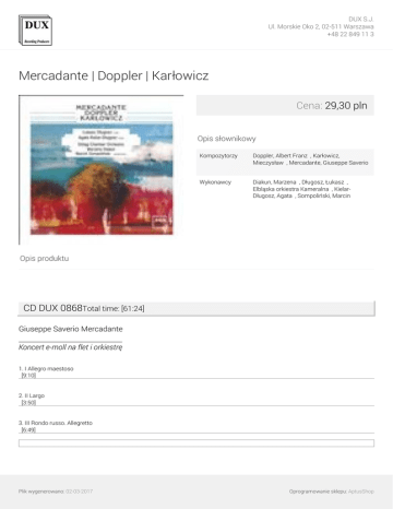 DUX S.J. Ul. Morskie Oko 2, 02-511 Warszawa +48 22 849 11 3 Mercadante | Doppler | Karłowicz Cena: 29,30 pln Opis słownikowy Kompozytorzy Doppler, Albert Franz ∎, Karłowicz, Mieczysław ∎, Mercadante, Giuseppe Saverio ∎ Wykonawcy Diakun, Marzena ∎, Długosz, Łukasz ∎, Elbląska orkiestra Kameralna ∎, KielarDługosz, Agata ∎, Sompoliński, Marcin ∎ Opis produktu CD DUX 0868Total time: [61:24] Giuseppe Saverio Mercadante Koncert e-moll na flet i orkiestrę 1. I Allegro maestoso [9:10] 2. II Largo [3:50] 3. III Rondo russo. Allegretto [6:49] Plik wygenerowano: 02-03-2017 Oprogramowanie sklepu: AptusShop DUX S.J. Ul. Morskie Oko 2, 02-511 Warszawa +48 22 849 11 3 Albert Franz Doppler Andante i Rondo op. 25 4. Andante [4:28] 5. Rondo [5:51] Albert Franz Doppler Duettino hongrois op. 36 6. Duettino hongrois op. 36 na dwa flety i fortepian / Duettino hongrois Op.36 for two flutes and piano [8:27] Mieczysław Karłowicz Serenada na smyczki op. 2 7. I March. Allegro moderato [6:23] 8. II Romance. Andante con moto [6:25] 9. III Waltz. Allegro moderato [6:15] 10. IV Finale. Allegretto non troppo [3:43] Wykonawcy: Elbląska orkiestra Kameralna Agata Kielar-Długosz /flet/ Łukasz Długosz /flet/ Marcin Sompoliński /dyrygent/ Marzena Diakun /dyrygent/ Plik wygenerowano: 02-03-2017 Powered by TCPDF (www.tcpdf.org) Oprogramowanie sklepu: AptusShop
