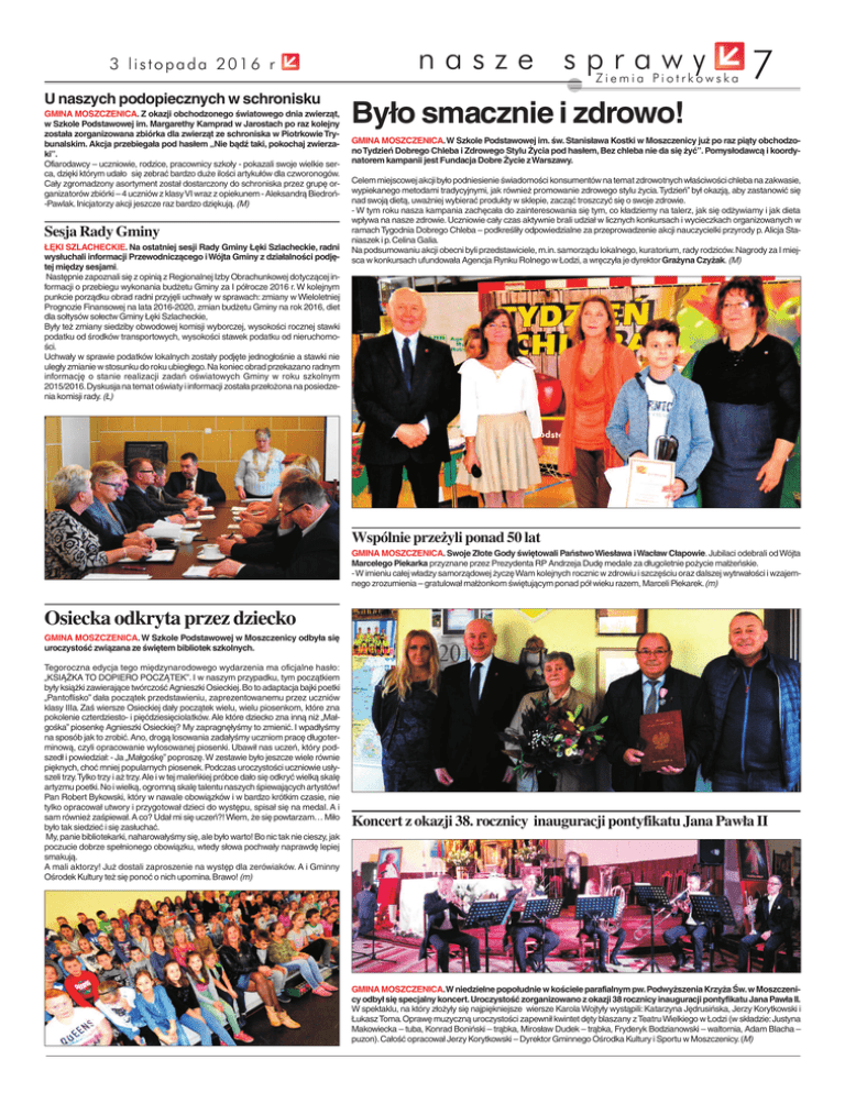 3 listopada 2016 r U naszych podopiecznych w schronisku GMINA MOSZCZENICA. Z okazji obchodzonego światowego dnia zwierząt, w Szkole Podstawowej im. Margarethy Kamprad w Jarostach po raz kolejny została zorganizowana zbiórka dla zwierząt ze schroniska w Piotrkowie Trybunalskim. Akcja przebiegała pod hasłem „Nie bądź taki, pokochaj zwierzaki”. Ofiarodawcy – uczniowie, rodzice, pracownicy szkoły - pokazali swoje wielkie serca, dzięki którym udało się zebrać bardzo duże ilości artykułów dla czworonogów. Cały zgromadzony asortyment został dostarczony do schroniska przez grupę organizatorów zbiórki – 4 uczniów z klasy VI wraz z opiekunem - Aleksandrą Biedroń-Pawlak. Inicjatorzy akcji jeszcze raz bardzo dziękują. (M) Sesja Rady Gminy ŁĘKI SZLACHECKIE. Na ostatniej sesji Rady Gminy Łęki Szlacheckie, radni wysłuchali informacji Przewodniczącego i Wójta Gminy z działalności podjętej między sesjami. Następnie zapoznali się z opinią z Regionalnej Izby Obrachunkowej dotyczącej informacji o przebiegu wykonania budżetu Gminy za I półrocze 2016 r. W kolejnym punkcie porządku obrad radni przyjęli uchwały w sprawach: zmiany w Wieloletniej Prognozie Finansowej na lata 2016-2020, zmian budżetu Gminy na rok 2016, diet dla sołtysów sołectw Gminy Łęki Szlacheckie, Były też zmiany siedziby obwodowej komisji wyborczej, wysokości rocznej stawki podatku od środków transportowych, wysokości stawek podatku od nieruchomości. Uchwały w sprawie podatków lokalnych zostały podjęte jednogłośnie a stawki nie uległy zmianie w stosunku do roku ubiegłego.Na koniec obrad przekazano radnym informację o stanie realizacji zadań oświatowych Gminy w roku szkolnym 2015/2016.Dyskusja na temat oświaty i informacji została przełożona na posiedzenia komisji rady. (Ł) nasze sprawy Ziemia Piotrkowska 7 Było smacznie i zdrowo! GMINA MOSZCZENICA.W Szkole Podstawowej im. św. Stanisława Kostki w Moszczenicy już po raz piąty obchodzono Tydzień Dobrego Chleba i Zdrowego Stylu Życia pod hasłem, Bez chleba nie da się żyć”. Pomysłodawcą i koordynatorem kampanii jest Fundacja Dobre Życie z Warszawy. Celem miejscowej akcji było podniesienie świadomości konsumentów na temat zdrowotnych właściwości chleba na zakwasie, wypiekanego metodami tradycyjnymi, jak również promowanie zdrowego stylu życia.Tydzień” był okazją, aby zastanowić się nad swoją dietą, uważniej wybierać produkty w sklepie, zacząć troszczyć się o swoje zdrowie. - W tym roku nasza kampania zachęcała do zainteresowania się tym, co kładziemy na talerz, jak się odżywiamy i jak dieta wpływa na nasze zdrowie. Uczniowie cały czas aktywnie brali udział w licznych konkursach i wycieczkach organizowanych w ramach Tygodnia Dobrego Chleba – podkreśliły odpowiedzialne za przeprowadzenie akcji nauczycielki przyrody p. Alicja Staniaszek i p. Celina Galia. Na podsumowaniu akcji obecni byli przedstawiciele, m.in.samorządu lokalnego, kuratorium, rady rodziców.Nagrody za I miejsca w konkursach ufundowała Agencja Rynku Rolnego w Łodzi, a wręczyła je dyrektor Grażyna Czyżak. (M) Wspólnie przeżyli ponad 50 lat GMINA MOSZCZENICA. Swoje Złote Gody świętowali Państwo Wiesława i Wacław Cłapowie. Jubilaci odebrali od Wójta Marcelego Piekarka przyznane przez Prezydenta RP Andrzeja Dudę medale za długoletnie pożycie małżeńskie. - W imieniu całej władzy samorządowej życzę Wam kolejnych rocznic w zdrowiu i szczęściu oraz dalszej wytrwałości i wzajemnego zrozumienia – gratulował małżonkom świętującym ponad pół wieku razem, Marceli Piekarek.(m) Osiecka odkryta przez dziecko GMINA MOSZCZENICA. W Szkole Podstawowej w Moszczenicy odbyła się uroczystość związana ze świętem bibliotek szkolnych. Tegoroczna edycja tego międzynarodowego wydarzenia ma oficjalne hasło: „KSIĄŻKA TO DOPIERO POCZĄTEK”. I w naszym przypadku, tym początkiem były książki zawierające twórczość Agnieszki Osieckiej.Bo to adaptacja bajki poetki „Pantoflisko” dała początek przedstawieniu, zaprezentowanemu przez uczniów klasy IIIa. Zaś wiersze Osieckiej dały początek wielu, wielu piosenkom, które zna pokolenie czterdziesto- i pięćdziesięciolatków. Ale które dziecko zna inną niż „Małgośka” piosenkę Agnieszki Osieckiej? My zapragnęłyśmy to zmienić. I wpadłyśmy na sposób jak to zrobić. Ano, drogą losowania zadałyśmy uczniom pracę długoterminową, czyli opracowanie wylosowanej piosenki. Ubawił nas uczeń, który podszedł i powiedział: - Ja „Małgośkę” poproszę.W zestawie było jeszcze wiele równie pięknych, choć mniej popularnych piosenek.Podczas uroczystości uczniowie usłyszeli trzy.Tylko trzy i aż trzy.Ale i w tej maleńkiej próbce dało się odkryć wielką skalę artyzmu poetki.No i wielką, ogromną skalę talentu naszych śpiewających artystów! Pan Robert Bykowski, który w nawale obowiązków i w bardzo krótkim czasie, nie tylko opracował utwory i przygotował dzieci do występu, spisał się na medal. A i sam również zaśpiewał. A co? Udał mi się uczeń?! Wiem, że się powtarzam… Miło było tak siedzieć i się zasłuchać. My, panie bibliotekarki, naharowałyśmy się, ale było warto! Bo nic tak nie cieszy, jak poczucie dobrze spełnionego obowiązku, wtedy słowa pochwały naprawdę lepiej smakują. A mali aktorzy! Już dostali zaproszenie na występ dla zerówiaków. A i Gminny Ośrodek Kultury też się ponoć o nich upomina. Brawo! (m) Koncert z okazji 38. rocznicy inauguracji pontyfikatu Jana Pawła II GMINA MOSZCZENICA.W niedzielne popołudnie w kościele parafialnym pw. Podwyższenia Krzyża Św. w Moszczenicy odbył się specjalny koncert.Uroczystość zorganizowano z okazji 38 rocznicy inauguracji pontyfikatu Jana Pawła II. W spektaklu, na który złożyły się najpiękniejsze wiersze Karola Wojtyły wystąpili: Katarzyna Jędrusińska, Jerzy Korytkowski i Łukasz Toma