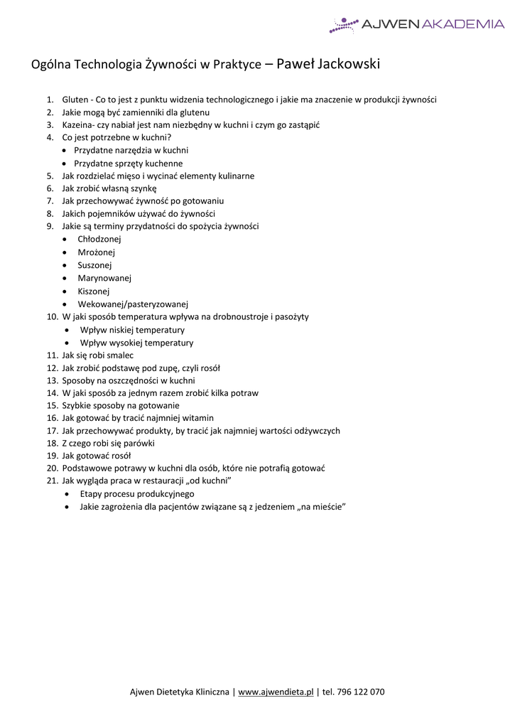 Ogólna Technologia Żywności w Praktyce – Paweł Jackowski 1. 2. 3. 4. 5. 6. 7. 8. 9. 10. 11. 12. 13. 14. 15. 16. 17. 18. 19. 20. 21. Gluten - Co to jest z punktu widzenia technologicznego i jakie ma znaczenie w produkcji żywności Jakie mogą być zamienniki dla glutenu Kazeina- czy nabiał jest nam niezbędny w kuchni i czym go zastąpić Co jest potrzebne w kuchni? Przydatne narzędzia w kuchni Przydatne sprzęty kuchenne Jak rozdzielać mięso i wycinać elementy kulinarne Jak zrobić własną szynkę Jak przechowywać żywność po gotowaniu Jakich pojemników używać do żywności Jakie są terminy przydatności do spożycia żywności Chłodzonej Mrożonej Suszonej Marynowanej Kiszonej Wekowanej/pasteryzowanej W jaki sposób temperatura wpływa na drobnoustroje i pasożyty Wpływ niskiej temperatury Wpływ wysokiej temperatury Jak się robi smalec Jak zrobić podstawę pod zupę, czyli rosół Sposoby na oszczędności w kuchni W jaki sposób za jednym razem zrobić kilka potraw Szybkie sposoby na gotowanie Jak gotować by tracić najmniej witamin Jak przechowywać produkty, by tracić jak najmniej wartości odżywczych Z czego robi się parówki Jak gotować rosół Podstawowe potrawy w kuchni dla osób, które nie potrafią gotować Jak wygląda praca w restauracji „od kuchni” Etapy procesu produkcyjnego Jakie zagrożenia dla pacjentów związane są z jedzeniem „na mieście” Ajwen Dietetyka Kliniczna | www.ajwendieta.pl | tel. 796 122 070
