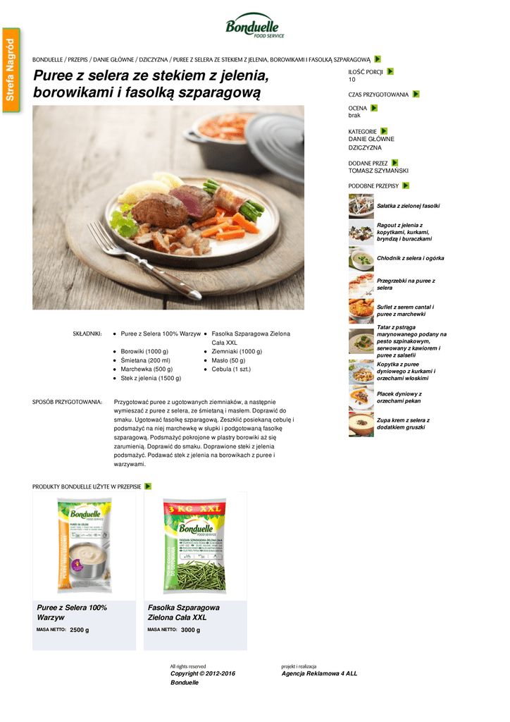 BONDUELLE / PRZEPIS / DANIE GŁÓWNE / DZICZYZNA / PUREE Z SELERA ZE STEKIEM Z JELENIA, BOROWIKAMI I FASOLKĄ SZPARAGOWĄ Puree z selera ze stekiem z jelenia, borowikami i fasolką szparagową ILOŚĆ PORCJI 10 CZAS PRZYGOTOWANIA OCENA brak KATEGORIE DANIE GŁÓWNE DZICZYZNA DODANE PRZEZ TOMASZ SZYMAŃSKI PODOBNE PRZEPISY Sałatka z zielonej fasolki Ragout z jelenia z kopytkami, kurkami, bryndzą i buraczkami Chłodnik z selera i ogórka Przegrzebki na puree z selera Suflet z serem cantal i puree z marchewki SKŁADNIKI: Puree z Selera 100% Warzyw Fasolka Szparagowa Zielona Cała XXL Borowiki (1000 g) Śmietana (200 ml) Marchewka (500 g) Ziemniaki (1000 g) Masło (50 g) Cebula (1 szt.) Kopytka z puree dyniowego z kurkami i orzechami włoskimi Stek z jelenia (1500 g) SPOSÓB PRZYGOTOWANIA: Placek dyniowy z orzechami pekan Przygotować puree z ugotowanych ziemniaków, a następnie wymieszać z puree z selera, ze śmietaną i masłem. Doprawić do smaku. Ugotować fasolkę szparagową. Zeszklić posiekaną cebulę i podsmażyć na niej marchewkę w słupki i podgotowaną fasolkę szparagową. Podsmażyć pokrojone w plastry borowiki aż się zarumienią. Doprawić do smaku. Doprawione steki z jelenia podsmażyć. Podawać stek z jelenia na borowikach z puree i warzywami. PRODUKTY BONDUELLE UŻYTE W PRZEPISIE Puree z Selera 100% Warzyw MASA NETTO: 2500 g Fasolka Szparagowa Zielona Cała XXL MASA NETTO: Tatar z pstrąga marynowanego podany na pesto szpinakowym, serwowany z kawiorem i puree z salsefii 3000 g All rights reserved projekt i realizacja Copyright © 2012-2016 Bonduelle Agencja Reklamowa 4 ALL Zupa krem z selera z dodatkiem gruszki