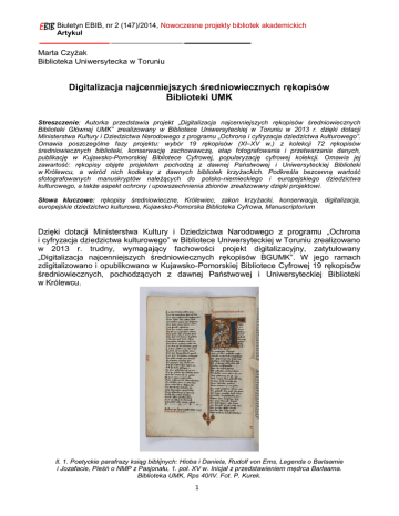 Biuletyn EBIB, nr 2 (147)/2014, Nowoczesne projekty bibliotek akademickich Artykuł Marta Czyżak Biblioteka Uniwersytecka w Toruniu Digitalizacja najcenniejszych średniowiecznych rękopisów Biblioteki UMK Streszczenie: Autorka przedstawia projekt „Digitalizacja najcenniejszych rękopisów średniowiecznych Biblioteki Głównej UMK” zrealizowany w Bibliotece Uniwersyteckiej w Toruniu w 2013 r. dzięki dotacji Ministerstwa Kultury i Dziedzictwa Narodowego z programu „Ochrona i cyfryzacja dziedzictwa kulturowego”. Omawia poszczególne fazy projektu: wybór 19 rękopisów (XI–XV w.) z kolekcji 72 rękopisów średniowiecznych biblioteki, konserwację zachowawczą, etap fotografowania i przetwarzania danych, publikację w Kujawsko-Pomorskiej Bibliotece Cyfrowej, popularyzację cyfrowej kolekcji. Omawia jej zawartość: rękopisy objęte projektem pochodzą z dawnej Państwowej i Uniwersyteckiej Biblioteki w Królewcu, a wśród nich kodeksy z dawnych bibliotek krzyżackich. Podkreśla bezcenną wartość sfotografowanych manuskryptów należących do polsko-niemieckiego i europejskiego dziedzictwa kulturowego, a także aspekt ochrony i upowszechnienia zbiorów zrealizowany dzięki projektowi. Słowa kluczowe: rękopisy średniowieczne, Królewiec, zakon krzyżacki, konserwacja, digitalizacja, europejskie dziedzictwo kulturowe, Kujawsko-Pomorska Biblioteka Cyfrowa, Manuscriptorium Dzięki dotacji Ministerstwa Kultury i Dziedzictwa Narodowego z programu „Ochrona i cyfryzacja dziedzictwa kulturowego” w Bibliotece Uniwersyteckiej w Toruniu zrealizowano w 2013 r. trudny, wymagający fachowości projekt digitalizacyjny, zatytułowany „Digitalizacja najcenniejszych średniowiecznych rękopisów BGUMK”. W jego ramach zdigitalizowano i opublikowano w Kujawsko-Pomorskiej Bibliotece Cyfrowej 19 rękopisów średniowiecznych, pochodzących z dawnej Państwowej i Uniwersyteckiej Biblioteki w Królewcu. Il. 1. Poetyckie parafrazy ksiąg biblijnych: Hioba i Daniela, Rudolf von Ems, Legenda o Barlaamie i Jozafacie, Pieśń o NMP z Pasjonału, 1. poł. XV w. Inicjał z przedstawieniem mędrca Barlaama. Biblioteka UMK, Rps 40/IV. Fot. P. Kurek. 1 Biuletyn EBIB, nr 2 (147)/2014, Nowoczesne projekty bibliotek akademickich Artykuł Zostały one wybrane z liczącej przeszło 70 manuskryptów kolekcji rękopisów średniowiecznych Biblioteki UMK. Ważnym kryterium selekcji był stan zachowania kodeksów, a także możliwość rozchylenia bloku książki, tak by ująć obiektywem aparatu np. noty umieszczone na wewnętrznych marginesach. Istotna była także przydatność tekstów zawartych w rękopisach do badań naukowych, a także piękno ich formy zewnętrznej. Pod tym kątem przejrzano wspólnie z pracownikami Oddziału Konserwacji wytypowane wstępnie rękopisy i po konsultacji z fotografem z Oddziału Digitalizacji zatwierdzono ostateczną listę kodeksów. Dawna Państwowa i Uniwersytecka Biblioteka w Królewcu dziedziczyła zbiory królów, wcześniej książąt pruskich (Biblioteki Zamkowej założonej w 1540 r. przez księcia Albrechta Hohenzollerna) i zbiory Uniwersytetu w Królewcu (nazywanego od imienia fundatora, księcia Albrechta — Albertyną). Pozostawały one w Królewcu do początków 1944 r., kiedy wobec zagrożenia zbliżającą się linią frontu zostały ewakuowane m.in. do miejscowości Słobity (Schlobitten) i Karwiny (Karwinden) koło Pasłęka w dawnych Prusach Wschodnich, które w 1945 r. znalazły się w granicach państwa polskiego. Odnalezione i zabezpieczone przez polską administrację zostały umieszczone w zbiornicy księgozbiorów zabezpieczonych w Pasłęku i na mocy zezwolenia Ministerstwa Oświaty przejęte w lipcu 1946 r. przez pracowników powstającej Biblioteki UMK. W naszych zbiorach znalazły się w ten sposób — i zostały obecnie zdigitalizowane — obiekty o wyjątkowej wartości historycznej i artystycznej. Wśród nich kodeksy z dawnych bibliotek krzyżackich, przewiezione przez księcia Albrechta w latach 40. XVI w. z Tapiawy (gdzie mieściła się po utracie Malborka w 1466 r. centralna biblioteka Zakonu) do Królewca, np. kopie listów papieża Grzegorza VII (cztery pergaminowe karty) z końca XI w.; „kieszonkowy” kodeks z tekstem Statutów zakonu krzyżackiego w językach niemieckim i francuskim powstały na początku XIV w. z inicjatywy wielkiego mistrza Karola z Trewiru, zdobiony oryginalną dekoracją filigranową; Kronika ziemi pruskiej (Di Kronike von Pruzinlant) Mikołaja von Jeroschin z 2. połowy XIV w.: drugi najstarszy zachowany w całości rękopis kroniki; alegoryczny poemat Tilona von Kulm Von siben Ingesigeln (1331) z korektami dokonanymi najprawdopodobniej ręką poety; kodeks z pomnikami średniowiecznej poezji niemieckiej, tj. poetyckimi parafrazami biblijnych ksiąg Hioba i Daniela, Legendą o Barlaamie i Jozafacie pióra Rudolfa von Ems (zm. ok. 1248) oraz pieśnią ku czci Najświętszej Marii Panny z Pasjonału, z miniaturami przedstawiającymi Daniela, Barlaama i Matkę Bożą. Il. 2. Ulotka promująca projekt. Opracowanie graficzne: Hanna Sierdzińska. 2 Biuletyn EBIB, nr 2 (147)/2014, Nowoczesne projekty bibliotek akademickich Artykuł Wśród bezcennych manuskryptów udostępnionych on-line znalazły się także inne królewieckie kodeksy, np. żywot błogosławionej Doroty z Mątowów Leben der seligen vrouwen Dorothee Jana z Kwidzynia z około 1400 r.: najstarszy zachowany przekaz żywota; rękopis z komentarzem do IV księgi Dekretałów papieża Grzegorza IV z inicjałem przedstawiającym scenę zaślubin, pochodzący z dawnej biblioteki katedralnej w Królewcu; Sermones quadragesimales (Kazania wielkopostne) z biblioteki skasowanego w 1823 r. opactwa cystersów w Pelplinie (najcenniejsze kodeksy pelplińskie po kasacie klasztoru przewieziono do Królewca); włoski modlitewnik z końca XV w. z piękną miniaturą przedstawiającą zwiastowanie; Prawo starochełmińskie (Der alte Kulm) z końca XIV w. zaku