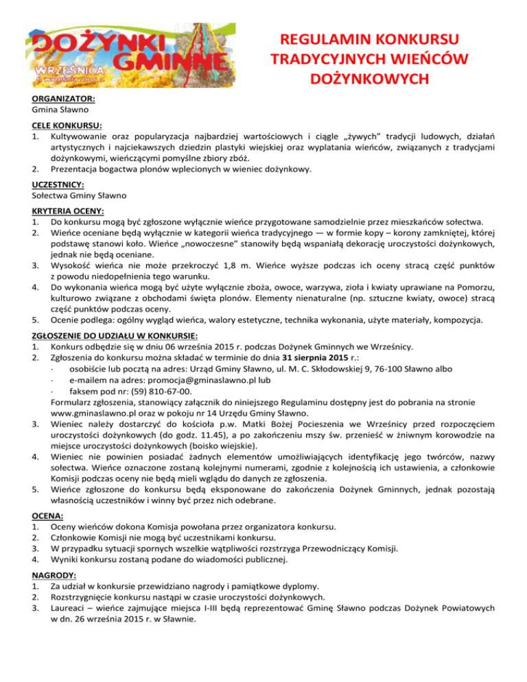 REGULAMIN KONKURSU TRADYCYJNYCH WIEŃCÓW DOŻYNKOWYCH ORGANIZATOR: Gmina Sławno CELE KONKURSU: 1. Kultywowanie oraz popularyzacja najbardziej wartościowych i ciągle „żywych” tradycji ludowych, działań artystycznych i najciekawszych dziedzin plastyki wiejskiej oraz wyplatania wieńców, związanych z tradycjami dożynkowymi, wieńczącymi pomyślne zbiory zbóż. 2. Prezentacja bogactwa plonów wplecionych w wieniec dożynkowy. UCZESTNICY: Sołectwa Gminy Sławno KRYTERIA OCENY: 1. Do konkursu mogą być zgłoszone wyłącznie wieńce przygotowane samodzielnie przez mieszkańców sołectwa. 2. Wieńce oceniane będą wyłącznie w kategorii wieńca tradycyjnego — w formie kopy – korony zamkniętej, której podstawę stanowi koło. Wieńce „nowoczesne” stanowiły będą wspaniałą dekorację uroczystości dożynkowych, jednak nie będą oceniane. 3. Wysokość wieńca nie może przekroczyć 1,8 m. Wieńce wyższe podczas ich oceny stracą część punktów z powodu niedopełnienia tego warunku. 4. Do wykonania wieńca mogą być użyte wyłącznie zboża, owoce, warzywa, zioła i kwiaty uprawiane na Pomorzu, kulturowo związane z obchodami święta plonów. Elementy nienaturalne (np. sztuczne kwiaty, owoce) stracą część punktów podczas oceny. 5. Ocenie podlega: ogólny wygląd wieńca, walory estetyczne, technika wykonania, użyte materiały, kompozycja. ZGŁOSZENIE DO UDZIAŁU W KONKURSIE: 1. Konkurs odbędzie się w dniu 06 września 2015 r. podczas Dożynek Gminnych we Wrześnicy. 2. Zgłoszenia do konkursu można składać w terminie do dnia 31 sierpnia 2015 r.: osobiście lub pocztą na adres: Urząd Gminy Sławno, ul. M. C. Skłodowskiej 9, 76-100 Sławno albo e-mailem na adres: [email protected] lub faksem pod nr: (59) 810-67-00. Formularz zgłoszenia, stanowiący załącznik do niniejszego Regulaminu dostępny jest do pobrania na stronie www.gminaslawno.pl oraz w pokoju nr 14 Urzędu Gminy Sławno. 3. Wieniec należy dostarczyć do kościoła p.w. Matki Bożej Pocieszenia we Wrześnicy przed rozpoczęciem uroczystości dożynkowych (do godz. 11.45), a po zakończeniu mszy św. przenieść w żniwnym korowodzie na miejsce uroczystości dożynkowych (boisko wiejskie). 4. Wieniec nie powinien posiadać żadnych elementów umożliwiających identyfikację jego twórców, nazwy sołectwa. Wieńce oznaczone zostaną kolejnymi numerami, zgodnie z kolejnością ich ustawienia, a członkowie Komisji podczas oceny nie będą mieli wglądu do danych ze zgłoszenia. 5. Wieńce zgłoszone do konkursu będą eksponowane do zakończenia Dożynek Gminnych, jednak pozostają własnością uczestników i winny być przez nich odebrane. OCENA: 1. Oceny wieńców dokona Komisja powołana przez organizatora konkursu. 2. Członkowie Komisji nie mogą być uczestnikami konkursu. 3. W przypadku sytuacji spornych wszelkie wątpliwości rozstrzyga Przewodniczący Komisji. 4. Wyniki konkursu zostaną podane do wiadomości publicznej. NAGRODY: 1. Za udział w konkursie przewidziano nagrody i pamiątkowe dyplomy. 2. Rozstrzygnięcie konkursu nastąpi w czasie uroczystości dożynkowych. 3. Laureaci – wieńce zajmujące miejsca I-III będą reprezentować Gminę Sławno podczas Dożynek Powiatowych w dn. 26 września 2015 r. w Sławnie.