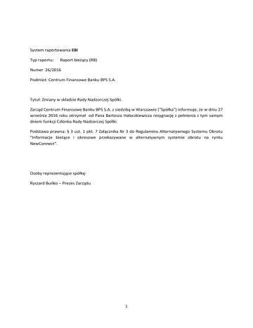 Zarząd Centrum Finansowe Banku BPS S.A. z siedzibą w Warszawie ("Spółka") informuje, że w dniu 27