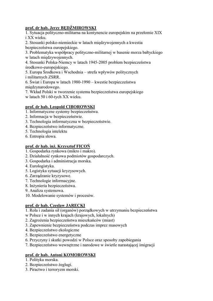 prof. dr hab. Jerzy BĘDŹMIROWSKI 1. Sytuacja polityczno-militarna na kontynencie europejskim na przełomie XIX i XX wieku. 2. Stosunki polsko-niemieckie w latach międzywojennych a kwestia bezpieczeństwa europejskiego. 3. Problematyka współpracy polityczno-militarnej w basenie morza bałtyckiego w latach międzywojennych. 4. Stosunki Polska-Niemcy w latach 1945-2005 problem bezpieczeństwa środkowo-europejskiego. 5. Europa Środkowa i Wschodnia – strefa wpływów politycznych i militarnych ZSRR. 6. Świat i Europa w latach 1980-1990 – kwestie bezpieczeństwa międzynarodowego. 7. Wkład Polski w tworzenie systemu bezpieczeństwa europejskiego w latach 50 i 60-tych XX wieku. prof. dr hab. Leopold CIBOROWSKI 1. Informatyczne systemy bezpieczeństwa. 2. Informacja w bezpieczeństwie. 3. Technologia informatyczna w bezpieczeństwie. 4. Bezpieczeństwo informatyczne. 5. Technologia intelektu 6. Entropia słowa. prof. dr hab. inż. Krzysztof FICOŃ 1. Gospodarka rynkowa (mikro i makro). 2. Działalność rynkowa podmiotów gospodarczych. 3. Gospodarka i administracja morska. 4. Eurologistyka. 5. Logistyka sytuacji kryzysowych. 6. Zarządzanie kryzysowe. 7. Technologie informacyjne. 8. Inżynieria bezpieczeństwa. 9. Analiza systemowa. 10. Modelowanie systemów i procesów. prof. dr hab. Czesław JARECKI 1. Rola i zadania sił (organów) porządkowych w utrzymaniu bezpieczeństwa w Polsce i w innych krajach (krajowych, lokalnych) 2. Zagrożenia bezpieczeństwa mieszkańców (miast) 3. Zapewnienie bezpieczeństwa podczas imprez masowych 4. Bezpieczeństwo ekologiczne 5. Bezpieczeństwo energetyczne 6. Przyczyny i skutki powodzi w Polsce oraz sposoby zapobiegania 7. Bezpieczeństwo wewnętrzne i narodowe w świetle narastającej imigracji prof. dr hab. Antoni KOMOROWSKI 1. Polityka morska. 2. Bezpieczeństwo żeglugi. 3. Piractwo i terroryzm morski. 4. Bezpieczeństwo żeglugi sportowej. 5. Bezpieczeństwo portów i marin. 6. Bezpieczeństwo śródlądowych dróg wodnych. 7. Historia Marynarki Wojennej 8. Historia morskiej sztuki wojennej prof. dr hab. Eugeniusz KOZACZKA 1. Analiza zagrożeń na terenach zurbanizowanych. 2. Ogólne zasady ochrony granic morskich. 3. Charakterystyka narzędzi do obserwacji obszarów zagrożonych działaniami terrorystycznymi. 4. Analiza skuteczności przeciwdziałań na zagrożenia o charakterze terrorystycznym. 5. Analiza możliwości wykrywania zagrożeń portów morskich. 6. Analiza i synteza ról służb cywilnych w obliczu zagrożeń naturalnych. 7. Koncepcja ochrony granicy morskiej RP. 8. Możliwości wykrywania zagrożeń z wykorzystaniem środków obserwacji powietrznej. 9. Możliwości wykorzystania obserwacji satelitarnej do monitorowania zagrożeń. prof. dr hab. Andrzej MAKOWSKI 1. Polityka morska państwa. 2. Historia sił morskich. 3. Gospodarka morska. 4. Bezpieczeństwo morskie państwa. prof. dr hab. Marian MROCZKO 1. Dzieje militarne Polski w XIX i XX wieku. 2. Kształtowanie polskiej myśli zachodniej 3. Walki o kształt i utrwalanie granic II RP, relacje z państwami sąsiednimi. 4. Dzieje polityczne i stosunki narodowościowe oraz ich wpływ na bezpieczeństwo II RP 5. Kształtowanie i rozwój polskiej myśli wschodniej. 6. System bezpieczeństwa w Europie po I wojnie światowej. 7. Zmagania militarne na frontach II wojny światowej oraz ich następstwa. 8. Polskie Państwo Podziemne 1939 – 1945. 9. Przemiany zachodzące w świecie powojennej i w Polsce po II wojnie światowej. prof. dr hab. Tomasz SZUBRYCHT 1. Problematyka związana z bezpieczeństwem morskim państwa. 2. Problematyka związana z polityką morską państw świata. 3. Współczesne zagrożenia bezpieczeństwa żeglugi. 4. Siły morskie w systemie bezpieczeństwa państwa. 5. Doktryny morskie państw europejskich. 6. Stosunki polityczne i militarne USA-Europa. 7. Międzynarodowe organizacje morskie. 8. Problematyka bezpieczeństwa wewnętrznego. prof. dr hab. Mariusz ZIELIŃSKI 1. Europejska polityka bezpieczeństwa i obrony. 2. System bezpieczeństwa państwa. 3. Zarządzanie kryzysowe. 4. Historia morskiej sztuki wojennej. 5. Misje wymuszania (stabilizowania, utrzymywania…) pokoju. 6. Udzielanie pomocy przez siły zbrojne w przypadku klęsk żywiołowych i katastrof. 7. Działania połączone i wielonarodowe. 8. Transport wojsk do rejonów działań. 9. Sztuka operacyjna sił morskich. 10. Taktyka działań sił morskich. 11. Stosunki polsko-niemieckie. 12. Współpraca wojskowa państw europejskich. 13. Współpraca cywilno-wojskowa. 14. Udział organizacji pozarządowych w misjach pokojowych. 15. Operacje reagowania kryzysowego. 16. Działania desantowe, ewakuacyjne. 17. Morskie rodzaje sił (artyleria nadbrzeżna, okręty nawodne, okręty podwodne, lotnictwo morskie i piechota morska). 18. Bałtyckie inicjatywy w dziedzinie bezpieczeństwa. 19. Regionalna współpraca państw europejskich. 20. Gałęzie gospodarki morskiej. 21. Polityka morska państwa. 22. Europejska polityka transportowa. 23. Bezpieczeństwo transportu. 24. Problem uchodźctwa dr hab. Dariusz BUGAJSKI, prof. AMW 1. Prawo międzynarodowe publiczne (państwo, terytorium i granica państwa, użycie siły, spory międzynarodowe, prawo lotnicze, stosunki polsko-rosyjskie i Polski z państwami postsowieckimi, mniejszość polska i dobra kultury na ziemiach dawnej Rzeczpospolitej Obojga Narodów) 2. Międzynarodowe prawo morza (obszary morskie i ich delimitacja, prawa żeglugowe i wolność morza pełnego, spory morskie terytorialne i jurysdykcyjne, status prawny okrętu i innych niehandlowych statków w służbie państwowej) 3. Międzynarodowe prawo humanitarne konfliktów zbrojnych (zbrodnie wojenne, ludobójstwo, zbrodnie przeciwko ludzkości, agresja, zasady podejmowania działań przy użyciu siły, ochrona dóbr kultury, wojna na morzu) 4. Problem użycia siły i pobytu sił zbrojnych poza granicami kraju w prawie polskim (stan wojny, stan wojenny, mobilizacja) dr hab. Andrzej BURSZTYŃSKI