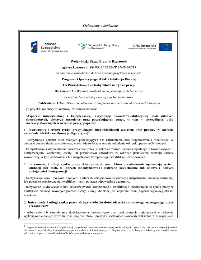 Ogłoszenie o konkursie Wojewódzki Urząd Pracy w Rzeszowie ogłasza konkurs nr POWR.01.02.02-IP.21-18-002/15 na składanie wniosków o dofinansowanie projektów w ramach Programu Operacyjnego Wiedza Edukacja Rozwój Oś Priorytetowa I – Osoby młode na rynku pracy Działanie 1.2 – Wsparcie osób młodych pozostających bez pracy na regionalnym rynku pracy – projekty konkursowe Poddziałanie 1.2.2 – Wsparcie udzielane z Inicjatywy na rzecz zatrudnienia ludzi młodych Typ projektu możliwy do realizacji w ramach naboru: Wsparcie indywidualnej i kompleksowej aktywizacji zawodowo-edukacyjnej osób młodych (bezrobotnych, biernych zawodowo oraz poszukujących pracy, w tym w szczególności osób niezarejestrowanych w urzędzie pracy) poprzez: 1. Instrumenty i usługi rynku pracy służące indywidualizacji wsparcia oraz pomocy w zakresie określenia ścieżki zawodowej (obligatoryjne)1: - identyfikacja potrzeb osób młodych pozostających bez zatrudnienia oraz diagnozowanie możliwości w zakresie doskonalenia zawodowego, w tym identyfikacja stopnia oddalenia od rynku pracy osób młodych, - kompleksowe i indywidualne pośrednictwo pracy w zakresie wyboru zawodu zgodnego z kwalifikacjami i kompetencjami wspieranej osoby lub poradnictwo zawodowe w zakresie planowania rozwoju kariery zawodowej, w tym podnoszenia lub uzupełniania kompetencji i kwalifikacji zawodowych. 2. Instrumenty i usługi rynku pracy skierowane do osób, które przedwcześnie opuszczają system edukacji lub osób, u których zidentyfikowano potrzebę uzupełnienia lub zdobycia nowych umiejętności i kompetencji: - kontynuacja nauki dla osób młodych, u których zdiagnozowano potrzebę uzupełnienia edukacji formalnej lub potrzebę potwierdzenia kwalifikacji m.in. poprzez odpowiednie egzaminy, - nabywanie, podwyższanie lub dostosowywanie kompetencji i kwalifikacji, niezbędnych na rynku pracy w kontekście zidentyfikowanych potrzeb osoby, której udzielane jest wsparcie, m.in. poprzez wysokiej jakości szkolenia. 3. Instrumenty i usługi rynku pracy służące zdobyciu doświadczenia zawodowego wymaganego przez pracodawców: - nabywanie lub uzupełnianie doświadczenia zawodowego oraz praktycznych umiejętności w zakresie wykonywania danego zawodu, m.in. poprzez staże i praktyki, spełniające standardy wskazane w Europejskich 1 Wsparcie indywidualnej i kompleksowej aktywizacji zawodowo-edukacyjnej osób młodych opierać się ma na co najmniej trzech elementach indywidualnej i kompleksowej pomocy (dwa z nich wskazane jako obligatoryjne, trzeci i kolejne – fakultatywne – wybierane w zależności od potrzeb i możliwości osób, którym udzielane jest wsparcie). Ramach Jakości Praktyk i Staży, - wsparcie zatrudnienia osoby młodej u przedsiębiorcy lub innego pracodawcy stanowiące zachętę do zatrudnienia, m.in. poprzez pokrycie kosztów subsydiowania zatrudnienia dla osób, u których zidentyfikowano adekwatność tej formy wsparcia, refundację wyposażenia lub doposażenia stanowiska pracy (wyłącznie w połączeniu z subsydiowanym zatrudnieniem). 4. Instrumenty i usługi rynku pracy służące wsparciu mobilności międzysektorowej i geograficznej (uwzględniając mobilność zawodową na europejskim rynku pracy za pośrednictwem sieci EURES): - wsparcie mobilności międzysektorowej dla osób, które mają trudności ze znalezieniem zatrudnienia w sektorze lub branży, m.in. poprzez zmianę lub uzupełnienie kompetencji lub kwalifikacji pozwalających na podjęcie zatrudnienia w innym sektorze, min. poprzez praktyki, staże i szkolenia, spełniające standardy wyznaczone dla tych usług (np. Europejskie i Polskie Ramy Jakości Praktyk i Staży), - wsparcie mobilności geograficznej dla osób młodych, u których zidentyfikowano problem z zatrudnieniem w miejscu zamieszkania, m.in. poprzez pokrycie kosztów dojazdu do pracy lub wstępnego zagospodarowania w nowym miejscu zamieszkania, m.in. poprzez finansowanie kosztów dojazdu, zapewnienie środków na zasiedlenie. 5. Instrumenty i usługi rynku pracy skierowane do osób niepełnosprawnych: - niwelowanie barier jakie napotykają osoby młode niepełnosprawne w zakresie zdobycia i utrzymania zatrudnienia, m.in. poprzez finansowanie pracy asystenta osoby niepełnosprawnej, którego praca spełnia standardy wyznaczone dla takiej usługi i doposażenie stanowiska pracy do potrzeb osób niepełnosprawnych. 6. Instrumenty i usługi rynku pracy służące rozwojowi przedsiębiorczości i samozatrudnienia: - wsparcie osób młodych w zakładaniu i prowadzeniu własnej działalności gospodarczej poprzez udzielenie pomocy bezzwrotnej (dotacji) na utworzenie przedsiębiorstwa oraz doradztwo i szkolenia umożliwiające uzyskanie wiedzy i umiejętności niezbędnych do podjęcia i prowadzenia działalności gospodarczej, a także wsparcie pomostowe. Na realizację projektów konkursowych dostępna jest kwota 21 531 550,00 PLN pochodząca z Europejskiego Funduszu Społecznego i budżetu państwa. Maksymalny poziom dofinansowania wynosi 95% wartości projektu (minimalny wkład własny beneficjenta powinien wynieść 5% wydatków kwalifikowalnych projektu). Konkurs jest współfinansowany ze środków specjalnej linii budżetowej Inicjatywa na rzecz zatrudnienia ludzi młodych. Wnioski o dofinansowanie projektów należy składać: - w formie dokumentu elektronicznego za pośrednictwem Systemu Obsługi Wniosków Aplikacyjnych Programu Operacyjnego Wiedza Edukacja Rozwój 2014-2020 dostępnego pod adresem https://www.sowa.efs.gov.pl oraz - w formie papierowej, wydrukowanej z systemu SOWA - osobiście, przesyłką kurierską lub pocztą w terminach: od 8 września 2015 r. do 16 września 2015 r. w godzinach pracy Urzędu od 730 do 1530 w siedzibie Wojewódzkiego Urzędu Pracy w Rzeszowie ul. płk L. Lisa - Kuli 20 35-025 Rzeszów Kancelaria WUP, pokój nr 1 Decyduje data wpływu papierowej wersji wniosku o dofinansowanie do Wojewódzkiego Urzędu Pracy w Rzeszowi