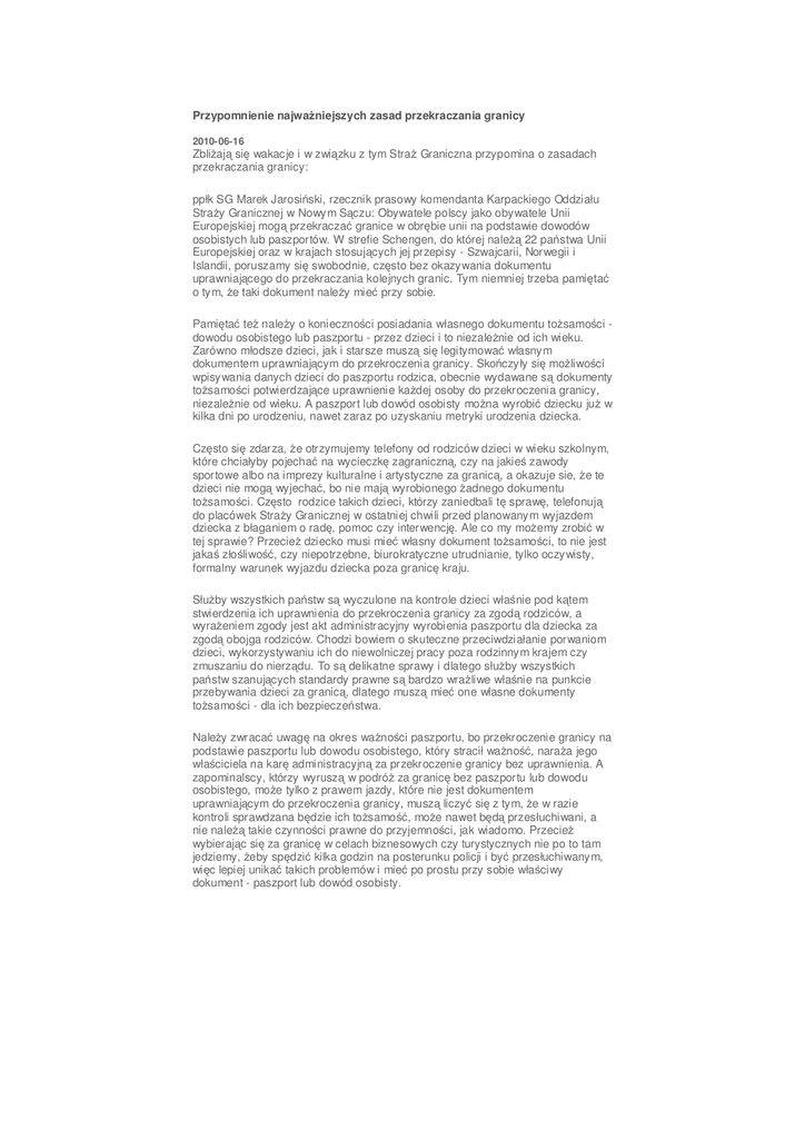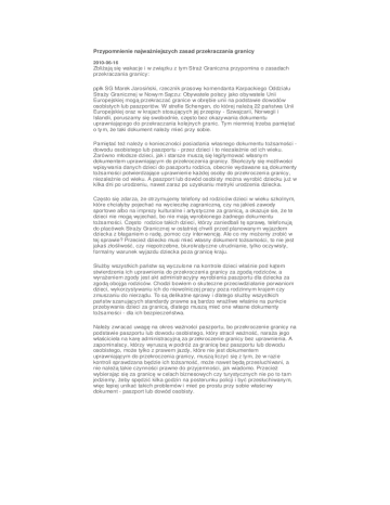 Przypomnienie najważniejszych zasad przekraczania granicy 2010-06-16 Zbliżają się wakacje i w związku z tym Straż Graniczna przypomina o zasadach przekraczania granicy: ppłk SG Marek Jarosiński, rzecznik prasowy komendanta Karpackiego Oddziału Straży Granicznej w Nowym Sączu: Obywatele polscy jako obywatele Unii Europejskiej mogą przekraczać granice w obrębie unii na podstawie dowodów osobistych lub paszportów. W strefie Schengen, do której należą 22 państwa Unii Europejskiej oraz w krajach stosujących jej przepisy - Szwajcarii, Norwegii i Islandii, poruszamy się swobodnie, często bez okazywania dokumentu uprawniającego do przekraczania kolejnych granic. Tym niemniej trzeba pamiętać o tym, że taki dokument należy mieć przy sobie. Pamiętać też należy o konieczności posiadania własnego dokumentu tożsamości dowodu osobistego lub paszportu - przez dzieci i to niezależnie od ich wieku. Zarówno młodsze dzieci, jak i starsze muszą się legitymować własnym dokumentem uprawniającym do przekroczenia granicy. Skończyły się możliwości wpisywania danych dzieci do paszportu rodzica, obecnie wydawane są dokumenty tożsamości potwierdzające uprawnienie każdej osoby do przekroczenia granicy, niezależnie od wieku. A paszport lub dowód osobisty można wyrobić dziecku już w kilka dni po urodzeniu, nawet zaraz po uzyskaniu metryki urodzenia dziecka. Często się zdarza, że otrzymujemy telefony od rodziców dzieci w wieku szkolnym, które chciałyby pojechać na wycieczkę zagraniczną, czy na jakieś zawody sportowe albo na imprezy kulturalne i artystyczne za granicą, a okazuje sie, że te dzieci nie mogą wyjechać, bo nie mają wyrobionego żadnego dokumentu tożsamości. Często rodzice takich dzieci, którzy zaniedbali tę sprawę, telefonują do placówek Straży Granicznej w ostatniej chwili przed planowanym wyjazdem dziecka z błaganiem o radę, pomoc czy interwencję. Ale co my możemy zrobić w tej sprawie? Przecież dziecko musi mieć własny dokument tożsamości, to nie jest jakaś złośliwość, czy niepotrzebne, biurokratyczne utrudnianie, tylko oczywisty, formalny warunek wyjazdu dziecka poza granicę kraju. Służby wszystkich państw są wyczulone na kontrole dzieci właśnie pod kątem stwierdzenia ich uprawnienia do przekroczenia granicy za zgodą rodziców, a wyrażeniem zgody jest akt administracyjny wyrobienia paszportu dla dziecka za zgodą obojga rodziców. Chodzi bowiem o skuteczne przeciwdziałanie porwaniom dzieci, wykorzystywaniu ich do niewolniczej pracy poza rodzinnym krajem czy zmuszaniu do nierządu. To są delikatne sprawy i dlatego służby wszystkich państw szanujących standardy prawne są bardzo wrażliwe właśnie na punkcie przebywania dzieci za granicą, dlatego muszą mieć one własne dokumenty tożsamości - dla ich bezpieczeństwa. Należy zwracać uwagę na okres ważności paszportu, bo przekroczenie granicy na podstawie paszportu lub dowodu osobistego, który stracił ważność, naraża jego właściciela na karę administracyjną za przekroczenie granicy bez uprawnienia. A zapominalscy, którzy wyruszą w podróż za granicę bez paszportu lub dowodu osobistego, może tylko z prawem jazdy, które nie jest dokumentem uprawniającym do przekroczenia granicy, muszą liczyć się z tym, że w razie kontroli sprawdzana będzie ich tożsamość, może nawet będą przesłuchiwani, a nie należą takie czynności prawne do przyjemności, jak wiadomo. Przecież wybierając się za granicę w celach biznesowych czy turystycznych nie po to tam jedziemy, żeby spędzić kilka godzin na posterunku policji i być przesłuchiwanym, więc lepiej unikać takich problemów i mieć po prostu przy sobie właściwy dokument - paszport lub dowód osobisty.