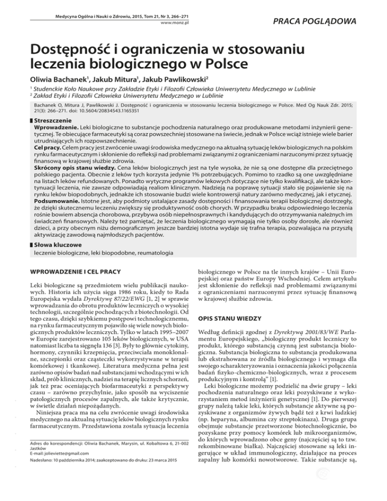 Medycyna Ogólna i Nauki o Zdrowiu, 2015, Tom 21, Nr 3, 266–271 www.monz.pl PRACA POGLĄDOWA Dostępność i ograniczenia w stosowaniu leczenia biologicznego w Polsce Oliwia Bachanek1, Jakub Mitura1, Jakub Pawlikowski2 1 2 Studenckie Koło Naukowe przy Zakładzie Etyki i Filozofii Człowieka Uniwersytetu Medycznego w Lublinie Zakład Etyki i Filozofii Człowieka Uniwersytetu Medycznego w Lublinie Bachanek O, Mitura J, Pawlikowski J. Dostępność i ograniczenia w stosowaniu leczenia biologicznego w Polsce. Med Og Nauk Zdr. 2015; 21(3): 266–271. doi: 10.5604/20834543.1165351 Streszczenie Wprowadzenie. Leki biologiczne to substancje pochodzenia naturalnego oraz produkowane metodami inżynierii genetycznej. Te obiecujące farmaceutyki są coraz powszechniej stosowane na świecie, jednak w Polsce wciąż istnieje wiele barier utrudniających ich rozpowszechnienie. Cel pracy. Celem pracy jest zwrócenie uwagi środowiska medycznego na aktualną sytuację leków biologicznych na polskim rynku farmaceutycznym i skłonienie do refleksji nad problemami związanymi z ograniczeniami narzuconymi przez sytuację finansową w krajowej służbie zdrowia. Skrócony opis stanu wiedzy. Cena leków biologicznych jest na tyle wysoka, że nie są one dostępne dla przeciętnego polskiego pacjenta. Obecnie z leków tych korzysta jedynie 1% potrzebujących. Pomimo to rzadko są one uwzględniane na listach leków refundowanych. Ponadto wytyczne programów lekowych dotyczące nie tylko kwalifikacji, ale także kontynuacji leczenia, nie zawsze odpowiadają realiom klinicznym. Nadzieją na poprawę sytuacji stało się pojawienie się na rynku leków biopodobnych, jednakże ich stosowanie budzi wiele kontrowersji natury zarówno medycznej, jak i etycznej. Podsumowanie. Istotne jest, aby podmioty ustalające zasady dostępności i finansowania terapii biologicznej dostrzegły, że dzięki skutecznemu leczeniu zwiększy się produktywność osób chorych. W przypadku braku odpowiedniego leczenia rośnie bowiem absencja chorobowa, przybywa osób niepełnosprawnych i kandydujących do otrzymywania należnych im świadczeń finansowych. Należy też pamiętać, że leczenia biologicznego wymagają nie tylko osoby dorosłe, ale również dzieci, a przy obecnym niżu demograficznym jeszcze bardziej istotna wydaje się trafna terapia, pozwalająca na przyszłą aktywizację zawodową najmłodszych pacjentów. Słowa kluczowe leczenie biologiczne, leki biopodobne, reumatologia Leki biologiczne są przedmiotem wielu publikacji naukowych. Historia ich użycia sięga 1986 roku, kiedy to Rada Europejska wydała Dyrektywę 87/22/EWG [1, 2] w sprawie wprowadzania do obrotu produktów leczniczych o wysokiej technologii, szczególnie pochodzących z biotechnologii. Od tego czasu, dzięki szybkiemu postępowi technologicznemu, na rynku farmaceutycznym pojawiło się wiele nowych biologicznych produktów leczniczych. Tylko w latach 1995–2007 w Europie zarejestrowano 105 leków biologicznych, w USA natomiast liczba ta sięgnęła 136 [3]. Były to głównie cytokiny, hormony, czynniki krzepnięcia, przeciwciała monoklonalne, szczepionki oraz cząsteczki wykorzystywane w terapii komórkowej i tkankowej. Literatura medyczna pełna jest zarówno opisów badań nad substancjami wchodzącymi w ich skład, prób klinicznych, nadziei na terapię licznych schorzeń, jak też prac oceniających biofarmaceutyki z perspektywy czasu – zarówno przychylnie, jako sposób na wyciszenie patologicznych procesów zapalnych, ale także krytycznie, w świetle działań niepożądanych. Niniejsza praca ma na celu zwrócenie uwagi środowiska medycznego na aktualną sytuację leków biologicznych rynku farmaceutycznym. Przedstawiona została sytuacja leczenia - - - - WPROWADZENIE I CEL PRACY Adres do korespondencji: Oliwia Bachanek, Marysin, ul. Kobaltowa 6, 21-002 Jastków E-mail: [email protected] - Nadesłano: 10 października 2014; zaakceptowano do druku: 23 marca 2015 biologicznego w Polsce na tle innych krajów – Unii Europejskiej oraz państw Europy Wschodniej. Celem artykułu jest skłonienie do refleksji nad problemami związanymi z ograniczeniami narzuconymi przez sytuację finansową w krajowej służbie zdrowia. OPIS STANU WIEDZY Według definicji zgodnej z Dyrektywą 2001/83/WE Parlamentu Europejskiego, „biologiczny produkt leczniczy to produkt, którego substancją czynną jest substancja biologiczna. Substancja biologiczna to substancja produkowana lub ekstrahowana ze źródła biologicznego i wymaga dla swojego scharakteryzowania i oznaczenia jakości połączenia badań fizyko-chemiczno-biologicznych, wraz z procesem produkcyjnym i kontrolą” [1]. Leki biologiczne możemy podzielić na dwie grupy – leki pochodzenia naturalnego oraz leki pozyskiwane z wykorzystaniem metod inżynierii genetycznej [1]. Do pierwszej grupy należą takie leki, których substancje aktywne są pozyskiwane z organizmów żywych bądź też z krwi ludzkiej (np. heparyna, albumina czy streptokinaza). Druga grupa obejmuje substancje przetworzone biotechnologicznie, bo pozyskane przy pomocy komórek lub mikroorganizmów, do których wprowadzono obce geny (najczęściej są to tzw. rekombinowane białka). Najczęściej stosowane są leki ingerujące w układ immunologiczny, działające na proces zapalny lub komórki nowotworowe. Takie substancje są, - - - - - Medycyna Ogólna i Nauki o Zdrowiu, 2015, Tom 21, Nr 3 Oliwia Bachanek, Jakub Mitura, Jakub Pawlikowski. Dostępność i ograniczenia w stosowaniu leczenia biologicznego w Polsce w uproszczeniu, celowanymi lekami przeciwzapalnymi, ponieważ w określony sposób oddziałują na różne etapy procesu zapalnego. Leki biologiczne różnią się od tradycyjnych farmaceutyków budową oraz procesem wytwarzania. Są to bowiem białka wytwarzane przez żywe komórki. Muszą więc zawsze być podawane parenteralnie, gdyż ulegają trawieniu w przewodzie pokarmowym człowieka. Produkcja takich leków po