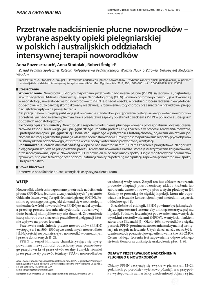 PRACA ORYGINALNA Medycyna Ogólna i Nauki o Zdrowiu, 2015, Tom 21, Nr 3, 303–306 www.monz.pl Przetrwałe nadciśnienie płucne noworodków – wybrane aspekty opieki pielęgniarskiej w polskich i australijskichoddziałach intensywnej terapii noworodków Anna Rozensztrauch1, Anna Stodolak1, Robert Śmigiel1 Zakład Pediatrii Społecznej, Katedra Pielęgniarstwa Pediatrycznego, Wydział Nauk o Zdrowiu, Uniwersytet Medyczny, Wrocław 1 Rozensztrauch A, Stodolak A, Śmigiel R. Przetrwałe nadciśnienie płucne noworodków – wybrane aspekty opieki pielęgniarskiej w polskich i australijskich oddziałach intensywnej terapii noworodków. Med Og Nauk Zdr. 2015; 21(3): 303–306. doi: 10.5604/20834543.1165357 Streszczenie Wprowadzenie. Noworodki, u których rozpoznano przetrwałe nadciśnienie płucne (PPHN), są jednymi z „najtrudniej‑ szych” pacjentów Oddziału Intensywnej Terapii Neonatologicznej (OITN). Pomimo ogromnego rozwoju, jaki dokonał się w neonatologii, umieralność wśród noworodków z PPHN jest nadal wysoka, a przebieg procesu leczenia niewydolności oddechowej – dużo bardziej skomplikowany niż dawniej. Zrozumienie istoty choroby oraz znaczenia prawidłowej pielęg‑ nacji istotnie wpływa na proces leczenia. Cel pracy. Celem niniejszej publikacji jest omówienie standardów postępowania pielęgniarskiego wobec noworodków z przetrwałym nadciśnieniem płucnym. Praca przedstawia aspekty opieki nad dzieckiem z PPHN w polskich i australijskich oddziałach neonatologicznych. Skrócony opis stanu wiedzy. Noworodek z zespołem nadciśnienia płucnego wymaga profesjonalizmu i doświadczenia, zarówno zespołu lekarskiego, jak i pielęgniarskiego. Ponadto podkreśla się znaczenie w procesie zdrowienia rozważnej i profesjonalnej opieki pielęgniarskiej. Ocena stanu ogólnego w połączeniu z historią choroby, objawami klinicznymi, po‑ ziomem saturacji i gazometrią pomaga właściwie ocenić stan dziecka. Umiejętność rozpoznawania niepokojących objawów ze strony układu oddechowego jest istotna w celu oceny skuteczności prowadzonej wentylacji. Podsumowanie. Zasada minimal handling w opiece nad noworodkiem z PPHN ma znaczenie priorytetowe. Nadgorliwa pielęgnacja nie wpływa na przyśpieszenie procesu zdrowienia noworodka. Bardzo istotne jest utrzymywanie zorganizowanej oraz skoordynowanej opieki. Noworodek z PPHN powinien mieć zapewniony spokój. Ciągłe monitorowanie parametrów życiowych, ciśnienia tętniczego oraz poziomu saturacji zmniejsza potrzebę manipulacji, zapewniając noworodkowi spokój i bezpieczeństwo. Słowa kluczowe przetrwałe nadciśnienie płucne, wentylacja oscylacyjna, tlenek azotu Noworodki, u których rozpoznano przetrwałe nadciśnienie płucne (PPHN), są jednymi z „najtrudniejszych” pacjentów Oddziału Intensywnej Terapii Neonatologicznej (OITN). Po‑ mimo ogromnego postępu, jaki dokonał się w neonatologii, umieralność wśród noworodków z PPHN jest nadal wysoka, a przebieg procesu leczenia niewydolności oddechowej – dużo bardziej skomplikowany niż dawniej. Zrozumienie istoty choroby oraz znaczenia prawidłowej pielęgnacji istot‑ nie wpływa na proces leczenia. Przetrwałe nadciśnienie płucne noworodków (PPHN) występuje u 1 na 500–1500 żywo urodzonych noworodków [1]. Najczęściej rozpoznaje się je u noworodków donoszonych i prawie donoszonych [1, 2]. PPHN to zespół kliniczny charakteryzujący się wystę‑ powaniem niewydolności oddechowej oraz prawo‑lewe‑ go przepływu krwi przez otwór owalny i zwykle również przez przetrwały przewód tętniczy (PDA) u noworodka bez - - - - WSTĘP Adres do korespondencji: Anna Rozensztrauch: Katedra Pielęgniarstwa Pediatrycz‑ nego, Wydział Nauk o Zdrowiu, Uniwersytet Medyczny we Wrocławiu, ul. Bartla 5, 51‑618 Wrocław, Tel.: 503 585 939 E-mail:[email protected] - Nadesłano: 26 kwietnia 2014; zaakceptowano do druku: 2 kwietnia 2015 wrodzonej wady serca. Zespół ten jest efektem zaburzenia procesów adaptacji pourodzeniowej układu krążenia lub zaburzenia wzrostu i rozwoju płuc w życiu płodowym [3]. Zmiany te prowadzą do ciężkiej hipoksji, która nie odpo‑ wiada na leczenie konwencjonalnymi metodami wsparcia oddechowego [4]. Niezależnie od etiologii, PPHN powinno być jak najszyb‑ ciej zdiagnozowane i leczone, aby uniknąć towarzyszącej mu hipoksji. Podstawą leczenia jest podawanie tlenu, wentylacja wysokimi częstotliwościami (HFOV), wentylacja tlenkiem azotu oraz Sildenafil [5]. Około 40% noworodków z ciężką postacią PPHN pomimo zastosowania maksymalnej wenty‑ lacji nie reaguje na leczenie. U tych dzieci należy rozważyć le‑ czenie metodą pozaustrojowego utlenowania krwi (ECMO). Celem takiego leczenia jest zapewnienie odpowiedniego stężenia tlenu oraz uniknięcie uszkodzenia płuc [4, 6]. OBJAWY PRZETRWAŁEGO NADCIŚNIENIA PŁUCNEGO U NOWORODKÓW Objawy PPHN zaczynają się zwykle w pierwszych 12–24 godzinach po porodzie (wyjątkowo później), a w przypad‑ ku występowania zamartwicy urodzeniowej objawy są już 304 Medycyna Ogólna i Nauki o Zdrowiu, 2015, Tom 21, Nr 3 Anna Rozensztrauch, Anna Stodolak, Robert Śmigiel. Przetrwałe nadciśnienie płucne noworodków – wybrane aspekty opieki pielęgniarskiej w polskich i australijskich… w pierwszych 4–6 godzinach. Noworodek wykazuje znacznie przyspieszony oddech i sinicę, słabo reagującą na tlenote‑ rapię. Dziecko uruchamia dodatkowe mięśnie oddechowe, słychać postękiwania w czasie oddychania. Zmniejszenie przepływu krwi przez płuca doprowadza do hipoksemii, ciśnienie parcjalne tlenu we krwi pobranej z tętnicy pro‑ mieniowej przewyższa PaO2 z krwi zaprzewodowej o 10–20 mmHg, a saturacja mierzona pulsoksymetrem z prawej kończyny górnej przewyższa o co najmniej 5% saturację mierzoną na stopie [7]. Znajomość tych objawów przez opiekujący się dzieckiem zespół pielęgniarski może istotnie wpłynąć na proces lecze‑ ni