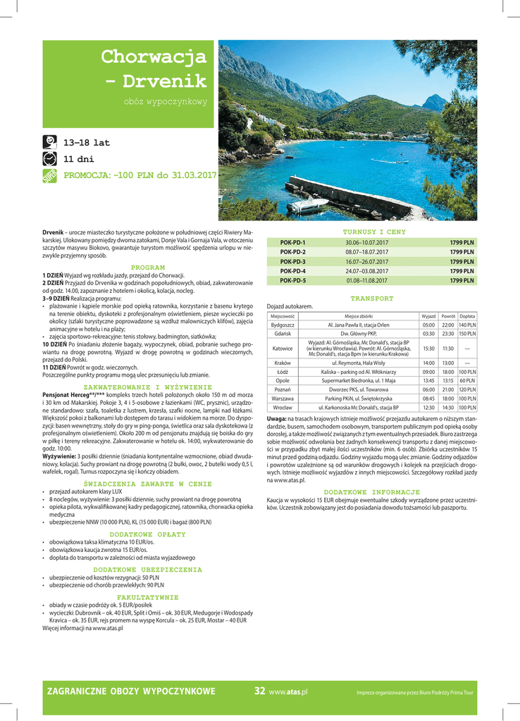 Chorwacja - Drvenik obóz wypoczynkowy 13–18 lat 11 dni PROMOCJA: -100 PLN do 31.03.2017 TURNUSY I CENY Drvenik – urocze miasteczko turystyczne położone w południowej części Riwiery Makarskiej. Ulokowany pomiędzy dwoma zatokami, Donje Vala i Gornaja Vala, w otoczeniu szczytów masywu Biokovo, gwarantuje turystom możliwość spędzenia urlopu w niezwykle przyjemny sposób. POK-PD-1 POK-PD-2 POK-PD-3 POK-PD-4 POK-PD-5 PROGRAM 1 DZIEŃ Wyjazd wg rozkładu jazdy, przejazd do Chorwacji. 2 DZIEŃ Przyjazd do Drvenika w godzinach popołudniowych, obiad, zakwaterowanie od godz. 14.00, zapoznanie z hotelem i okolicą, kolacja, nocleg. 3–9 DZIEŃ Realizacja programu: • plażowanie i kąpiele morskie pod opieką ratownika, korzystanie z basenu krytego na terenie obiektu, dyskoteki z profesjonalnym oświetleniem, piesze wycieczki po okolicy (szlaki turystyczne poprowadzone są wzdłuż malowniczych klifów), zajęcia animacyjne w hotelu i na plaży; • zajęcia sportowo-rekreacyjne: tenis stołowy, badmington, siatkówka; 10 DZIEŃ Po śniadaniu złożenie bagaży, wypoczynek, obiad, pobranie suchego prowiantu na drogę powrotną. Wyjazd w drogę powrotną w godzinach wieczornych, przejazd do Polski. 11 DZIEŃ Powrót w godz. wieczornych. Poszczególne punkty programu mogą ulec przesunięciu lub zmianie. 30.06–10.07.2017 08.07–18.07.2017 16.07–26.07.2017 24.07–03.08.2017 01.08–11.08.2017 1799 PLN 1799 PLN 1799 PLN 1799 PLN 1799 PLN TRANSPORT Dojazd autokarem. ZAKWATEROWANIE I WYŻYWIENIE Pensjonat Herceg**/*** kompleks trzech hoteli położonych około 150 m od morza i 30 km od Makarskiej. Pokoje 3, 4 i 5-osobowe z łazienkami (WC, prysznic), urządzone standardowo: szafa, toaletka z lustrem, krzesła, szafki nocne, lampki nad łóżkami. Większość pokoi z balkonami lub dostępem do tarasu i widokiem na morze. Do dyspozycji: basen wewnętrzny, stoły do gry w ping-ponga, świetlica oraz sala dyskotekowa (z profesjonalnym oświetleniem). Około 200 m od pensjonatu znajdują się boiska do gry w piłkę i tereny rekreacyjne. Zakwaterowanie w hotelu ok. 14:00, wykwaterowanie do godz. 10:00. Wyżywienie: 3 posiłki dziennie (śniadania kontynentalne wzmocnione, obiad dwudaniowy, kolacja). Suchy prowiant na drogę powrotną (2 bułki, owoc, 2 butelki wody 0,5 l, wafelek, rogal). Turnus rozpoczyna się i kończy obiadem. Miejscowość Miejsce zbiórki Wyjazd Powrót Dopłata Bydgoszcz Al. Jana Pawła II, stacja Orlen 05:00 22:00 140 PLN Gdańsk Dw. Główny PKP, 03:30 23:30 150 PLN Katowice Wyjazd: Al. Górnośląska, Mc Donald's, stacja BP (w kierunku Wrocławia). Powrót: Al. Górnośląska, Mc Donald's, stacja Bpm (w kierunku Krakowa) 15:30 11:30 — — Kraków ul. Reymonta, Hala Wisły 14:00 13:00 Łódź Kaliska – parking od Al. Włókniarzy 09:00 18:00 100 PLN Opole Supermarket Biedronka, ul. 1 Maja 13:45 13:15 Poznań Dworzec PKS, ul. Towarowa 06:00 21:00 120 PLN Warszawa Parking PKiN, ul. Świętokrzyska 08:45 18:00 100 PLN Wrocław ul. Karkonoska Mc Donald's, stacja BP 12:30 14:30 100 PLN 60 PLN Uwaga: na trasach krajowych istnieje możliwość przejazdu autokarem o niższym standardzie, busem, samochodem osobowym, transportem publicznym pod opieką osoby dorosłej, a także możliwość związanych z tym ewentualnych przesiadek. Biuro zastrzega sobie możliwość odwołania bez żadnych konsekwencji transportu z danej miejscowości w przypadku zbyt małej ilości uczestników (min. 6 osób). Zbiórka uczestników 15 minut przed godziną odjazdu. Godziny wyjazdu mogą ulec zmianie. Godziny odjazdów i powrotów uzależnione są od warunków drogowych i kolejek na przejściach drogowych. Istnieje możliwość wyjazdów z innych miejscowości. Szczegółowy rozkład jazdy na www.atas.pl. ŚWIADCZENIA ZAWARTE W CENIE DODATKOWE INFORMACJE • przejazd autokarem klasy LUX • 8 noclegów, wyżywienie: 3 posiłki dziennie, suchy prowiant na drogę powrotną • opieka pilota, wykwalifikowanej kadry pedagogicznej, ratownika, chorwacka opieka medyczna • ubezpieczenie NNW (10 000 PLN), KL (15 000 EUR) i bagaż (800 PLN) Kaucja w wysokości 15 EUR obejmuje ewentualne szkody wyrządzone przez uczestników. Uczestnik zobowiązany jest do posiadania dowodu tożsamości lub paszportu. DODATKOWE OPŁATY • obowiązkowa taksa klimatyczna 10 EUR/os. • obowiązkowa kaucja zwrotna 15 EUR/os. • dopłata do transportu w zależności od miasta wyjazdowego DODATKOWE UBEZPIECZENIA • ubezpieczenie od kosztów rezygnacji: 50 PLN • ubezpieczenie od chorób przewlekłych: 90 PLN FAKULTATYWNIE • obiady w czasie podróży ok. 5 EUR/posiłek • wycieczki: Dubrovnik – ok. 40 EUR, Split i Omiś – ok. 30 EUR, Medugorje i Wodospady Kravica – ok. 35 EUR, rejs promem na wyspę Korcula – ok. 25 EUR, Mostar – 40 EUR Więcej informacji na www.atas.pl ZAGRANICZNE OBOZY WYPOCZYNKOWE 32 www.atas.pl Impreza organizowana przez Biuro Podróży Prima Tour