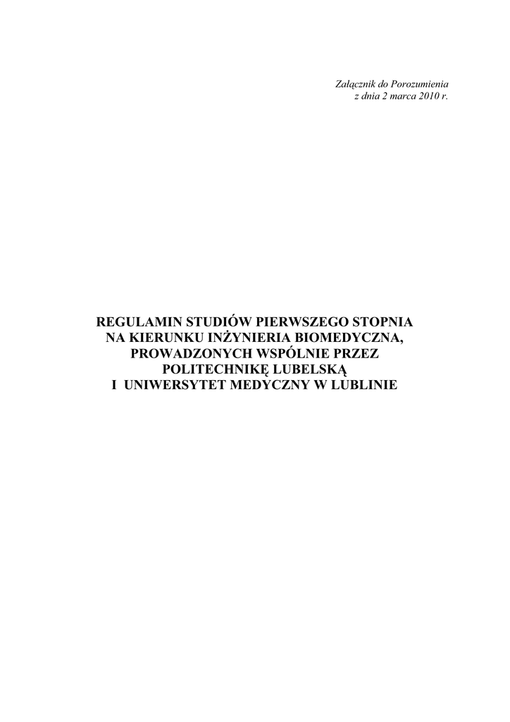 Zaáącznik do Porozumienia z dnia 2 marca 2010 r. REGULAMIN STUDIÓW PIERWSZEGO STOPNIA NA KIERUNKU INĩYNIERIA BIOMEDYCZNA, PROWADZONYCH WSPÓLNIE PRZEZ POLITECHNIKĉ LUBELSKĄ I UNIWERSYTET MEDYCZNY W LUBLINIE I. PRZEPISY OGÓLNE § 1. Przepisy niniejszego Regulaminu mają zastosowanie do studiów pierwszego stopnia kierunku inĪynieria biomedyczna, prowadzonych wspólnie przez PolitechnikĊ Lubelską i Uniwersytet Medyczny w Lublinie, w formie studiów stacjonarnych i niestacjonarnych. § 2. Prawa i obowiązki studenta okreĞla Ustawa z dnia 27 lipca 2005 r. Prawo o szkolnictwie wyĪszym, rozporządzenia wykonawcze do ustawy, postanowienia niniejszego Regulaminu i Regulaminu studiów obowiązujących w Politechnice Lubelskiej, stanowiącego zaáącznik do Uchwaáy Nr 14/2009/III Senatu PL z dnia 30 kwietnia 2009 r., o ile nie są sprzeczne z zapisami niniejszego Regulaminu. § 3. 1. Studia na kierunku inĪynieria biomedyczna prowadzone są wspólnie przez Wydziaá Mechaniczny Politechniki Lubelskiej oraz I Wydziaá Lekarski z Oddziaáem Stomatologicznym Uniwersytetu Medycznego w Lublinie, na podstawie porozumienia zawartego przez obie Uczelnie. 2. Wydziaá Mechaniczny Politechniki Lubelskiej jest jednostką wiodącą dla kierunku studiów inĪynieria biomedyczna pod wzglĊdem organizacji studiów, dokumentacji ich przebiegu, pomocy materialnej dla studentów i innych spraw związanych z tokiem studiów. § 4. 1. Studia niestacjonarne są studiami odpáatnymi na zasadach okreĞlonych w Uchwale Senatu Politechniki Lubelskiej w sprawie szczegóáowych zasad pobierania opáat za Ğwiadczone usáugi edukacyjne. 2. Warunki odpáatnoĞci za studia okreĞla umowa zawarta miĊdzy Politechniką Lubelską a studentem. § 5. Studia na kierunku inĪynieria biomedyczna prowadzone są na podstawie planów studiów i programów nauczania uchwalanych przez RadĊ Wydziaáu Mechanicznego Politechniki Lubelskiej i RadĊ I Wydziaáu Lekarskiego z Oddziaáem Stomatologicznym Uniwersytetu Medycznego w Lublinie. II. PRAWA I OBOWIĄZKI STUDENTÓW § 6. 1. W trakcie odbywania studiów student obowiązany jest w szczególnoĞci do: 1) przestrzegania przepisów obowiązujących w Politechnice Lubelskiej; 2) uczestniczenia w zajĊciach dydaktycznych i organizacyjnych, skáadania egzaminów, odbywania praktyk oraz speániania innych wymogów okreĞlonych w planie studiów i programie nauczania; 3) przestrzegania dobrych obyczajów wspólnoty akademickiej; 4) dbania o godnoĞü studenta i dobre imiĊ obu Uczelni; 5) terminowego wnoszenia opáat na rzecz Politechniki Lubelskiej zgodnie z odrĊbnymi przepisami; 6) zapoznawania siĊ z zarządzeniami, poleceniami i informacjami ogáaszanymi przez dziekana wydziaáu wiodącego i wáaĞciwego na nie reagowania. 2. Student obowiązany jest ponadto: 1) do przestrzegania przepisów obowiązujących w Uniwersytecie Medycznym w Lublinie, dotyczących uczestnictwa w zajĊciach dydaktycznych prowadzonych na terenie tej Uczelni i szpitali klinicznych; 2) przed rozpoczĊciem praktycznej nauki zawodu (zajĊü praktycznych, praktyk zawodowych lub zajĊü klinicznych), jednak nie póĨniej niĪ do 30 paĨdziernika danego roku akademickiego wykonaü: badania lekarskie i laboratoryjne dla celów sanitarno-epidemiologicznych, szczepienie przeciw WZW typu B. § 7. 1. Student ma prawo do: 1) studiowania wedáug indywidualnego planu studiów i programu nauczania; 2) studiowania wedáug indywidualnej organizacji toku studiów; 3) zgáaszania do dziekana wydziaáu wiodącego postulatów dotyczących planów studiów, programów nauczania, toku studiów, procesu nauczania i wychowania, warunków socjalno-bytowych oraz wszystkich innych spraw Ğrodowiska akademickiego; 4) otrzymywania nagród i wyróĪnieĔ za dobre wyniki i osiągniĊcia w nauce; 5) prowadzenia dziaáalnoĞci samorządowej i spoáecznej; 6) zrzeszania siĊ w koáach lub sekcjach naukowych oraz uczestniczenia w badaniach naukowych prowadzonych w obu Uczelniach; 7) zrzeszania siĊ w organizacjach spoáecznych i politycznych na zasadach okreĞlonych w odrĊbnych przepisach; 8) zrzeszania siĊ w organizacjach kulturalnych, sportowych i turystycznych; 9) wyraĪania opinii o prowadzonych zajĊciach i innych obowiązkach dydaktycznych poprzez: wypowiedzi przedstawicieli studentów w organach kolegialnych, udziaá w ankietach, udziaá w konkursach, itp. organizowanych przez obie Uczelnie. 2. Dla realizacji prawa do nauki oraz praw wyszczególnionych w ust. l student moĪe korzystaü z pomieszczeĔ, urządzeĔ i innych Ğrodków materialnych obu Uczelni oraz pomocy ze strony nauczycieli akademickich i organów Uczelni na zasadach okreĞlonych przez obowiązujące przepisy. § 8. 1. Studenci i rodziny studenckie (niepracujący wspóámaáĪonkowie oraz dzieci) mają prawo do: 1) opieki lekarskiej i ochrony zdrowia, na zasadach okreĞlonych w przepisach prawa; 2) pomocy materialnej, jeĪeli speániają warunki okreĞlone w odrĊbnych przepisach. 2. Studentom na kierunku inĪynieria biomedyczna pomoc materialna przyznawana jest wedáug zasad i na warunkach okreĞlonych w stosownym Regulaminie wydanym przez PolitechnikĊ Lubelską. § 9. Student moĪe ubiegaü siĊ o przeniesienie ze studiów stacjonarnych na studia niestacjonarne, a takĪe odwrotnie na warunkach okreĞlonych przez dziekana wydziaáu wiodącego. § 10. 1. Dziekan wydziaáu wiodącego powoáuje spoĞród nauczycieli akademickich opiekuna lat studiów. 2. Reprezentantem grupy studenckiej wobec wáadz i pracowników Uczelni jest starosta grupy, zaĞ roku – starosta roku. Ich zadania wynikają z Regulaminu Samorządu Studenckiego Politechniki Lubelskiej. § 11. Zasady odpowiedzialnoĞci dyscyplinarnej studentów oraz tryb postĊpowania dyscyplinarnego okreĞlają odrĊbne przepisy, a postĊpowanie to prowadzi Politechnika Lubelska. § 12. Student obowiązany jest powiadomiü niezwáocznie dziekana wydziaáu wiodącego w formie pisemnej o zmianie kierunku studiów, rezygna