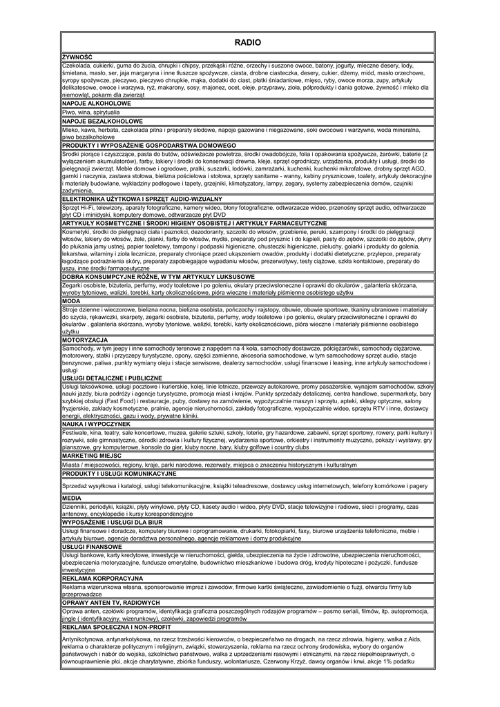 RADIO ŻYWNOŚĆ Czekolada, cukierki, guma do żucia, chrupki i chipsy, przekąski różne, orzechy i suszone owoce, batony, jogurty, mleczne desery, lody, śmietana, masło, ser, jaja margaryna i inne tłuszcze spożywcze, ciasta, drobne ciasteczka, desery, cukier, dżemy, miód, masło orzechowe, syropy spożywcze, pieczywo, pieczywo chrupkie, mąka, dodatki do ciast, płatki śniadaniowe, mięso, ryby, owoce morza, zupy, artykuły delikatesowe, owoce i warzywa, ryż, makarony, sosy, majonez, ocet, oleje, przyprawy, zioła, półprodukty i dania gotowe, żywność i mleko dla niemowląt, pokarm dla zwierząt NAPOJE ALKOHOLOWE Piwo, wina, spirytualia NAPOJE BEZALKOHOLOWE Mleko, kawa, herbata, czekolada pitna i preparaty słodowe, napoje gazowane i niegazowane, soki owocowe i warzywne, woda mineralna, piwo bezalkoholowe PRODUKTY I WYPOSAŻENIE GOSPODARSTWA DOMOWEGO Środki piorące i czyszczące, pasta do butów, odświeżacze powietrza, środki owadobójcze, folia i opakowania spożywcze, żarówki, baterie (z wyłączeniem akumulatorów), farby, lakiery i środki do konserwacji drewna, kleje, sprzęt ogrodniczy, urządzenia, produkty i usługi, środki do pielęgnacji zwierząt. Meble domowe i ogrodowe, pralki, suszarki, lodówki, zamrażarki, kuchenki, kuchenki mikrofalowe, drobny sprzęt AGD, garnki i naczynia, zastawa stołowa, bielizna pościelowa i stołowa, sprzęty sanitarne - wanny, kabiny prysznicowe, toalety, artykuły dekoracyjne i materiały budowlane, wykładziny podłogowe i tapety, grzejniki, klimatyzatory, lampy, zegary, systemy zabezpieczenia domów, czujniki zadymienia, ELEKTRONIKA UŻYTKOWA I SPRZĘT AUDIO-WIZUALNY Sprzęt Hi-Fi, telewizory, aparaty fotograficzne, kamery wideo, błony fotograficzne, odtwarzacze wideo, przenośny sprzęt audio, odtwarzacze płyt CD i minidyski, komputery domowe, odtwarzacze płyt DVD ARTYKUŁY KOSMETYCZNE I ŚRODKI HIGIENY OSOBISTEJ I ARTYKUŁY FARMACEUTYCZNE Kosmetyki, środki do pielęgnacji ciała i paznokci, dezodoranty, szczotki do włosów, grzebienie, peruki, szampony i środki do pielęgnacji włosów, lakiery do włosów, żele, pianki, farby do włosów, mydła, preparaty pod prysznic i do kąpieli, pasty do zębów, szczotki do zębów, płyny do płukania jamy ustnej, papier toaletowy, tampony i podpaski higieniczne, chusteczki higieniczne, pieluchy, golarki i produkty do golenia, lekarstwa, witaminy i zioła lecznicze, preparaty chroniące przed ukąszeniem owadów, produkty i dodatki dietetyczne, przylepce, preparaty łagodzące podrażnienia skóry, preparaty zapobiegające wypadaniu włosów, prezerwatywy, testy ciążowe, szkła kontaktowe, preparaty do uszu, inne środki farmaceutyczne DOBRA KONSUMPCYJNE RÓŻNE, W TYM ARTYKUŁY LUKSUSOWE Zegarki osobiste, biżuteria, perfumy, wody toaletowe i po goleniu, okulary przeciwsłoneczne i oprawki do okularów , galanteria skórzana, wyroby tytoniowe, walizki, torebki, karty okolicznościowe, pióra wieczne i materiały piśmienne osobistego użytku MODA Stroje dzienne i wieczorowe, bielizna nocna, bielizna osobista, pończochy i rajstopy, obuwie, obuwie sportowe, tkaniny ubraniowe i materiały do szycia, rękawiczki, skarpety, zegarki osobiste, biżuteria, perfumy, wody toaletowe i po goleniu, okulary przeciwsłoneczne i oprawki do okularów , galanteria skórzana, wyroby tytoniowe, walizki, torebki, karty okolicznościowe, pióra wieczne i materiały piśmienne osobistego użytku MOTORYZACJA Samochody, w tym jeepy i inne samochody terenowe z napędem na 4 koła, samochody dostawcze, półciężarówki, samochody ciężarowe, motorowery, statki i przyczepy turystyczne, opony, części zamienne, akcesoria samochodowe, w tym samochodowy sprzęt audio, stacje benzynowe, paliwa, punkty wymiany oleju i stacje serwisowe, dealerzy samochodów, usługi finansowe i leasing, inne artykuły samochodowe i usługi USŁUGI DETALICZNE I PUBLICZNE Usługi taksówkowe, usługi pocztowe i kurierskie, kolej, linie lotnicze, przewozy autokarowe, promy pasażerskie, wynajem samochodów, szkoły nauki jazdy, biura podróży i agencje turystyczne, promocja miast i krajów. Punkty sprzedaży detalicznej, centra handlowe, supermarkety, bary szybkiej obsługi (Fast Food) i restauracje, puby, dostawy na zamówienie, wypożyczalnie maszyn i sprzętu, apteki, sklepy optyczne, salony fryzjerskie, zakłady kosmetyczne, pralnie, agencje nieruchomości, zakłady fotograficzne, wypożyczalnie wideo, sprzętu RTV i inne, dostawcy energii, elektryczności, gazu i wody, prywatne kliniki. NAUKA I WYPOCZYNEK Festiwale, kina, teatry, sale koncertowe, muzea, galerie sztuki, szkoły, loterie, gry hazardowe, zabawki, sprzęt sportowy, rowery, parki kultury i rozrywki, sale gimnastyczne, ośrodki zdrowia i kultury fizycznej, wydarzenia sportowe, orkiestry i instrumenty muzyczne, pokazy i wystawy, gry planszowe, gry komputerowe, konsole do gier, kluby nocne, bary, kluby golfowe i country clubs MARKETING MIEJSC Miasta / miejscowości, regiony, kraje, parki narodowe, rezerwaty, miejsca o znaczeniu historycznym i kulturalnym PRODUKTY I USŁUGI KOMUNIKACYJNE Sprzedaż wysyłkowa i katalogi, usługi telekomunikacyjne, książki teleadresowe, dostawcy usług internetowych, telefony komórkowe i pagery MEDIA Dzienniki, periodyki, książki, płyty winylowe, płyty CD, kasety audio i wideo, płyty DVD, stacje telewizyjne i radiowe, sieci i programy, czas antenowy, encyklopedie i kursy korespondencyjne WYPOSAŻENIE I USŁUGI DLA BIUR Usługi finansowe i doradcze, komputery biurowe i oprogramowanie, drukarki, fotokopiarki, faxy, biurowe urządzenia telefoniczne, meble i artykuły biurowe, agencje doradztwa personalnego, agencje reklamowe i domy produkcyjne USŁUGI FINANSOWE Usługi bankowe, karty kredytowe, inwestycje w nieruchomości, giełda, ubezpieczenia na życie i zdrowotne, ubezpieczenia nieruchomości, ubezpieczenia motoryzacyjne, fundusze emerytalne, budownictwo mieszkaniowe i budowa dróg, kredyty hipoteczne i pożyc