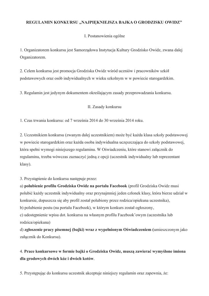 REGULAMIN KONKURSU „NAJPIĘKNIEJSZA BAJKA O GRODZISKU OWIDZ” I. Postanowienia ogólne 1. Organizatorem konkursu jest Samorządowa Instytucja Kultury Grodzisko Owidz, zwana dalej Organizatorem. 2. Celem konkursu jest promocja Grodziska Owidz wśród uczniów i pracowników szkół podstawowych oraz osób indywidualnych w wieku szkolnym w w powiecie starogardzkim. 3. Regulamin jest jedynym dokumentem określającym zasady przeprowadzania konkursu. II. Zasady konkursu 1. Czas trwania konkursu: od 7 września 2014 do 30 września 2014 roku. 2. Uczestnikiem konkursu (zwanym dalej uczestnikiem) może być każda klasa szkoły podstawowej w powiecie starogardzkim oraz każda osoba indywidualna uczęszczająca do szkoły podstawowej, która spełni wymogi niniejszego regulaminu. W Oświadczeniu, które stanowi załącznik do regulaminu, trzeba wówczas zaznaczyć jedną z opcji (uczestnik indywidualny lub reprezentant klasy). 3. Przystąpienie do konkursu następuje przez: a) polubienie profilu Grodziska Owidz na portalu Facebook (profil Grodziska Owidz musi polubić każdy uczestnik indywidualny oraz przynajmniej jeden członek klasy, która bierze udział w konkursie, dopuszcza się aby profil został polubiony przez rodzica/opiekuna uczestnika), b) polubienie postu (na portalu Facebook), w którym konkurs został ogłoszony, c) udostępnienie wpisu dot. konkursu na własnym profilu Facebook’owym (uczestnika lub rodzica/opiekuna) d) zgłoszenie pracy pisemnej (bajki) wraz z wypełnionym Oświadczeniem (umieszczonym jako załącznik do Konkursu). 4. Prace konkursowe w formie bajki o Grodzisku Owidz, muszą zawierać wymyślone imiona dla grodowych dwóch kóz i dwóch kotów. 5. Przystępując do konkursu uczestnik akceptuje niniejszy regulamin oraz zapewnia, że: a) posiada pełnię praw autorskich do zgłoszonej pracy, b) nie narusza praw autorskich osób trzecich, c) nie narusza dóbr osobistych osób, które zostały na nich przedstawione oraz innych dóbr prawnie chronionych, d) wyraża zgodę na nieodpłatne przeniesienie praw autorskich do zgłoszonej pracy oraz ich wykorzystania na wszystkich polach eksploatacji, w tym na reprodukowanie pracy według uznania Organizatora oraz publikowania pracy konkursowej w celach promocyjnych. 6. Ponieważ konkurs jest kierowany do osób nieletnich zgodę na udział oraz akceptację warunków konkursu, w tym zapisów zawartych w pkt. 5 oraz pkt.10 wyraża rodzic/opiekun prawny uczestnika. 7. Każdy uczestnik zgłasza 1 pracę. 8. Prace konkursowe należy składać bezpośrednio do sekretariatu Grodziska Owidz lub przesłać pocztą na adres: Grodzisko Owidz, ul. Rycerska 1, 83-211 Owidz. 9. Termin składania prac upływa 30 września 2014 roku (decyduje data wpłynięcia pracy do Grodziska Owidz). 10. Zgłoszone prace będą eksponowane m.in. na wystawie pokonkursowej w budynku Grodziska Owidz oraz na stronie internetowej organizatora, a także na portalu społecznościowym Facebook. 11. Organizator zastrzega sobie prawo do nieodpłatnej publikacji prac zgłoszonych do konkursu m.in. w materiałach związanych z konkursem oraz promocją Grodziska Owidz z zaznaczeniem imienia i nazwiska autora. III. Zasady rozstrzygnięcia konkursu 1. Prace zostaną ocenione przez jury w składzie powołanym przez Organizatora. 2. Zwycięzcy zostaną wyłonieni 10 października 2014 roku, a ich dane zostaną opublikowane na stronie internetowej Grodziska Owidz (www.owidz.pl). 3. Laureaci indywidualni otrzymają następujące nagrody: ● I miejsce - 5 biletów specjalnych+ koszulka z logo Grodziska+ kubek z logo Grodziska + zorganizowanie urodzin dla Laureata i 9. jego gości+ karnet na dwa tygodnie ferii zimowych w Grodzisku ● II miejsce - 5 biletów specjalnych+ koszulka z logo Grodziska+ kubek z logo Grodziska + karnet na dwa tygodnie ferii zimowych w Grodzisku ● III. miejsce - 5 biletów specjalnych+ koszulka z logo Grodziska+ kubek z logo Grodziska + Karnet na jeden tydzień ferii zimowych w Grodzisku. 4. Wybrani reprezentanci klas (3 najlepsze prace) zapewnią sobie oraz swoim klasom następujące atrakcje: ● I miejsce zwiedzanie Grodziska Owidz z przewodnikiem, ognisko, gry grodowe; ● II miejsce zwiedzanie Grodziska Owidz z przewodnikiem, ognisko; ● III miejsce zwiedzanie Grodziska Owidz z przewodnikiem. 5. Organizator nie zwraca zgłoszonych prac. IV. Postanowienia końcowe 1. Wzięcie udziału w konkursie (przesłanie prac) jest równoznaczne z wyrażeniem zgody na wykorzystywanie danych osobowych uczestnika zgodnie z przepisami Ustawy z 29 sierpnia 1997 r. o ochronie danych osobowych. 2. Uczestnicy ponoszą pełną odpowiedzialność za zgodność z prawdą danych nadesłanych wraz z pracami wynikającą z przepisów Kodeksu Cywilnego z 23 kwietnia 1964 r. oraz Ustawy z 4 lutego 1994 r. o prawie autorskim i prawach pokrewnych. 3. Organizator nie ponosi odpowiedzialności prawnej za naruszenie praw autorskich osób trzecich przez uczestników konkursu. 4. Regulamin jest do dostępny w siedzibie oraz na stronie internetowej Organizatora.