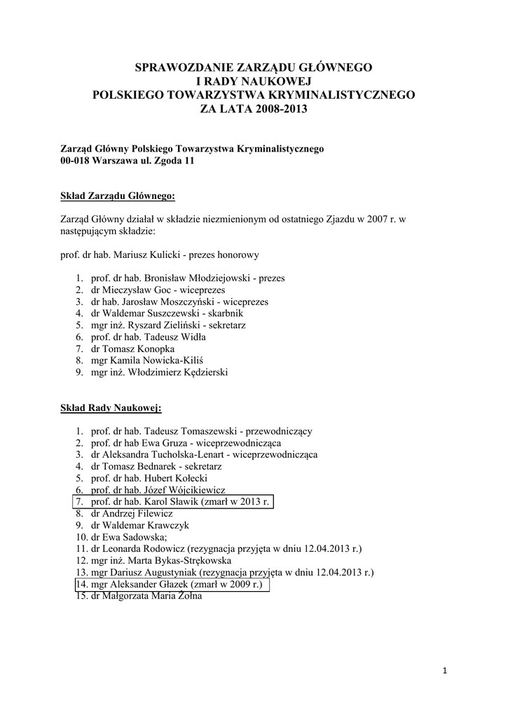 SPRAWOZDANIE ZARZĄDU GŁÓWNEGO I RADY NAUKOWEJ POLSKIEGO TOWARZYSTWA KRYMINALISTYCZNEGO ZA LATA 2008-2013 Zarząd Główny Polskiego Towarzystwa Kryminalistycznego 00-018 Warszawa ul. Zgoda 11 Skład Zarządu Głównego: Zarząd Główny działał w składzie niezmienionym od ostatniego Zjazdu w 2007 r. w następującym składzie: prof. dr hab. Mariusz Kulicki - prezes honorowy 1. 2. 3. 4. 5. 6. 7. 8. 9. prof. dr hab. Bronisław Młodziejowski - prezes dr Mieczysław Goc - wiceprezes dr hab. Jarosław Moszczyński - wiceprezes dr Waldemar Suszczewski - skarbnik mgr inż. Ryszard Zieliński - sekretarz prof. dr hab. Tadeusz Widła dr Tomasz Konopka mgr Kamila Nowicka-Kiliś mgr inż. Włodzimierz Kędzierski Skład Rady Naukowej: 1. prof. dr hab. Tadeusz Tomaszewski - przewodniczący 2. prof. dr hab Ewa Gruza - wiceprzewodnicząca 3. dr Aleksandra Tucholska-Lenart - wiceprzewodnicząca 4. dr Tomasz Bednarek - sekretarz 5. prof. dr hab. Hubert Kołecki 6. prof. dr hab. Józef Wójcikiewicz 7. prof. dr hab. Karol Sławik (zmarł w 2013 r. 8. dr Andrzej Filewicz 9. dr Waldemar Krawczyk 10. dr Ewa Sadowska; 11. dr Leonarda Rodowicz (rezygnacja przyjęta w dniu 12.04.2013 r.) 12. mgr inż. Marta Bykas-Strękowska 13. mgr Dariusz Augustyniak (rezygnacja przyjęta w dniu 12.04.2013 r.) 14. mgr Aleksander Głazek (zmarł w 2009 r.) 15. dr Małgorzata Maria Żołna 1 Członkowie Konsultanci Rady Naukowej PTK 1. 2. 3. 4. 5. prof. dr hab. Jarosław Warylewski prof. dr hab. Jerzy Kasprzak dr hab. Maria Kała mgr Eugeniusz Grzechnik mgr Emil Buduj Skład Komisji Rewizyjnej PTK 1. 2. 3. 4. 5. mgr Grażyna Pieniążek - przewodnicząca mgr Eustachy Łabaj - członek mgr inż. Roman Burbelka mgr Henryk Witkowski - członek mgr inż. Tadeusz Powązka (zmarł w 2009) Skład Sądu Koleżeńskiego 1. 2. 3. 4. 5. dr Jerzy Jakubczak - przewodniczący dr Krystyna Baniuk - członek lek. med. Janusz Lenart - członek mgr Emil Buduj- członek inż Zbigniew Szachnitowski - członek Liczba członków Polskiego Towarzystwa Kryminalistycznego na dzień 30.11.2013 r. Oddział Warszawski 289 członków Oddział Warmińsko-Mazurski 46 członków Oddział Kujawsko-Pomorski 62 członków Oddział Śląski 50 członków Oddział Krakowski 92 członków Oddział Gdański 16 członków Razem 555 członków 2 Główne cele i zadania działalności statutowej PTK Celem głównym Towarzystwa jest rozwijanie zainteresowań, organizowanie działalności naukowej, naukowo-technicznej, oświatowej, informacyjnej, upowszechniającej, wspomagającej, ochronnej, pomocowej oraz innej w sferach przyjętych w statucie zadań pożytku publicznego, podejmowanych na rzecz ogółu społeczności kryminalistycznej, w tym członków Towarzystwa oraz tych, którzy uczestniczą w realizowaniu celów i zadań stojących przed szeroko rozumianą kryminalistyką i dyscyplinami pokrewnymi, a także osób i instytucji będących podmiotami wszelkich oddziaływań o charakterze kryminalistycznym. Realizując zadania organizacji pożytku publicznego, który to status Towarzystwo uzyskało 27.04.2004 r, swoim oddziaływaniem w tym zakresie obejmuje także grupy i osoby o szczególnie trudnej sytuacji życiowej lub materialnej. Od początku istnienia głównym celem Towarzystwa było doskonalenie i upowszechnianie wiedzy kryminalistycznej w praktyce dochodzeniowej, śledczej oraz sądowej. Powołanie Polskiego Towarzystwa Kryminalistycznego odpowiadało zapotrzebowaniu organów ścigania i wymiaru sprawiedliwości na naukowo opracowane dowody, usprawniające pracę policjanta, prokuratora, adwokata i sędziego. Dla skutecznego stosowania prawa i efektywnego zwalczania przestępczości niezbędna jest nie tylko znajomość kodeksu karnego i procedury karnej ale także umiejętność kryminalistycznego uzyskiwania i oceniania i wykorzystania środków dowodowych. Do najważniejszych sfer działalności pożytku publicznego Towarzystwa należy zatem: 1) działalność w sferze bezpieczeństwa wewnętrznego w kraju oraz przeciwdziałania patologiom społecznym; 2) działalność w sferze nauki, edukacji, oświaty i wychowania. Cele statutowe Polskie Towarzystwo Kryminalistyczne realizuje poprzez wykonywanie następujących zadań statutowych: 1) popularyzowanie najnowszych osiągnięć kryminalistyki i dyscyplin pokrewnych, rozbudzanie i rozwijanie zainteresowania wiedzą kryminalistyczną, propagowanie rozwoju i zdobyczy kryminalisty oraz osiągnięć praktyki kryminalistycznej, m.in. poprzez organizowanie sympozjów, zjazdów i konferencji naukowych, odczytów, prelekcji i szkoleń; 2) inicjowanie i prowadzenie badań naukowych oraz współdziałanie z odpowiednimi placówkami w tym zakresie, a także rozwijanie współpracy oraz kontaktów 3 naukowych z pokrewnymi środowiskami i instytucjami; ustalanie i nadzorowanie norm i standardów wykonywania badań kryminalistycznych, 3) kształtowanie wysokiego naukowego poziomu działalności eksperckiej, pogłębianie i doskonalenie wiedzy kryminalistycznej, wspieranie podnoszenia kwalifikacji, uzyskiwania stopni naukowych i uprawnień zawodowych (m.in. poprzez organizację konkursów wiedzy kryminalistycznej); 4) wykonywanie badań specjalistycznych, ekspertyz kryminalistycznych, wydawanie opinii, nadzorowanie i nadawanie uprawnień eksperta i rzeczoznawcy kryminalistyki; 5) reprezentowanie, informowanie i występowanie w interesie członków społeczności kryminalistycznej przed różnymi podmiotami, organizacjami i instytucjami; 6) podejmowanie innych działań bezpośrednio związanych bądź też sprzyjających zapobieganiu i zwalczaniu przestępstw i zjawisk kryminogennych oraz służących realizacji innych celów statutowych Towarzystwa. Działalność szkoleniowa Działalność szkoleniowa przyczynia się w sposób bezpośredni do popularyzacji wiedzy kryminalistycznej, podwyższenia kwalifikacji zawodowych i kompetencji szkolonych. W okresie sprawozdawczym zrealizowano wiele form szkoleń, wykładów
