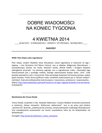_____________________________________________________ DOBRE WIADOMOŚCI NA KONIEC TYGODNIA 4 KWIETNIA 2014 ____SUKCESY / ZAPROSZENIA / OFERTY/ STYPENDIA / KONKURSY____ SUKCESY WSW: Piotr Depta znów nagrodzony! Piotr Depta, student Wydziału Sztuk Wizualnych, został nagrodzony w konkursie na logo i logotyp – Inne Brzmienia Art’n’Music Festival. Jury w składzie: Małgorzata Mazurkiewicz – przewodniczący komisji, Jan Gryka, Wojciech Janicki, Michał Pawlik i Grzegorz Rzepecki jednogłośnie przyznało mu pierwszą nagrodę. Jury o nagrodzonym znaku: „Zwycięskie logo skonstruowane jest z prostego modułu, którego wykorzystanie buduje słowo „inne”. Znak posiada wewnętrzny rytm i muzyczność, które pozwalają zbudować harmonijną oprawę i spójny język wizualny. Prosta forma graficzna znaku umożliwia wykorzystanie go w różnych skalach i nośnikach. Znak jest profesjonalnie skonstruowany i nowoczesny, syntetyczny i rozpoznawalny. Więcej: http://warsztatykultury.pl/wyniki-‐konkursu-‐na-‐logo-‐i-‐logotyp-‐festiwalu-‐inne-‐brzmienia/ Gratulujemy! _____________________________________________________ Wyróżnienia dla Teresy Otulak Teresa Otulak, studentka II roku Wydziału Malarstwa i nowych Mediów otrzymała wyróżnienie w konkursie „Mowa nienawiści. Wykluczam wykluczanie”. Jury w jej pracy pod tytułem „Syndrom KZ” doceniło „subtelną formę animacji, zuniwersalizowanie osobistego doświadczenia oraz uświadomienie przenoszenia się traumy na pokolenia, które jej nie bezpośrednio nie doświadczyły”. Szczegóły: http://www.jhi.pl/konkurs_mowa_nienawisci Film Teresy Otulak pod tytułem „Syndrom” został także wyróżniony w konkursie Międzynarodowego Festiwalu Artystycznego „Na linii czasu”. Film powstał pod kierunkiem dr hab. Agaty Michowskiej i mgr Anny Orlikowskiej w Pracowni Działań Multimedialnych Podczas Międzynarodowego Festiwalu Filmu Artystycznego „Na linii czasu” swoje prace prezentowali także Artur Rozen i Małgorzata Goliszewska z Wydziału Malarstwa i Nowych Mediów. Szczegóły: http://naliniiczasu.pl/pl/content/wyniki-‐konkurs%C3%B3w _____________________________________________________ WMiNM: Tomasz Lazar nagrodzony w BZ WBK Press Photo! Tomasz Lazar z Wydziału Malarstwa i Nowych Mediów zdobył dwa pierwsze miejsca w konkursie BZ WBK Press Photo 2014 w kategorii kultura i sztuka za zdjęcie pojedyncze oraz za fotoreportaż. Nagrodzone zdjęcia Tomasz Lazar wykonał podczas IX edycji Fashion Week w Łodzi. Pojedyncze: http://www.bzwbkpressfoto.pl/laureaci.php?p=58 Reportaż: http://www.bzwbkpressfoto.pl/laureaci.php?p=61 _____________________________________________________ WSW: plakat Agnieszki Dajczak najlepszy w konkursie! Agnieszka Dajczak z Wydziału Sztuk Wizualnych zdobyła pierwsze miejsce w konkursie na plakat Wiosny Młodych 2014. Konkurs został zorganizowany przez Centrum Kultury Zamek. Zwycięski plakat jest dostępny pod linkiem: http://www.zamek.poznan.pl/news,pl,68,3457.html _____________________________________________________ ZAPROSZENIA / SZCZECIN ____________________________________________________ WMiNM: Akademia Sztuki Filmowej | Maska twardziela piątek | 4 kwietnia 2014 | godzina 18.00| Sala Kameralna | Pałac pod Globusem Wydział Malarstwa i Nowych Mediów zaprasza na kolejną projekcję i dyskusję w ramach cyklu Akademia Sztuki Filmowej. Aleksandra Łukaszewicz-‐Alcaraz o filmie: Maska twardziela jest filmem przedstawiającym związki między popkulturową symboliką, a pojęciem męskiej tożsamości w USA u progu XXI wieku. W tej nowatorskiej, wszechstronnej analizie Jackson Katz ukazuje, że powszechność przemocy w społeczeństwie amerykańskim, wliczając strzelaniny w szkołach w Littleton (stan Kolorado), Jonesboro (stan Arkansas) i wielu innych, należy postrzegać jako część trwającego kryzysu męskości. Film jest bogato ilustrowany przykładami z kultury popularnej od programów typu talk show po imprezy sportowe, od Buntownika z wyboru po Chłopaków z sąsiedztwa, od muzyki country po hip-‐hop. Prawa do emisji filmu zapewnia Stowarzyszenie Oswajanie Sztuki. Spotkanie poprowadzi Paweł Kula. ____________________________________________________ WEM: koncerty dyplomowe Serdecznie zapraszamy na koncerty dyplomowe studentów WEM, które właśnie się rozpoczynają. Pierwszy koncert odbędzie się w sobotę Słubicach. W poniedziałek i środę o godzinie 18.00 w Zamku Książąt Pomorskich, szczecińskie chóry wykonają utwory wokalne i wokalno- instrumentalne z różnych epok. Natomiast we wtorek o godzinie 18.00 w Filharmonii szczecińskiej rozpocznie się koncert składający z dwóch części. Pierwsza to utwory chóralne, natomiast w drugiej zabrzmi: Msza Koronacyjna W. A. Mozarta, w wykonaniu chóru i orkiestry AS oraz solistów kierunku: wokalistyka. W czwartek zaś w kościele p.w. Św. Kazimierza przy ul. Broniewskiego, o godzinie 17.00 zabrzmi muzyka chóralna, a o 18.30 zostanie wykonana Msza Koronacyjna tym razem z udziałem chóru, solistów oraz organów na których partię zagra Krzysztof Figiel. Szczegółowy harmonogram koncertów poniżej. WEM: koncert dyplomowy Wojciecha Kuczyńskiego sobota | 5 kwietnia 2014 | godzina 19.00 | Kościół w Słubicach Koncert dyplomowy Wojciecha Kuczyńskiego. WEM: koncert dyplomowy poniedziałek | 7 kwietnia | godzina 16.00 | Zamek Książąt Pomorskich Koncert dyplomowy Patrycji Szponar, Marty Wołczeckiej, Małgorzaty Duszy i Joanny Budkowskiej. WEM: koncert dyplomowy wtorek | 8 kwietnia | godzina 18.00 | Filharmonia im. Mieczysława Karłowicza w Szczecinie koncert dyplomowy Diany Domagały, Marty Kwiatkowskiej, Katarzyny Labuhn, Katsiaryny Mitskevich i Anny Pielechowskiej. WEM: koncert dyplomowy środa | 9 kwietnia |godzina 16.00 | Zamek Książąt Pomorskich Koncert dyplomowy Mai Żmiejko , Patrycji Sierguć, Anny Lichoń, Ewy Zamaryka, Dobromiły Paszyn, Marzeny Kołłątaj. ______________
