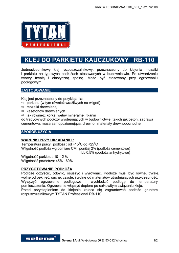 KARTA TECHNICZNA TDS_KLT_122/07/2008 KLEJ DO PARKIETU KAUCZUKOWY RB-110 Jednoskładnikowy klej rozpuszczalnikowy, przeznaczony do klejenia mozaiki i parkietu na typowych podłożach stosowanych w budownictwie. Po utwardzeniu tworzy trwałą i elastyczną spoinę. Może być stosowany przy ogrzewaniu podłogowym. ZASTOSOWANIE Klej jest przeznaczony do przyklejania: parkietu (w tym również wrażliwych na wilgoć) mozaiki drewnianej kasetonów drewnianych jak również: korka, wełny mineralnej, tkanin do tradycyjnych podłoży występujących w budownictwie, takich jak beton, zaprawa cementowa, masa samopoziomująca, drewno i materiały drewnopochodne SPOSÓB UŻYCIA WARUNKI PRZY UKŁADANIU : Temperatura pracy i podłoża : od +15oC do +25oC Wilgotność podłoża wg pomiaru CM : poniżej 2% (podłoża cementowe) lub 0,5% (podłoża anhydrytowe) Wilgotność parkietu : 10–12 % Wilgotność powietrza: 45% - 60% PRZYGOTOWANIE PODŁOŻA Podłoże oczyścić, odpylić, osuszyć i wyrównać. Podłoże musi być równe, trwałe, wolne od pęknięć, suche, czyste, i wolne od materiałów utrudniających przyczepność. Wyłączyć ogrzewanie podłogowe i wychłodzić podłogę do temperatury pomieszczenia. Ogrzewanie włączyć dopiero po całkowitym związaniu kleju. Przed przystąpieniem do klejenia zaleca się zagruntować podłoże gruntem rozpuszczalnikowym TYTAN Professional RB-110. Selena SA ul. Wyścigowa 56 E, 53-012 Wrocław 1/2 KARTA TECHNICZNA TDS_KLT_122/07/2008 APLIKACJA Zarówno klej, jak i klejone materiały powinny być sezonowane przez co najmniej 24 h. Klej należy przed użyciem dobrze wymieszać. Po wyschnięciu gruntu klej nakładać równomiernie na podłoże przy pomocy odpowiedniej szpachli ząbkowanej. Nałożona warstwa kleju powinna mieć grubość 2-3 mm. Zaleca się nakładać klej jednorazowo na powierzchnię, na której można ułożyć klepkę w ciągu 5-10 minut Klepkę parkietową należy położyć, lekko przesunąć, a następnie silnie docisnąć do podłoża. Po zakończeniu prac pomieszczenia wietrzyć do zaniku zapachu. Narzędzia czyścić natychmiast po zakończeniu prac – utwardzony klej można usuwać tylko mechanicznie. Cyklinowanie i lakierowanie wykonywać po całkowitym związaniu kleju. DANE TECHNICZNE kolor czas pracy czas pełnego utwardzenia wydajność czyszczenie narzędzi beżowy ok. 15-20 min (w temp. 20OC) ok. 4-5 dni (w zależności od warunków otoczenia i chłonności podłoża) 0,65 – 1,4 kg/m2 benzyna ekstrakcyjna OPAKOWANIE I PRZECHOWYWANIE Produkt pakowany jest w opakowania o pojemności: 1 kg, 3,5 kg, 5 kg, 14 kg, 21 kg. Klej należy przechowywać w oryginalnie zamkniętych opakowaniach w temperaturze od +10oC do +25oC. Aktualizacja 1.07.2008 Powyższe dane, zalecenia i wskazówki opierają się na naszej najlepszej wiedzy, badaniach oraz doświadczeniach i zostały udzielone w dobrej wierze zgodnie z zasadami obowiązującymi w naszej firmie i u naszych dostawców. Zaproponowane sposoby postępowania uznane są za powszechne, jednak każdy z użytkowników tego materiału powinien upewnić się na wszelkie możliwe sposoby, włącznie ze sprawdzeniem produktu końcowego w odpowiednich warunkach, o przydatności dostarczanych materiałów dla osiągnięcia celów przez niego zamierzonych. Ani Spółka, ani jej upoważnieni przedstawiciele nie mogą ponosić odpowiedzialności za jakiekolwiek straty poniesione na skutek nieprawidłowego, bądź błędnego użycia jej materiałów. Selena SA ul. Wyścigowa 56 E, 53-012 Wrocław 2/2