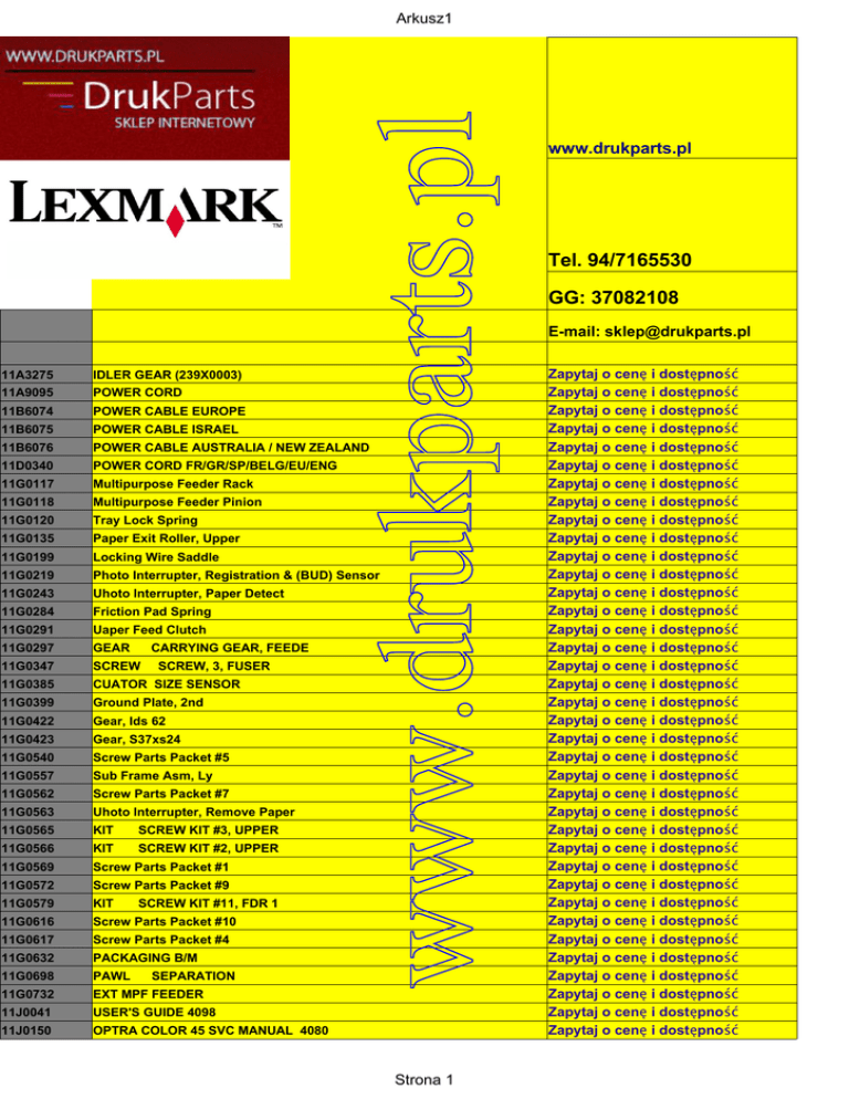 www.drukparts.pl Arkusz1 11A3275 IDLER GEAR (239X0003) 11A9095 POWER CORD 11B6074 POWER CABLE EUROPE 11B6075 POWER CABLE ISRAEL 11B6076 POWER CABLE AUSTRALIA / NEW ZEALAND 11D0340 POWER CORD FR/GR/SP/BELG/EU/ENG 11G0117 Multipurpose Feeder Rack 11G0118 Multipurpose Feeder Pinion 11G0120 Tray Lock Spring 11G0135 Paper Exit Roller, Upper 11G0199 Locking Wire Saddle 11G0219 Photo Interrupter, Registration & (BUD) Sensor 11G0243 Uhoto Interrupter, Paper Detect 11G0284 Friction Pad Spring 11G0291 Uaper Feed Clutch 11G0297 GEAR 11G0347 SCREW 11G0385 CUATOR SIZE SENSOR 11G0399 Ground Plate, 2nd 11G0422 Gear, Ids 62 11G0423 Gear, S37xs24 11G0540 Screw Parts Packet #5 11G0557 Sub Frame Asm, Ly 11G0562 Screw Parts Packet #7 11G0563 Uhoto Interrupter, Remove Paper 11G0565 KIT SCREW KIT #3, UPPER 11G0566 KIT SCREW KIT #2, UPPER 11G0569 Screw Parts Packet #1 11G0572 Screw Parts Packet #9 11G0579 KIT 11G0616 Screw Parts Packet #10 11G0617 Screw Parts Packet #4 11G0632 PACKAGING B/M 11G0698 PAWL 11G0732 EXT MPF FEEDER 11J0041 USER'S GUIDE 4098 11J0150 OPTRA COLOR 45 SVC MANUAL 4080 CARRYING GEAR, FEEDE SCREW, 3, FUSER SCREW KIT #11, FDR 1 SEPARATION Strona 1 www.drukparts.pl Tel. 94/7165530 GG: 37082108 E-mail: [email protected] Zapytaj o cenę i dostępność Zapytaj o cenę i dostępność Zapytaj o cenę i dostępność Zapytaj o cenę i dostępność Zapytaj o cenę i dostępność Zapytaj o cenę i dostępność Zapytaj o cenę i dostępność Zapytaj o cenę i dostępność Zapytaj o cenę i dostępność Zapytaj o cenę i dostępność Zapytaj o cenę i dostępność Zapytaj o cenę i dostępność Zapytaj o cenę i dostępność Zapytaj o cenę i dostępność Zapytaj o cenę i dostępność Zapytaj o cenę i dostępność Zapytaj o cenę i dostępność Zapytaj o cenę i dostępność Zapytaj o cenę i dostępność Zapytaj o cenę i dostępność Zapytaj o cenę i dostępność Zapytaj o cenę i dostępność Zapytaj o cenę i dostępność Zapytaj o cenę i dostępność Zapytaj o cenę i dostępność Zapytaj o cenę i dostępność Zapytaj o cenę i dostępność Zapytaj o cenę i dostępność Zapytaj o cenę i dostępność Zapytaj o cenę i dostępność Zapytaj o cenę i dostępność Zapytaj o cenę i dostępność Zapytaj o cenę i dostępność Zapytaj o cenę i dostępność Zapytaj o cenę i dostępność Zapytaj o cenę i dostępność Zapytaj o cenę i dostępność 11J0550 MANUAL SERVICE OPTRA 4092 12A5265 WAX WIPER ASM 12B0726 CABLE ASM MPF HARNESS 12G0017 CABLE ASM SCSI M50-M50 2M 12G0054 SIT KIT SVC INFO/TNG/DVD V0 12G0169 SERVICE MANUAL (OP CIR 5050) 12G0185 422x SVC Service Manual 4227-200 12G0228 FAN CARRIER MTR COOLING 12G0471 SIT KIT 12G1695 Card ASM INA 10/100 Base TX 12G1696 Card ASM INA 10Base 2/T 12G1697 Card ASM INA Token Ring 12G1779 BASS HOTEL SIMM 12G1785 OVER FRONT 12G1830 ADAPTER TOKEN RING 3 PORT 12G1831 ADAPTER 10/100 ETHER 3 PORT 12G1832 ADAPTER 10B2/T100B TX1 PORT 12G1833 ADAPTER 10/100 ETHER 1 PORT 12G1834 SUPPLY POWER MARKNET X2000 12G1851 SIMM 12G1854 DRIVE ASM ADP LS 1800 CODE 12G1857 CARD A INA, NO MODEM 12G1861 MEMORY ASM KODAK 4080 ENG FRU 12G1862 CARD ASM OEM 15PPM ENGINE 4069 12G1863 CARD ASM OEM 20PPM ENGINE 4069 12G1864 CARD ASM OEM 25 PPM ENGINE 4069 12G1865 CARD ASM OEM 35PPM ENGINE 4069 12G1866 MACHINE FLS SIMM,6M 2ND LEVEL 12G2002 COVER ASM REAR 12G2011 LABEL 12G2013 SHIELD ASMPLATE 12G2017 COVER ASM 12G2018 COVER ASM 12G2035 CABLE ASM HARNESS 12G2045 CABLE ASM HARNESS 12G2047 CABLE ASM HARNESS 12G2049 SWITCH ASMSW3 12G2078 SHAFT ASM 12G2083 HOLDER ASM 12G2086 PLATE ASM GROUND 12G2106 COVER ASM 12G2110 PLATE 12G2115 GEAR ASM 26T 12G2125 GEAR ASM 20T 12G2130 GEAR ASM 24T 12G2140 DUCT ASM 12G2143 SEAL ASM 12G2149 HOUSING AS 12G2190 BUSHING AS 12G2281 COVER ASM 12G2285 CLUTCH ASMCL3 12G2298 SHAFT ASM 12G2310 LEVER ASM 12G2312 ROLLER ASM 12G2314 GUIDE ASM BAR SVC INFO/TNG/DVD V04.2010 OptraImage Printer ASM SCRAPER www.drukparts.pl Arkusz1 Strona 2 Zapytaj o cenę i dostępność Zapytaj o cenę i dostępność Zapytaj o cenę i dostępność Zapytaj o cenę i dostępność Zapytaj o cenę i dostępność Zapytaj o cenę i dostępność Zapytaj o cenę i dostępność Zapytaj o cenę i dostępność Zapytaj o cenę i dostępność Zapytaj o cenę i dostępność Zapytaj o cenę i dostępność Zapytaj o cenę i dostępność Zapytaj o cenę i dostępność Zapytaj o cenę i dostępność Zapytaj o cenę i dostępność Zapytaj o cenę i dostępność Zapytaj o cenę i dostępność Zapytaj o cenę i dostępność Zapytaj o cenę i dostępność Zapytaj o cenę i dostępność Zapytaj o cenę i dostępność Zapytaj o cenę i dostępność Zapytaj o cenę i dostępność Zapytaj o cenę i dostępność Zapytaj o cenę i dostępność Zapytaj o cenę i dostępność Zapytaj o cenę i dostępność Zapytaj o cenę i dostępność Zapytaj o cenę i dostępność Zapytaj o cenę i dostępność Zapytaj o cenę i dostępność Zapytaj o cenę i dostępność Zapytaj o cenę i dostępność Zapytaj o cenę i dostępność Zapytaj o cenę i dostępność Zapytaj o cenę i dostępność Zapytaj o cenę i dostępność Zapytaj o cenę i dostępność Zapytaj o cenę i dostępność Zapytaj o cenę i dostępność Zapytaj o cenę i dostępność Zapytaj o cenę i dostępność Zapytaj o cenę i dostępność Zapytaj o cenę i dostępność Zapytaj o cenę i dostępność Zapytaj o cenę i dostępność Zapytaj o cenę i dostępność Zapytaj o cenę i dostępność Zapytaj o cenę i dostępność Zapytaj o cenę i dostępność Zapytaj o cenę i dostępność Zapytaj o cenę i dostępność Zapytaj o cenę i dostępność Zapytaj o cenę i dostępność Zapytaj o cenę i dostępność 12G2323 HOLDER ASM 12G2334 ROLLER ASMCONVEYOR 12G2335 ROLLER ASMCONVEYOR 12G2388 CABLE ASM HARNESS 12G2401 PAD ASM 12G2407 SWITCH ASMMICRO, S2 12G2409 HOLDER ASM 12G2418 CABLE ASM HARNESS 12G2423 BUSHING AS 12G2431 COVER ASM 12G2435 GEAR ASM 20T 12G2436 GEAR ASM 18T 12G2441 C