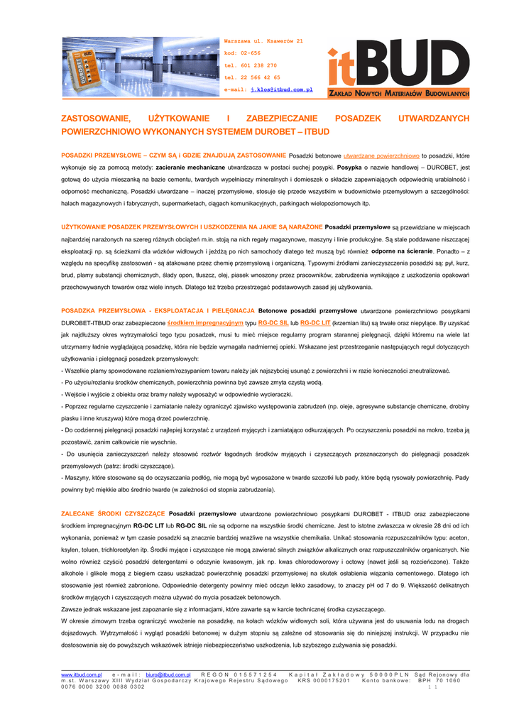 Warszawa ul. Ksawerów 21 kod: 02-656 tel. 601 238 270 tel. 22 566 42 65 e-mail: [email protected] ZASTOSOWANIE, UŻYTKOWANIE I ZABEZPIECZANIE POSADZEK UTWARDZANYCH POWIERZCHNIOWO WYKONANYCH SYSTEMEM DUROBET – ITBUD POSADZKI PRZEMYSŁOWE – CZYM SĄ i GDZIE ZNAJDUJĄ ZASTOSOWANIE Posadzki betonowe utwardzane powierzchniowo to posadzki, które wykonuje się za pomocą metody: zacieranie mechaniczne utwardzacza w postaci suchej posypki. Posypka o nazwie handlowej – DUROBET, jest gotową do użycia mieszanką na bazie cementu, twardych wypełniaczy mineralnych i domieszek o składzie zapewniających odpowiednią urabialność i odporność mechaniczną. Posadzki utwardzane – inaczej przemysłowe, stosuje się przede wszystkim w budownictwie przemysłowym a szczególności: halach magazynowych i fabrycznych, supermarketach, ciągach komunikacyjnych, parkingach wielopoziomowych itp. UŻYTKOWANIE POSADZEK PRZEMYSŁOWYCH I USZKODZENIA NA JAKIE SĄ NARAŻONE Posadzki przemysłowe są przewidziane w miejscach najbardziej narażonych na szereg różnych obciążeń m.in. stoją na nich regały magazynowe, maszyny i linie produkcyjne. Są stale poddawane niszczącej eksploatacji np. są ścieżkami dla wózków widłowych i jeżdżą po nich samochody dlatego też muszą być również odporne na ścieranie. Ponadto – z względu na specyfikę zastosowań - są atakowane przez chemię przemysłową i organiczną. Typowymi źródłami zanieczyszczenia posadzki są: pył, kurz, brud, plamy substancji chemicznych, ślady opon, tłuszcz, olej, piasek wnoszony przez pracowników, zabrudzenia wynikające z uszkodzenia opakowań przechowywanych towarów oraz wiele innych. Dlatego też trzeba przestrzegać podstawowych zasad jej użytkowania. POSADZKA PRZEMYSŁOWA - EKSPLOATACJA I PIELĘGNACJA Betonowe posadzki przemysłowe utwardzone powierzchniowo posypkami DUROBET-ITBUD oraz zabezpieczone środkiem impregnacyjnym typu RG-DC SIL lub RG-DC LIT (krzemian litu) są trwałe oraz niepylące. By uzyskać jak najdłuższy okres wytrzymałości tego typu posadzek, musi tu mieć miejsce regularny program starannej pielęgnacji, dzięki któremu na wiele lat utrzymamy ładnie wyglądającą posadzkę, która nie będzie wymagała nadmiernej opieki. Wskazane jest przestrzeganie następujących reguł dotyczących użytkowania i pielęgnacji posadzek przemysłowych: - Wszelkie plamy spowodowane rozlaniem/rozsypaniem towaru należy jak najszybciej usunąć z powierzchni i w razie konieczności zneutralizować. - Po użyciu/rozlaniu środków chemicznych, powierzchnia powinna być zawsze zmyta czystą wodą. - Wejście i wyjście z obiektu oraz bramy należy wyposażyć w odpowiednie wycieraczki. - Poprzez regularne czyszczenie i zamiatanie należy ograniczyć zjawisko występowania zabrudzeń (np. oleje, agresywne substancje chemiczne, drobiny piasku i inne kruszywa) które mogą drzeć powierzchnię. - Do codziennej pielęgnacji posadzki najlepiej korzystać z urządzeń myjących i zamiatająco odkurzających. Po oczyszczeniu posadzki na mokro, trzeba ją pozostawić, zanim całkowicie nie wyschnie. - Do usunięcia zanieczyszczeń należy stosować roztwór łagodnych środków myjących i czyszczących przeznaczonych do pielęgnacji posadzek przemysłowych (patrz: środki czyszczące). - Maszyny, które stosowane są do oczyszczania podłóg, nie mogą być wyposażone w twarde szczotki lub pady, które będą rysowały powierzchnię. Pady powinny być miękkie albo średnio twarde (w zależności od stopnia zabrudzenia). ZALECANE ŚRODKI CZYSZCZĄCE Posadzki przemysłowe utwardzone powierzchniowo posypkami DUROBET - ITBUD oraz zabezpieczone środkiem impregnacyjnym RG-DC LIT lub RG-DC SIL nie są odporne na wszystkie środki chemiczne. Jest to istotne zwłaszcza w okresie 28 dni od ich wykonania, ponieważ w tym czasie posadzki są znacznie bardziej wrażliwe na wszystkie chemikalia. Unikać stosowania rozpuszczalników typu: aceton, ksylen, toluen, trichloroetylen itp. Środki myjące i czyszczące nie mogą zawierać silnych związków alkalicznych oraz rozpuszczalników organicznych. Nie wolno również czyścić posadzki detergentami o odczynie kwasowym, jak np. kwas chlorodoworowy i octowy (nawet jeśli są rozcieńczone). Także alkohole i glikole mogą z biegiem czasu uszkadzać powierzchnię posadzki przemysłowej na skutek osłabienia wiązania cementowego. Dlatego ich stosowanie jest również zabronione. Odpowiednie detergenty powinny mieć odczyn lekko zasadowy, to znaczy pH od 7 do 9. Większość delikatnych środków myjących i czyszczących można używać do mycia posadzek betonowych. Zawsze jednak wskazane jest zapoznanie się z informacjami, które zawarte są w karcie technicznej środka czyszczącego. W okresie zimowym trzeba ograniczyć wwożenie na posadzkę, na kołach wózków widłowych soli, która używana jest do usuwania lodu na drogach dojazdowych. Wytrzymałość i wygląd posadzki betonowej w dużym stopniu są zależne od stosowania się do niniejszej instrukcji. W przypadku nie dostosowania się do powyższych wskazówek istnieje niebezpieczeństwo uszkodzenia, lub szybszego zużywania się posadzki. www.itbud.com.pl e - m a i l : [email protected] RE G O N 015571 254 K a p i t a ł Z a k ł a d o w y 5 0 0 0 0 P L N Sąd Rejonowy dla m.st. W arszawy XIII W ydział Gospodarczy Krajowego Rejestru Sądowego KRS 0000175201 Konto bankowe: BPH 70 1060 0076 0000 3200 0088 0302 1 1