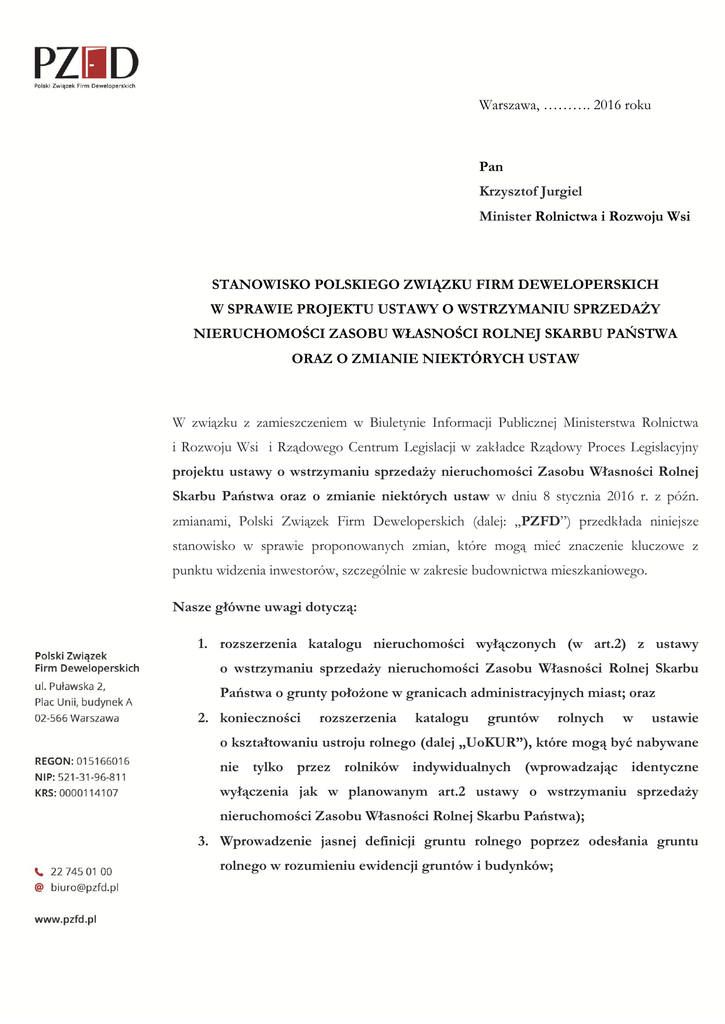 Warszawa, ………. 2016 roku Pan Krzysztof Jurgiel Minister Rolnictwa i Rozwoju Wsi STANOWISKO POLSKIEGO ZWIĄZKU FIRM DEWELOPERSKICH W SPRAWIE PROJEKTU USTAWY O WSTRZYMANIU SPRZEDAŻY NIERUCHOMOŚCI ZASOBU WŁASNOŚCI ROLNEJ SKARBU PAŃSTWA ORAZ O ZMIANIE NIEKTÓRYCH USTAW W związku z zamieszczeniem w Biuletynie Informacji Publicznej Ministerstwa Rolnictwa i Rozwoju Wsi i Rządowego Centrum Legislacji w zakładce Rządowy Proces Legislacyjny projektu ustawy o wstrzymaniu sprzedaży nieruchomości Zasobu Własności Rolnej Skarbu Państwa oraz o zmianie niektórych ustaw w dniu 8 stycznia 2016 r. z późn. zmianami, Polski Związek Firm Deweloperskich (dalej: „PZFD”) przedkłada niniejsze stanowisko w sprawie proponowanych zmian, które mogą mieć znaczenie kluczowe z punktu widzenia inwestorów, szczególnie w zakresie budownictwa mieszkaniowego. Nasze główne uwagi dotyczą: 1. rozszerzenia katalogu nieruchomości wyłączonych (w art.2) z ustawy o wstrzymaniu sprzedaży nieruchomości Zasobu Własności Rolnej Skarbu Państwa o grunty położone w granicach administracyjnych miast; oraz 2. konieczności rozszerzenia katalogu gruntów rolnych w ustawie o kształtowaniu ustroju rolnego (dalej „UoKUR”), które mogą być nabywane nie tylko przez rolników indywidualnych (wprowadzając identyczne wyłączenia jak w planowanym art.2 ustawy o wstrzymaniu sprzedaży nieruchomości Zasobu Własności Rolnej Skarbu Państwa); 3. Wprowadzenie jasnej definicji gruntu rolnego poprzez odesłania gruntu rolnego w rozumieniu ewidencji gruntów i budynków; Naszym głównym przesłaniem jest zaproponowanie drobnych zmian, tak aby nie doprowadzić do istotnego spadku inwestycji budowlanych w kraju. Proponowane główne zmiany: 1. W art. 2 ustawy o wstrzymaniu sprzedaży nieruchomości Zasobu Własności Rolnej Skarbu Państwa dodać ustęp 5 w brzmieniu: „5) nieruchomości położonych w granicach administracyjnych miast” . 2. Dostosować brzmienie ustawy o kształtowaniu ustroju rolnego do brzmienia art. 2 ustawy o wstrzymaniu sprzedaży nieruchomości Zasobu Własności Rolnej Skarbu Państwa poprzez dodanie dodatkowego art. 2d o brzmieniu art. 2 ustawy o wstrzymaniu sprzedaży(…) w brzmieniu uwzględniającym propozycje dodania ust. 5, to jest: „Przepisów art. 2a-2c nie stosuje się do sprzedaży: 1) Nieruchomości ich części przeznaczonych w: a) Miejscowym planie zagospodarowania przestrzennego lub b) Studiom uwarunkowań i kierunków zagospodarowania przestrzennego gminy, lub c) Ostateczne decyzji o warunkach zabudowy i zagospodarowania terenu, lub d) Ostatecznej decyzji o lokalizacji inwestycji celu publicznego, - na cele inne niż rolne, w szczególności na parki technologiczne, parki przemysłowe, centra biznesowologistyczne, składy magazynowe, budownictwo mieszkaniowe, obiekty sportowo-rekreacyjne lub 2) nieruchomości położonych w granicach specjalnych stref ekonomicznych, lub 3) domów, lokali mieszkalnych, budynków gospodarczych i garażu wraz z niezbędnymi gruntami oraz ogródków przydomowych, 4) nieruchomości rolnych o powierzchni do 1 ha; 5) nieruchomości położonych w granicach administracyjnych miast” . Szczegółowe uzasadnienie przedstawiamy poniżej. 1. Konieczność wyłączenia spod reżimu ustawy a. o wstrzymaniu sprzedaży nieruchomości Zasobu Własności Rolnej Skarbu Państwa (dalej „Ustawa o Wstrzymaniu Sprzedaży”)oraz b. ustawy o kształtowaniu ustroju rolnego gruntów rolnych znajdujących się w granicach administracyjnych miast. Projekt ustawy wprowadza nową ustawę oraz szereg zmian w ustawie z dnia 11 kwietnia 2003 r. o kształtowaniu ustroju rolnego (Dz. U. z 2012 r. poz. 803), podkreślając, również poprzez dodanie preambuły, że jednym z naczelnych celów Państwa jest troska o zapewnienie bezpieczeństwa żywnościowego obywateli i wspieranie zrównoważonego rolnictwa prowadzonego w zgodzie z wymogami ochrony środowiska i sprzyjającego rozwojowi obszarów wiejskich. W uzasadnieniu ustawy UoKUR ponownie uwypuklono ochronę ilościową i jakościową gruntów rolnych. Ochrona jakościowa ma na celu niepogarszanie właściwości produkcyjnych gleb oraz przywracanie utraconych właściwości gruntom rolnym. O ile w przypadku areału gruntów rolnych położonych na terenach wiejskich znajduje to pewne uzasadnienie, o tyle w odniesieniu do gruntów znajdujących w granicach administracyjnych miast, proponowane rozwiązanie legislacyjne, w opinii PZFD, w żaden sposób nie przyczyni się do osiągnięcia celów ustawy, a jednocześnie wpłynie niezwykle negatywnie na poziom inwestycji budowlanych w kraju. Wprowadzenie zasady w art. 2a UoKUR, w myśl której jedynie rolnicy indywidualni będą mogli nabywać nieruchomości rolne doprowadzi do drastycznego spadku podaży gruntów, które po przekształceniach, są przeznaczane na tereny budowlane. Należy wprowadzić mechanizmy, które zapewnią odpowiednią podaż gruntów inwestycyjnych w miastach. Zgodnie z danymi, otrzymanymi bezpośrednio z dwóch wybranych miast Polski, w tym znajdujących się w czołówce biorąc pod uwagę kryterium największej powierzchni, należy stwierdzić, że: - ok. 30 % Warszawy to grunty rolne; - 47% Krakowa to grunty rolne; Co istotne, klasy gruntów znajdujących się w granicach administracyjnych miast znacząca część to użytki rolne klas IV, IVa, IVb, V i VI wytworzonych z gleb pochodzenia organicznego. Wynika stąd, że w przypadku gruntów rolnych położonych w granicach administracyjnych miast często odpada przesłanka ochrony jakościowej. Najcenniejsze w punktu widzenia produkcji rolnej areały stanowiące użytki rolne klas I-III, znajdują się na obszarach wiejskich. Oprócz powyższego ze względu na zanieczyszczenia miejskie, produkcja rolna w obszarze miast jest obarczona wieloma negatywnymi aspektami. Zdaniem PZFD, łatwiejsze inwestowanie na terenach miejskich, w porównaniu z inwestycjami na terenach wiejskich, przy