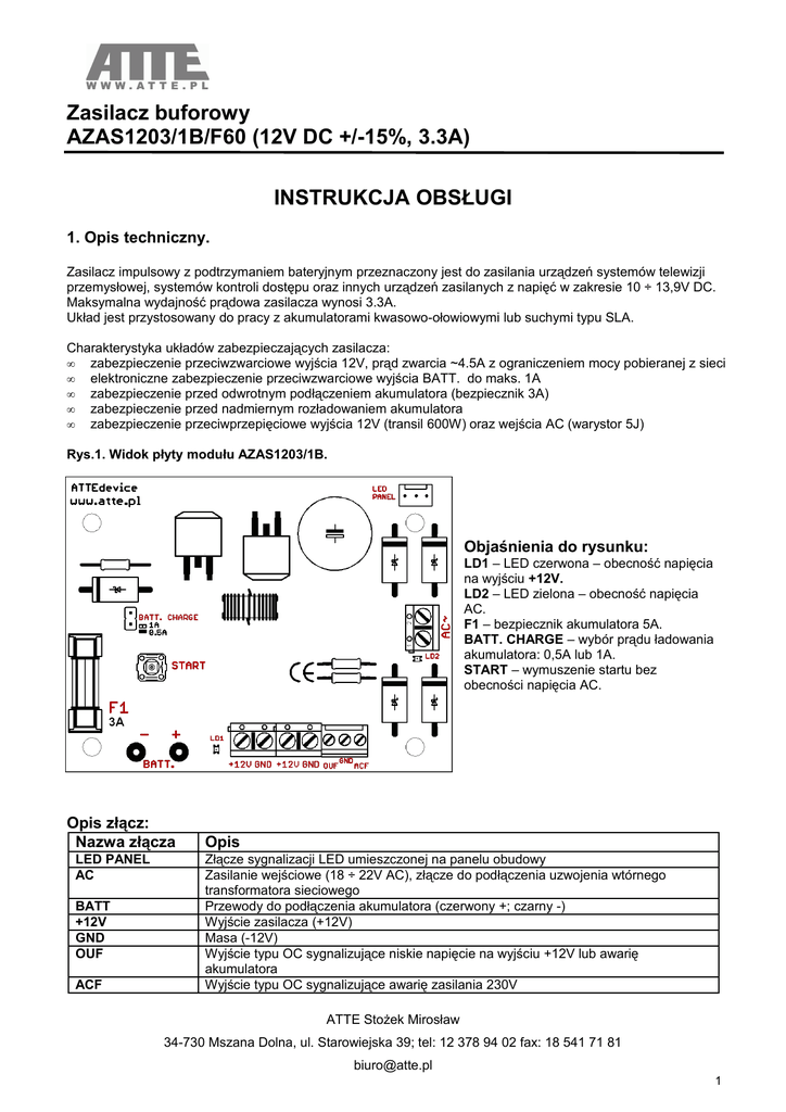 Zasilacz buforowy AZAS1203/1B/F60 (12V DC +/-15%, 3.3A) INSTRUKCJA OBSŁUGI 1. Opis techniczny. Zasilacz impulsowy z podtrzymaniem bateryjnym przeznaczony jest do zasilania urządzeń systemów telewizji przemysłowej, systemów kontroli dostępu oraz innych urządzeń zasilanych z napięć w zakresie 10 ÷ 13,9V DC. Maksymalna wydajność prądowa zasilacza wynosi 3.3A. Układ jest przystosowany do pracy z akumulatorami kwasowo-ołowiowymi lub suchymi typu SLA. Charakterystyka układów zabezpieczających zasilacza: • zabezpieczenie przeciwzwarciowe wyjścia 12V, prąd zwarcia ~4.5A z ograniczeniem mocy pobieranej z sieci • elektroniczne zabezpieczenie przeciwzwarciowe wyjścia BATT. do maks. 1A • zabezpieczenie przed odwrotnym podłączeniem akumulatora (bezpiecznik 3A) • zabezpieczenie przed nadmiernym rozładowaniem akumulatora • zabezpieczenie przeciwprzepięciowe wyjścia 12V (transil 600W) oraz wejścia AC (warystor 5J) Rys.1. Widok płyty modułu AZAS1203/1B. Objaśnienia do rysunku: LD1 – LED czerwona – obecność napięcia na wyjściu +12V. LD2 – LED zielona – obecność napięcia AC. F1 – bezpiecznik akumulatora 5A. BATT. CHARGE – wybór prądu ładowania akumulatora: 0,5A lub 1A. START – wymuszenie startu bez obecności napięcia AC. Opis złącz: Nazwa złącza LED PANEL AC BATT +12V GND OUF ACF Opis Złącze sygnalizacji LED umieszczonej na panelu obudowy Zasilanie wejściowe (18 ÷ 22V AC), złącze do podłączenia uzwojenia wtórnego transformatora sieciowego Przewody do podłączenia akumulatora (czerwony +; czarny -) Wyjście zasilacza (+12V) Masa (-12V) Wyjście typu OC sygnalizujące niskie napięcie na wyjściu +12V lub awarię akumulatora Wyjście typu OC sygnalizujące awarię zasilania 230V ATTE Stożek Mirosław 34-730 Mszana Dolna, ul. Starowiejska 39; tel: 12 378 94 02 fax: 18 541 71 81 [email protected] 1 Sygnalizacja pracy zasilacza na zewnętrznym panelu: Obecność napięcia na wyjściach zasilacza sygnalizowana jest świeceniem czerwonej diody LED na czołowym panelu urządzenia. Awaria sieci AC sygnalizowana jest poprzez zieloną diodę LED (ACF). DANE TECHNICZNE Obudowa Wymiary obudowy Montaż Transformator Bezpiecznik transformatora Typ zasilacza Moc zasilacza Napięcie wyjściowe Prąd wyjściowy Prąd ładowania akumulatora Pobór prądu przez układ zasilacza Ilość wyjść zasilania Ochrona akumulatora Zabezpieczenie przed zwarciem wyjścia 12V Zabezpieczenie przed zwarciem zacisków akku Zabezpieczenie odwrotnej polaryzacji akku Zabezpieczenie przed przepięciami Sygnalizacja pracy Wyjścia techniczne Typ wyjść technicznych Funkcja startu przy braku zasilania AC Zakres temperatur pracy Metalowa, wentylowana, kolor biały 300 × 320 × 90 (szer. × dł. × wys.), dystans od ściany 8mm Otwory montażowe 6mm, z możliwością zawieszenia 80VA 22V AC 50÷60 Hz F 1A/250V (5x20) impulsowy, sprawność 83÷90% 45W ciągła, 54W maks. 11,5÷13,9V - zasilanie sieciowe, 10,5÷12,6V - praca bateryjna Max 3.3A , zalecany ciągły: do 2.8A [1] 0.5A lub 1A wybierane zworką (BATT. CHARGE) 30mA maks. 1 – podwójne - Odłączenie dla napięcia akumulatora poniżej 10,5V. automatyczny powrót po powrocie napięcia sieci, - Zabezpieczenie przed odwrotnym podłączeniem akumulatora elektroniczne przetwornicy: 4.5A (maks. 5A); z akumulatorem: 4.5A + prąd przepalenia bezpiecznika 3A elektroniczne, ograniczenie prądu do 1A maks. bezpiecznik zwłoczny 3A transil 600W diody LED: stan zasilania AC, stan wyjścia 12V tak, OUF – brak napięcia +12V, ACF – brak napięcia AC typu OC (otwarty kolektor), maks. 50mA na wyjście tak, przycisk START [2] -10°C ... +40°C [3] Adnotacje: 1. Zaleca sie pozostawienie rezerwy min. 0.5A dla obwodu ładowania akumulatora. 2. Wyzwalanie typu IMPULS, zaleca się odciążenie zasilacza w celu poprawnego startu. 3. Dla temperatury otoczenia powyżej +27°C oraz mocy pobieranej ponad 40W zaleca się zastosowanie wymuszonego chłodzenia. Rys.2. Zależność obciążenia od temperatury otoczenia Obciążalność zasilacza uzależniona jest od temperatury otoczenia. Zasilacz można obciążyć w 100% tylko wtedy (2.8A + rezerwa 0.5A), jeśli temperatura otoczenia zawiera się w przedziale od 0°C do 27°C. Zależność tą przedstawiono na powyższym wykresie. ATTE Stożek Mirosław 34-730 Mszana Dolna, ul. Starowiejska 39; tel: 12 378 94 02 fax: 18 541 71 81 [email protected] 2 2. Zasady bezpieczeństwa Zasilacz stabilizowany może być montowany tylko przez wykwalifikowanego instalatora, posiadającego odpowiednie zezwolenia i uprawnienia do przyłączania (ingerencji) w instalacje 230V AC oraz instalacje niskonapięciowe. Urządzenie powinno być zamontowane w pomieszczeniach zamkniętych zgodnie z II klasą środowiskową o normalnej wilgotności powietrza (RH=90% maks. bez kondensacji) i temperaturze z zakresu od -10°C do +40°C. Zasilacz powinien pracować w pozycji pionowej tak, aby zapewnić swobodny konwekcyjny przepływ powietrza przez otwory wentylacyjne obudowy. Przed przystąpieniem do instalacji należy sporządzić bilans obciążenia zasilacza. W czasie normalnej eksploatacji suma prądów pobieranych przez odbiorniki oraz prądu ładowania akumulatora nie może przekroczyć wydajności zasilacza 3.3A (zalecane 2.8A dla odbiorników z rezerwą 0.5A dla akumulatora; P=45W maks.). Ponieważ zasilacz nie posiada wyłącznika umożliwiającego odłączenie zasilania sieciowego, należy powiadomić właściciela lub użytkownika urządzenia o sposobie odłączenia go od sieci (np. poprzez wskazanie bezpiecznika zabezpieczającego obwód zasilający). Szczególnie starannie należy wykonać obwód ochrony przeciwporażeniowej. Żółto-zielony przewód ochronny kabla zasilającego musi być dołączony do zacisku oznaczonego symbolem w obudowie zasilacza. Praca zasilacza bez poprawnie wykonanego i sprawnego technicznie obwodu ochrony przeciwporażeniowej jest NIEDOPUSZCZALNA! Metalowa obudowa zasila