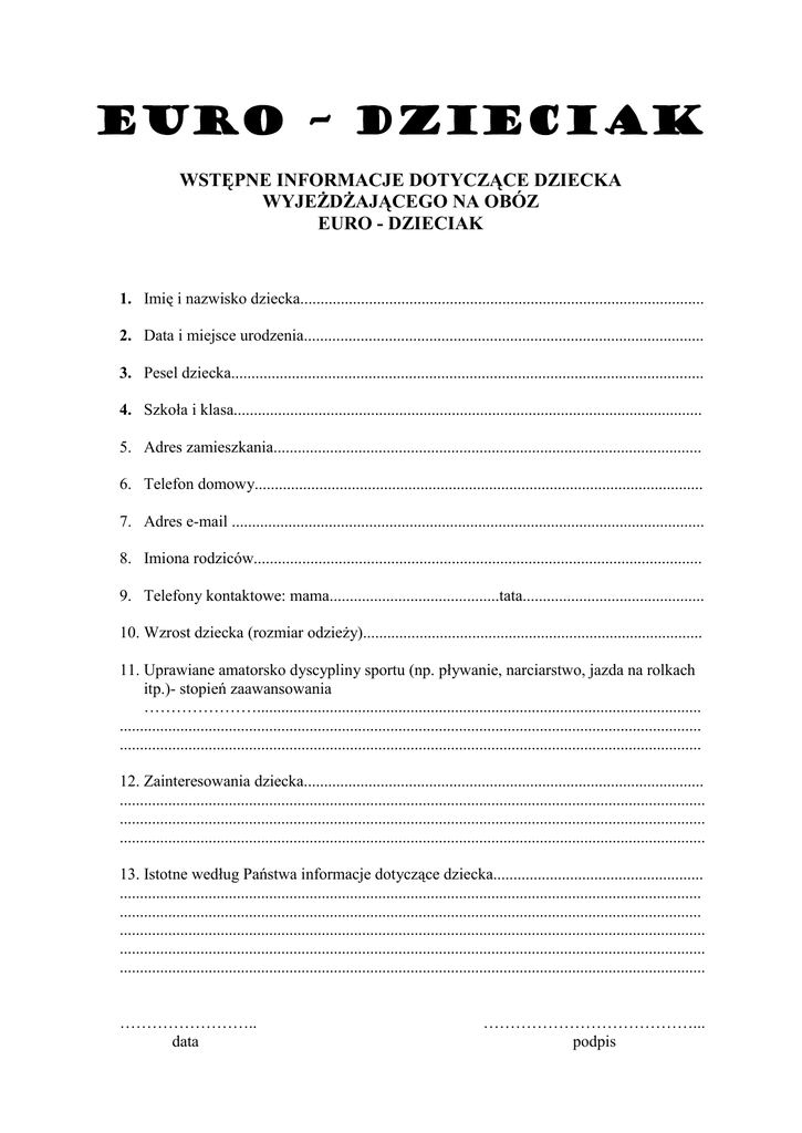 EURO – DZIECIAK WSTĘPNE INFORMACJE DOTYCZĄCE DZIECKA WYJEŻDŻAJĄCEGO NA OBÓZ EURO - DZIECIAK 1. Imię i nazwisko dziecka.................................................................................................... 2. Data i miejsce urodzenia................................................................................................... 3. Pesel dziecka..................................................................................................................... 4. Szkoła i klasa.................................................................................................................... 5. Adres zamieszkania.......................................................................................................... 6. Telefon domowy............................................................................................................... 7. Adres e-mail ..................................................................................................................... 8. Imiona rodziców............................................................................................................... 9. Telefony kontaktowe: mama..........................................tata............................................. 10. Wzrost dziecka (rozmiar odzieży).................................................................................... 11. Uprawiane amatorsko dyscypliny sportu (np. pływanie, narciarstwo, jazda na rolkach itp.)- stopień zaawansowania ………………….............................................................................................................. ................................................................................................................................................ ................................................................................................................................................ 12. Zainteresowania dziecka................................................................................................... ................................................................................................................................................. ................................................................................................................................................. ................................................................................................................................................. 13. Istotne według Państwa informacje dotyczące dziecka.................................................... ................................................................................................................................................ ................................................................................................................................................ ................................................................................................................................................. ................................................................................................................................................. ................................................................................................................................................. …………………….. data …………………………………... podpis
