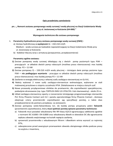 Załącznik nr 6 Opis przedmiotu zamówienia pn.: „ Remont zestawu pompowego wody surowej i wody płucznej na Stacji Uzdatniania Wody przy ul. Jesionowej w Kościanie (64-000) ” Wymagania techniczne dla zestawu pompowego I. Parametry hydrauliczne pracy zestawu pompowego wody surowej [ZWS] : a) Zestaw hydroforowy o wydajności Q – 150-210 m3/h Medium - woda surowa po kaskadzie napowietrzającej na Stacji Uzdatniania Wody przy ul. Jesionowej w Kościanie. b) Kolektor tłoczny wraz z armaturą (przepustnice, przepływomierze) Parametry ogólne zestawu: 1) Zestaw pompowy wody surowej składający się z dwóch pomp poziomych typu PJM – pracujących w układzie dwóch pomp roboczych (możliwa praca równoczesna): moc każdej pompy P2 = 11 kW 2) Zestaw pompowy Q – 150-210 m3/h wody płucznej – istniejące dwie pompy poziome typu PJM – nie podlegające wymianie - pracujące w układzie dwóch pomp roboczych (możliwa 3) 4) 5) 6) 7) praca równoczesna): moc każdej pompy P2 = 11 kW Zasilanie w energię elektryczną z własnej szafy zasilająco-sterowniczej nn 0,4 kV, Należy wykonać 2 nowe szafy zasilająco-sterownicze wolnostojące, wykonane ze stali malowanej proszkowo o stopniu szczelności IP54. Zlokalizowane w miejscu starych szaf. Nowe przewody przyłączeniowe silników do przetwornic, dla częstotliwości specjalistyczne, podwójnie ekranowane (np. typu TOPFLEX-EMV-UV-2YSLCYK-J lub równoważny) - około 25 m. Układ zasilająco-sterowniczy oparty o rozszerzenie istniejącego programowalnego sterownika PLC firmy Phoenix Contact serii ILC i panelu operatorskiego firmy Phoenix Contact , dostawa obejmuje cztery przemienniki częstotliwości wg specyfikacji poniżej, a także dwa przepływomierze do pomiaru przepływu za zestawami. Zestaw pompowy wielo-falownikowy tzn. do każdej pompy przypisany jeden falownik (przemiennik częstotliwości), który musi spełniać poniżej opisane parametry techniczne: a) Falownik musi posiadać wbudowany filtr RFI klasy A2/C3 ograniczający zakłócenia zgodnie z normami IEC 61000 i EN 61800 oraz wbudowany dławik w obwodzie DC dla ograniczenia wpływu obwodu wejściowego na kształt napięcia zasilania, b) sprawność przemiennika z wbudowanym filtrem i dławikiem winna wynosić co najmniej 97%, c) zabezpieczone przed awaryjnym przerwaniem obwodu obciążonego silnika podczas pracy na wyjściu z inwertera, d) posiada co najmniej cztery setupy – możliwość prostego wyboru jednego z czterech różnych trybów pracy (opisanych oddzielnymi zestawami parametrów przetwornicy), wybór setupu bez konieczności zatrzymania falownika. e) posiada fabrycznie wbudowany port szeregowy RS485 (Modbus) oraz port USB f) posiada możliwość podłączenia termistora silnika i czujnika PT100 g) posiada możliwość montowania obok siebie bez przerw między nimi, h) posiada wydzielony kanał chłodzenia elementów mocy odseparowany od kart elektroniki stopniem ochrony IP54, i) posiada pokrycie kart elektroniki zabezpieczające przed wpływem agresywnego środowiska w klasie 3C3 według normy IEC 721-3-3, j) posiada wbudowane funkcje energooszczędne automatycznego dopasowania do silnika z zasprzęgniętym silnikiem oraz automatyczną optymalizację energii, k) posiada panel sterujący w języku polskim umożliwiający wyświetlanie 5 dowolnych wartości pracy przetwornicy lub silnika, znakowo lub za pomocą wykresów oraz możliwość wyświetlenia rejestru alarmów, l) posiada funkcje zabezpieczające przed pracą poza charakterystyką pompy przed suchobiegiem, oraz możliwość dzielenia rampy hamowania i rozruchowej a także wbudowany prosty sterownik logiczny, m) posiada możliwość wyświetlania do 5 komunikatów programowalnych przez użytkownika zależnych od zewnętrznych sygnałów podłączonych do przetwornicy n) produkowany jest z zachowaniem dbałości o środowisko naturalne zgodnie z normą ISO14000 o) produkowany jest zgodnie z systemem zapewnienia jakości ISO9001 p) producent falowników musi zapewnić serwis gwarancyjny i pogwarancyjny w Polsce, oraz punkt serwisowy wyposażony w podstawowe części serwisowe w odległości nie większej niż 60 km od siedziby Inwestora[Zamawiającego] 8) Dla zapewnienia zabezpieczenia przed suchobiegiem należy zintegrować istniejące zabezpieczenia pływakowe ze zbiorników wody surowej i zbiorników wody uzdatnionej z odpowiednimi zestawami pomp 9) Dostarczone przepływomierze mają się komunikować w sposób cyfrowy ze sterownikami PLC za pomocą komunikacji MODBUS RTU 10) Niezależnie od komunikacji cyfrowej należy zapewnić pełną możliwość uruchamiania zestawu w trybie sterowania ręcznego z pominięciem sterownika PLC. 11) Minimalne wymagane wyposażenie toru sterowania każdej z pomp: a) Przełącznik AUTO - Odstawione – LOKALNE b) Przycisk – Start c) Przycisk – Stop d) Potencjometr do nastaw wydajności e) Lampki do sygnalizacji pracy i awarii Nie dopuszcza się realizacji powyższych sterowań z wykorzystaniem panelu sterowniczego przetwornicy częstotliwości. 12) Informacja o parametrach pracy układu na panelu HMI szafy sterowniczej, II. Układ sterowania powinien zapewnić: a) Utrzymanie zadanej wartości przepływu wody surowej lub wody płucznej (odpowiednie załączanie pomp i sterowanie ich prędkością obrotową w zależności od nastawionego przepływu) b) Zabezpieczenie zestawu przed suchobiegiem c) Ręczne sterowanie pracą pomp, d) Automatyczne załączenie kolejnej pompy w przypadku wykrycia awarii pompy pracującej e) Kontynuowanie pracy według wcześniej zadanych parametrów po zaniku zasilania, powrocie napięcia, f) Dopuszcza się równoległą pracę dwóch pomp w każdym z zestawów. III. Parametry urządzeń w szafie zasilająco-sterowniczej: a) Włączenie zestawów w istniejący sterownik programowalny PLC typu ILC130 Phoenix Contact ze złączem Ethernet do sprzęgania z innymi sterownikami, kompletny z wtykiem przyłączeniowym i polem opisowym, porty k