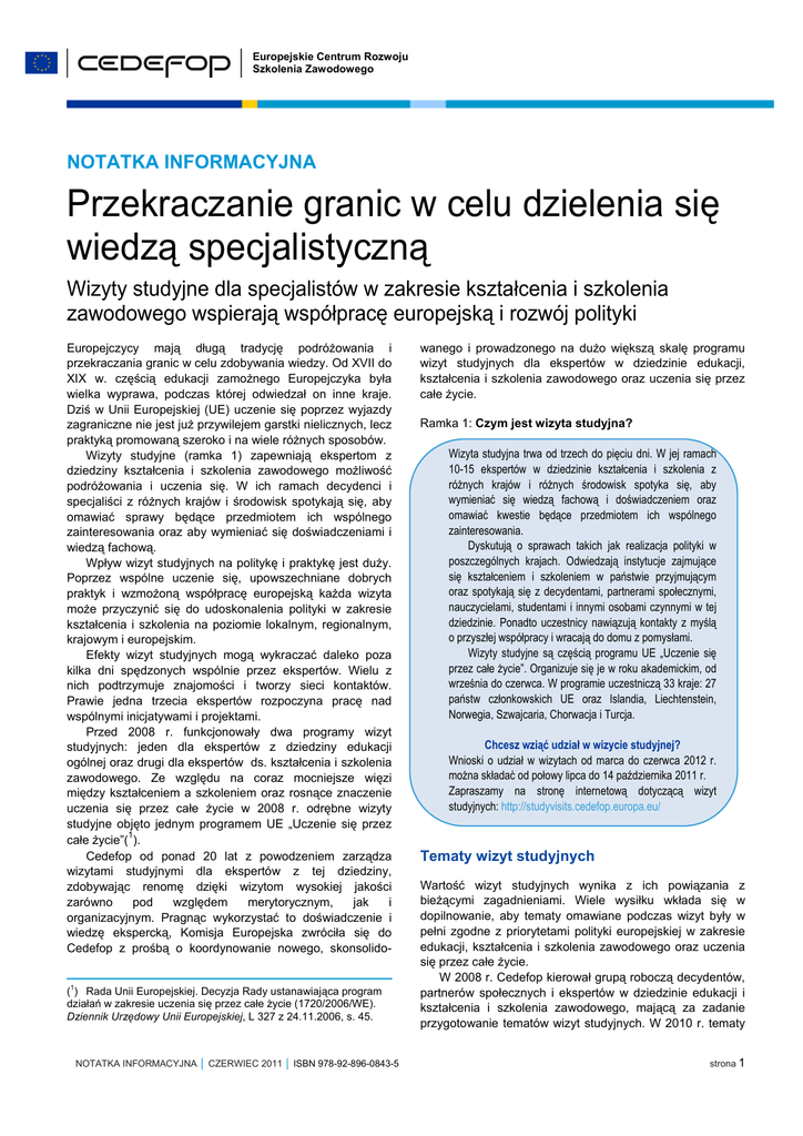 Europejskie Centrum Rozwoju Szkolenia Zawodowego NOTATKA INFORMACYJNA Przekraczanie granic w celu dzielenia się wiedzą specjalistyczną Wizyty studyjne dla specjalistów w zakresie kształcenia i szkolenia zawodowego wspierają współpracę europejską i rozwój polityki Europejczycy mają długą tradycję podróżowania i przekraczania granic w celu zdobywania wiedzy. Od XVII do XIX w. częścią edukacji zamożnego Europejczyka była wielka wyprawa, podczas której odwiedzał on inne kraje. Dziś w Unii Europejskiej (UE) uczenie się poprzez wyjazdy zagraniczne nie jest już przywilejem garstki nielicznych, lecz praktyką promowaną szeroko i na wiele różnych sposobów. Wizyty studyjne (ramka 1) zapewniają ekspertom z dziedziny kształcenia i szkolenia zawodowego możliwość podróżowania i uczenia się. W ich ramach decydenci i specjaliści z różnych krajów i środowisk spotykają się, aby omawiać sprawy będące przedmiotem ich wspólnego zainteresowania oraz aby wymieniać się doświadczeniami i wiedzą fachową. Wpływ wizyt studyjnych na politykę i praktykę jest duży. Poprzez wspólne uczenie się, upowszechniane dobrych praktyk i wzmożoną współpracę europejską każda wizyta może przyczynić się do udoskonalenia polityki w zakresie kształcenia i szkolenia na poziomie lokalnym, regionalnym, krajowym i europejskim. Efekty wizyt studyjnych mogą wykraczać daleko poza kilka dni spędzonych wspólnie przez ekspertów. Wielu z nich podtrzymuje znajomości i tworzy sieci kontaktów. Prawie jedna trzecia ekspertów rozpoczyna pracę nad wspólnymi inicjatywami i projektami. Przed 2008 r. funkcjonowały dwa programy wizyt studyjnych: jeden dla ekspertów z dziedziny edukacji ogólnej oraz drugi dla ekspertów ds. kształcenia i szkolenia zawodowego. Ze względu na coraz mocniejsze więzi między kształceniem a szkoleniem oraz rosnące znaczenie uczenia się przez całe życie w 2008 r. odrębne wizyty studyjne objęto jednym programem UE „Uczenie się przez 1 całe życie”( ). Cedefop od ponad 20 lat z powodzeniem zarządza wizytami studyjnymi dla ekspertów z tej dziedziny, zdobywając renomę dzięki wizytom wysokiej jakości zarówno pod względem merytorycznym, jak i organizacyjnym. Pragnąc wykorzystać to doświadczenie i wiedzę ekspercką, Komisja Europejska zwróciła się do Cedefop z prośbą o koordynowanie nowego, skonsolido1 ( ) Rada Unii Europejskiej. Decyzja Rady ustanawiająca program działań w zakresie uczenia się przez całe życie (1720/2006/WE). Dziennik Urzędowy Unii Europejskiej, L 327 z 24.11.2006, s. 45. NOTATKA INFORMACYJNA │ CZERWIEC 2011 │ ISBN 978-92-896-0843-5 wanego i prowadzonego na dużo większą skalę programu wizyt studyjnych dla ekspertów w dziedzinie edukacji, kształcenia i szkolenia zawodowego oraz uczenia się przez całe życie. Ramka 1: Czym jest wizyta studyjna? Wizyta studyjna trwa od trzech do pięciu dni. W jej ramach 10-15 ekspertów w dziedzinie kształcenia i szkolenia z różnych krajów i różnych środowisk spotyka się, aby wymieniać się wiedzą fachową i doświadczeniem oraz omawiać kwestie będące przedmiotem ich wspólnego zainteresowania. Dyskutują o sprawach takich jak realizacja polityki w poszczególnych krajach. Odwiedzają instytucje zajmujące się kształceniem i szkoleniem w państwie przyjmującym oraz spotykają się z decydentami, partnerami społecznymi, nauczycielami, studentami i innymi osobami czynnymi w tej dziedzinie. Ponadto uczestnicy nawiązują kontakty z myślą o przyszłej współpracy i wracają do domu z pomysłami. Wizyty studyjne są częścią programu UE „Uczenie się przez całe życie”. Organizuje się je w roku akademickim, od września do czerwca. W programie uczestniczą 33 kraje: 27 państw członkowskich UE oraz Islandia, Liechtenstein, Norwegia, Szwajcaria, Chorwacja i Turcja. Chcesz wziąć udział w wizycie studyjnej? Wnioski o udział w wizytach od marca do czerwca 2012 r. można składać od połowy lipca do 14 października 2011 r. Zapraszamy na stronę internetową dotyczącą wizyt studyjnych: http://studyvisits.cedefop.europa.eu/ Tematy wizyt studyjnych Wartość wizyt studyjnych wynika z ich powiązania z bieżącymi zagadnieniami. Wiele wysiłku wkłada się w dopilnowanie, aby tematy omawiane podczas wizyt były w pełni zgodne z priorytetami polityki europejskiej w zakresie edukacji, kształcenia i szkolenia zawodowego oraz uczenia się przez całe życie. W 2008 r. Cedefop kierował grupą roboczą decydentów, partnerów społecznych i ekspertów w dziedzinie edukacji i kształcenia i szkolenia zawodowego, mającą za zadanie przygotowanie tematów wizyt studyjnych. W 2010 r. tematy strona 1 zaktualizowano w związku z wprowadzeniem strategii „Europa 2020” i zmianami w ramach współpracy w zakresie kształcenia i szkolenia na okres do 2020 r. Od 2008 r. wizyty studyjne w coraz większym stopniu zachęcają ekspertów do patrzenia na kształcenie i szkolenie zawodowe, kształcenie ogólne, szkolnictwo wyższe i edukację dorosłych jako na powiązane w jedną całość elementy uczenia się przez całe życie, raczej niż jako na odrębne zagadnienia. Stale rośnie odsetek wizyt studyjnych odznaczających się kompleksowym podejściem do uczenia się przez całe życie – w latach 2008-2009 było ich ok. 30%, a w latach 2010-2011 nieco ponad 40% (rys. 1). Liczba wizyt studyjnych dotyczących kształcenia i szkolenia zawodowego utrzymuje się na względnie stabilnym poziomie około 17%. Rysune 1: Liczba wizyt studyjnych 2008/09-2010/11 wg rodzaju, tendencje widoczne pod względem strategii stosowanych w tej dziedzinie; współpraca instytucji zajmujących się kształceniem i szkoleniem ze światem pracy i lokalnymi społecznościami.Zusammenarbeit der Bildung und Berufsbildung mit der Arbeitswelt und lokalen Gemeinschaften Uczestnicy wizyt studyjnych Wizyty studyjne okazały się bardzo popularne (tabela 1). W latach 2010-2