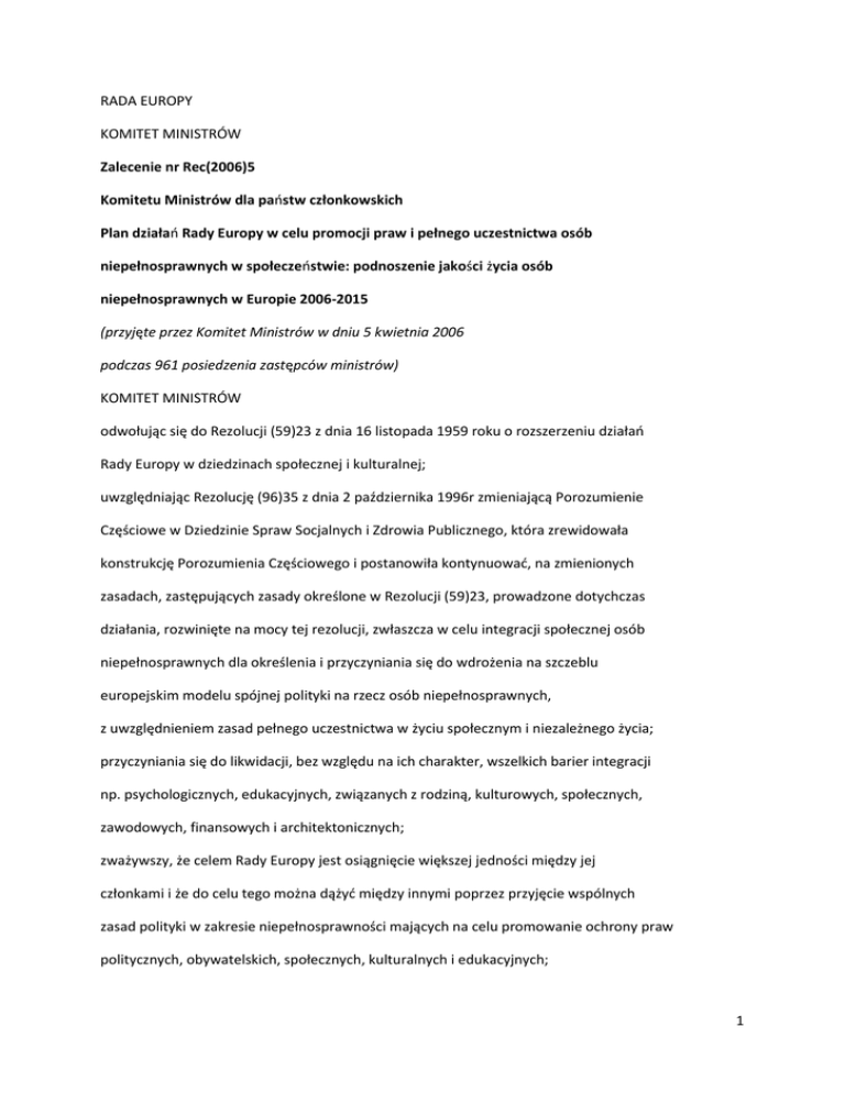 RADA EUROPY KOMITET MINISTRÓW Zalecenie nr Rec(2006)5 Komitetu Ministrów dla państw członkowskich Plan działań Rady Europy w celu promocji praw i pełnego uczestnictwa osób niepełnosprawnych w społeczeństwie: podnoszenie jakości życia osób niepełnosprawnych w Europie 2006-2015 (przyjęte przez Komitet Ministrów w dniu 5 kwietnia 2006 podczas 961 posiedzenia zastępców ministrów) KOMITET MINISTRÓW odwołując się do Rezolucji (59)23 z dnia 16 listopada 1959 roku o rozszerzeniu działań Rady Europy w dziedzinach społecznej i kulturalnej; uwzględniając Rezolucję (96)35 z dnia 2 października 1996r zmieniającą Porozumienie Częściowe w Dziedzinie Spraw Socjalnych i Zdrowia Publicznego, która zrewidowała konstrukcję Porozumienia Częściowego i postanowiła kontynuować, na zmienionych zasadach, zastępujących zasady określone w Rezolucji (59)23, prowadzone dotychczas działania, rozwinięte na mocy tej rezolucji, zwłaszcza w celu integracji społecznej osób niepełnosprawnych dla określenia i przyczyniania się do wdrożenia na szczeblu europejskim modelu spójnej polityki na rzecz osób niepełnosprawnych, z uwzględnieniem zasad pełnego uczestnictwa w życiu społecznym i niezależnego życia; przyczyniania się do likwidacji, bez względu na ich charakter, wszelkich barier integracji np. psychologicznych, edukacyjnych, związanych z rodziną, kulturowych, społecznych, zawodowych, finansowych i architektonicznych; zważywszy, że celem Rady Europy jest osiągnięcie większej jedności między jej członkami i że do celu tego można dążyć między innymi poprzez przyjęcie wspólnych zasad polityki w zakresie niepełnosprawności mających na celu promowanie ochrony praw politycznych, obywatelskich, społecznych, kulturalnych i edukacyjnych; 1 mając na uwadze Konwencję o ochronie praw człowieka i podstawowych wolności (ETS nr 5); mając na uwadze zasady zawarte w Europejskiej Karcie Społecznej (zrewidowanej) (ETS nr 163), a w szczególności prawo osób niepełnosprawnych do niezależności, integracji społecznej i uczestniczenia w życiu społeczeństwa; uwzględniając Standardowe Zasady ONZ wyrównywania szans osób niepełnosprawnych (1993); uwzględniając Międzynarodową klasyfikację funkcjonowania, niepełnosprawności i zdrowia (ICF) Światowej Organizacji Zdrowia (2001); uwzględniając Konwencję nr 159 o rehabilitacji zawodowej i zatrudnianiu osób niepełnosprawnych Międzynarodowej Organizacji Pracy (1983) i odpowiadające jej 2 Zalecenie MOP nr 168 o rehabilitacji zawodowej i zatrudnieniu osób niepełnosprawnych (1983); uwzględniając Zalecenie nr R(92)6 Komitetu Ministrów Rady Europy dla państw członkowskich dotyczące spójnej polityki wobec osób niepełnosprawnych; uwzględniając Deklarację Ministrów w sprawie osób niepełnosprawnych "Dążenie do pełnego uczestnictwa osób niepełnosprawnych jako obywateli", przyjętą przez Drugą Europejską Konferencję Ministrów odpowiedzialnych za integracyjną politykę na rzecz osób niepełnosprawnych, która odbyła się w Maladze, Hiszpania, w dniach 7-8 maja 2003 roku; uwzględniając Plan Działań przyjęty podczas Trzeciego Szczytu Głów Państw i Rządów Rady Europy (CM(2005)80 finał) w Warszawie w dniu 17 maja 2005 roku, który określa rolę i główne obowiązki Rady Europy na nadchodzące lata; uwzględniając Zalecenie 1592 (2003) Zgromadzenia Parlamentarnego Rady Europy "Dążąc do pełnego włączenia osób niepełnosprawnych do życia społecznego”; potwierdzając powszechność, niepodzielność i współzależność wszystkich praw człowieka 2 i podstawowych wolności oraz potrzebę zagwarantowania osobom niepełnosprawnym pełnego z nich korzystania bez jakiejkolwiek dyskryminacji; zważywszy, że – wg szacunków - w Europie osoby niepełnosprawne stanowią około 1015% ludności, że do głównych przyczyn niepełnosprawności należą choroby, wypadki i warunki powodujące niepełnosprawność wśród osób starszych, oraz Ŝe oczekuje się, iż liczba osób starszych i niepełnosprawnych będzie ciągle rosnąć, między innymi z powodu coraz dłuższego trwania życia; zważywszy, że niepopieranie praw niepełnosprawnych obywateli oraz nie zagwarantowanie im równych szans jest naruszeniem godności ludzkiej; zważywszy, że zapewnianie równych szans członkom wszystkich grup społecznych przyczynia się do zabezpieczenia demokracji i spójności społecznej; wyrażając przekonanie, że oparte na prawach człowieka podejście do zapewnienia integracji pełnego uczestnictwa osób niepełnosprawnych w społeczeństwie powinno stanowić element każdej polityki na szczeblu międzynarodowym, krajowym, regionalnym i lokalnym; podkreślając potrzebę włączenia zagadnień niepełnosprawności do działań podejmowanych we wszystkich sektorach poprzez spójną politykę i skoordynowane działania; wyrażając uznanie dla pracy Komitetu Rady Europy ds. Rehabilitacji i Integracji Osób Niepełnosprawnych (CD-P-R) przy opracowaniu Planu Działań na rzecz osób niepełnosprawnych; 3 podkreślając znaczenie nawiązywania stosunków partnerskich z organizacjami pozarządowymi osób niepełnosprawnych we wdrażaniu Planu Działań na rzecz osób niepełnosprawnych i w dalszych działaniach w tym zakresie; zaleca, by rządy państw członkowskich, z należytym uwzględnieniem swoich odpowiednich struktur krajowych, regionalnych lub lokalnych, jak również odpowiednich 3 obowiązków: a. włączyły jako właściwe dla ich polityki, legislacji i praktyki zasady oraz wdrożyły działania określone w Planie Działań Rady Europy w celu promocji praw i pełnego uczestnictwa osób niepełnosprawnych w społeczeństwie: podnoszenia jakości życia osób niepełnosprawnych w Europie 2006-2015, zgodnie z jego tekstem załączonym do niniejszego zalecenia; b. promowały wdrażanie i stosowanie Planu Działań Rady Europy na lata 2006-2015 w obszarach, kt