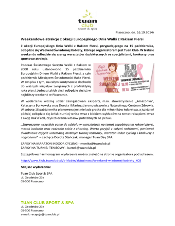 Piaseczno, dn. 16.10.2014r Weekendowe atrakcje z okazji Europejskiego Dnia Walki z Rakiem Piersi Z okazji Europejskiego Dnia Walki z Rakiem Piersi, przypadającego na 15 października, odbędzie się Weekend Świadomej Kobiety, którego organizatorem jest Tuan Club. W trakcie weekendu odbędzie się szereg warsztatów dydaktycznych ze specjalistami, konkursy oraz sportowe atrakcje. Podczas Światowego Szczytu Walki z Rakiem w 2000 roku ustanowiono 15 października Europejskim Dniem Walki z Rakiem Piersi, a cały październik Miesiącem Świadomości Raka Piersi. W związku z tym, na całym kontynencie dochodzi do ważnych inicjatyw związanych z profilaktyką raka piersi. Jedna z takich akcji odbędzie się już w najbliższy weekend w Piasecznie. W wydarzeniu wezmą udział zaangażowani eksperci, m.in. stowarzyszenie ,,Amazonka”, Katarzyna Borkowska oraz Dorota i Mariusz Jarymowiczowie z Naturalnego Centrum Zdrowia. W sobotę 18 października planowana jest nie lada gratka dla miłośników kolarstwa, a już dzień później odbędzie się żeński turniej tenisa wraz z blokiem wykładów na temat raka piersi wraz z akcją Rak`n`roll, czyli zbierania włosów potrzebnych na peruki. ,,Zapraszamy wszystkie panie do udziału w warsztatach na temat zapobiegania rakowi piersi, metod badania oraz radzenia sobie z chorobą. Warto przyjść z całymi rodzinami, ponieważ dwudniowe zajęcia urozmaicą atrakcje: turniej tenisowy, maraton indor cycling i konkursy z nagrodami” – zachęca Dorota Stańczak, manager Tuan Day SPA. ZAPISY NA MARATON INDOOR CYCLING - [email protected] ZAPISY NA TURNIEJ TENISOWY - [email protected] Szczegółowy harmonogram wydarzenia można znaleźć na stronie organizatora pod adresem: http://www.klub.tuanclub.pl/o-klubie/aktualnosci/weekend-wiadomej-kobiety_402 Miejsce wydarzenia: Tuan Club Sport& SPA ul. Geodetów 23e 05-500 Piaseczno TUAN CLUB SPORT & SPA ul. Geodetów 23e 05-500 Piaseczno e-mail: [email protected]