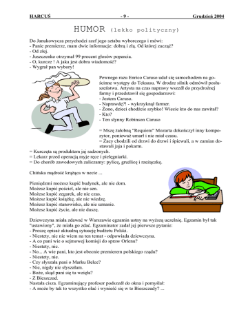 HARCUŚ -9- HUMOR Grudzień 2004 (lekko polityczny) Do Janukowycza przychodzi szef jego sztabu wyborczego i mówi: - Panie premierze, mam dwie informacje: dobrą i złą. Od której zacząć? - Od złej. - Juszczenko otrzymał 99 procent głosów poparcia. - O, kurcze ! A jaka jest dobra wiadomość? - Wygrał pan wybory! Pewnego razu Enrico Caruso udał się samochodem na gościnne występy do Teksasu. W drodze silnik odmówił posłuszeństwa. Artysta na czas naprawy wszedł do przydrożnej farmy i przedstawił się gospodarzowi: - Jestem Caruso. - Naprawdę?! - wykrzyknął farmer. - Żono, dzieci chodźcie szybko! Wiecie kto do nas zawitał? - Kto? - Ten słynny Robinson Caruso = Mszę żałobną "Requiem" Mozarta dokończył inny kompozytor, ponieważ umarł i nie miał czasu. = Żacy chodzili od drzwi do drzwi i śpiewali, a w zamian dostawali jaja i pokarm. = Kurczęta są produktem jaj sadzonych. = Lekarz przed operacją myje ręce i pielęgniarki. = Do chorób zawodowych zaliczamy: pylicę, gruźlicę i rzeżączkę. Chińska mądrość krążąca w necie ... Pieniędzmi możesz kupić budynek, ale nie dom. Możesz kupić pościel, ale nie sen. Możesz kupić zegarek, ale nie czas. Możesz kupić książkę, ale nie wiedzę. Możesz kupić stanowisko, ale nie uznanie. Możesz kupić życie, ale nie duszę. Dziewczyna miała zdawać w Warszawie egzamin ustny na wyższą uczelnię. Egzamin był tak "ustawiony", że miała go zdać. Egzaminator zadał jej pierwsze pytanie: - Proszę opisać aktualną sytuację budżetu Polski. - Niestety, nic nie wiem na ten temat - odpowiada dziewczyna. - A co pani wie o sejmowej komisji do spraw Orlenu? - Niestety, nic. - No... A wie pani, kto jest obecnie premierem polskiego rządu? - Niestety, nie. - Czy słyszała pani o Marku Belce? - Nie, nigdy nie słyszałam. - Boże, skąd pani się tu wzięła? - Z Bieszczad. Nastała cisza. Egzaminujący profesor podszedł do okna i pomyślał: - A może by tak to wszystko olać i wynieść się w te Bieszczady? ...