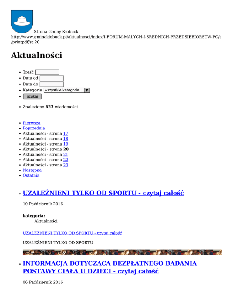 Strona Gminy Kłobuck http://www.gminaklobuck.pl/aktualnosci/index/I-FORUM-MALYCH-I-SREDNICH-PRZEDSIEBIORSTW-PO/s /printpdf/st:20 Aktualności Treść Data od Data do Kategorie wszystkie kategorie ... ▼ Szukaj Znaleziono 623 wiadomości. Pierwsza Poprzednia Aktualności - strona 17 Aktualności - strona 18 Aktualności - strona 19 Aktualności - strona 20 Aktualności - strona 21 Aktualności - strona 22 Aktualności - strona 23 Następna Ostatnia UZALEŻNIENI TYLKO OD SPORTU - czytaj całość 10 Październik 2016 kategoria: Aktualności UZALEŻNIENI TYLKO OD SPORTU - czytaj całość UZALEŻNIENI TYLKO OD SPORTU UZALEŻNIENI TYLKO OD SPORTU INFORMACJA DOTYCZĄCA BEZPŁATNEGO BADANIA POSTAWY CIAŁA U DZIECI - czytaj całość 06 Październik 2016 kategoria: Aktualności INFORMACJA DOTYCZĄCA BEZPŁATNEGO BADANIA POSTAWY CIAŁA U DZIECI - czytaj całość INFORMACJA DOTYCZĄCA BEZPŁATNEGO BADANIA POSTAWY CIAŁA U DZIECI INFORMACJA DOTYCZĄCA BEZPŁATNEGO BADANIA POSTAWY INAUGURACJA KAMPANII POLA NADZIEI 2016/2017 czytaj całość 06 Październik 2016 kategoria: Aktualności INAUGURACJA KAMPANII POLA NADZIEI 2016/2017 - czytaj całość INAUGURACJA KAMPANII POLA NADZIEI 2016/2017 INAUGURACJA KAMPANII POLA NADZIEI 2016/2017 INFORMACJA - czytaj całość 05 Październik 2016 kategoria: Aktualności INFORMACJA - czytaj całość INFORMACJA INFORMACJA MIGAJMY RAZEM - czytaj całość 05 Październik 2016 kategoria: Aktualności MIGAJMY RAZEM - czytaj całość MIGAJMY RAZEM MIGAJMY RAZEM „(NI) E-BEZPIECZNY OBYWATEL W WIRTUALNYM ŚWIECIE” - czytaj całość 05 Październik 2016 kategoria: Aktualności „(NI) E-BEZPIECZNY OBYWATEL W WIRTUALNYM ŚWIECIE” - czytaj całość „(NI) E-BEZPIECZNY OBYWATEL W WIRTUALNYM ŚWIECIE” „(NI) E-BEZPIECZNY OBYWATEL W WIRTUALNYM ŚWIECI NOWY RADIOWÓZ DLA KŁOBUCKIEJ POLICJI - czytaj całość 04 Październik 2016 kategoria: Aktualności NOWY RADIOWÓZ DLA KŁOBUCKIEJ POLICJI - czytaj całość NOWY RADIOWÓZ DLA KŁOBUCKIEJ POLICJI NOWY RADIOWÓZ DLA KŁOBUCKIEJ POLICJI SŁUŻBA CELNA OSTRZEGA ! - czytaj całość 04 Październik 2016 kategoria: Aktualności SŁUŻBA CELNA OSTRZEGA ! - czytaj całość SŁUŻBA CELNA OSTRZEGA ! SŁUŻBA CELNA OSTRZEGA ! SPOTKANIA INFORMACYJNO - KONSULTACYJNE - czytaj całość 03 Październik 2016 kategoria: Aktualności SPOTKANIA INFORMACYJNO - KONSULTACYJNE - czytaj całość SPOTKANIA INFORMACYJNO - KONSULTACYJNE SPOTKANIA INFORMACYJNO - KONSULTACYJNE HARMONOGRAM ODBIÓRU ODPADÓW WIELKOGABARYTOWYCH - czytaj całość 29 Wrzesień 2016 kategoria: Aktualności HARMONOGRAM ODBIÓRU ODPADÓW WIELKOGABARYTOWYCH - czytaj całość HARMONOGRAM ODBIÓRU ODPADÓW WIELKOGABARYTOWYCH HARMONOGRAM ODBIÓRU ODPADÓW WIELKOGABARYTOWYCH Pierwsza Poprzednia Aktualności - strona 17 Aktualności - strona 18 Aktualności - strona 19 Aktualności - strona 20 Aktualności - strona 21 Aktualności - strona 22 Aktualności - strona 23 Następna Ostatnia