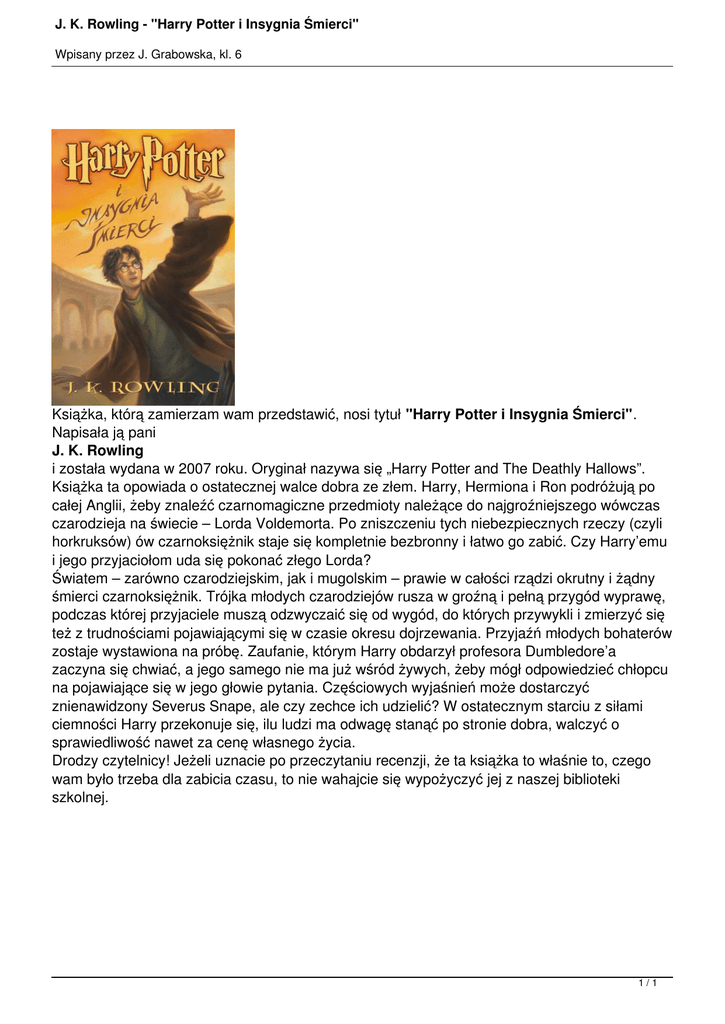 J. K. Rowling - "Harry Potter i Insygnia Śmierci" Wpisany przez J. Grabowska, kl. 6 Książka, którą zamierzam wam przedstawić, nosi tytuł "Harry Potter i Insygnia Śmierci". Napisała ją pani J. K. Rowling i została wydana w 2007 roku. Oryginał nazywa się „Harry Potter and The Deathly Hallows”. Książka ta opowiada o ostatecznej walce dobra ze złem. Harry, Hermiona i Ron podróżują po całej Anglii, żeby znaleźć czarnomagiczne przedmioty należące do najgroźniejszego wówczas czarodzieja na świecie – Lorda Voldemorta. Po zniszczeniu tych niebezpiecznych rzeczy (czyli horkruksów) ów czarnoksiężnik staje się kompletnie bezbronny i łatwo go zabić. Czy Harry’emu i jego przyjaciołom uda się pokonać złego Lorda? Światem – zarówno czarodziejskim, jak i mugolskim – prawie w całości rządzi okrutny i żądny śmierci czarnoksiężnik. Trójka młodych czarodziejów rusza w groźną i pełną przygód wyprawę, podczas której przyjaciele muszą odzwyczaić się od wygód, do których przywykli i zmierzyć się też z trudnościami pojawiającymi się w czasie okresu dojrzewania. Przyjaźń młodych bohaterów zostaje wystawiona na próbę. Zaufanie, którym Harry obdarzył profesora Dumbledore’a zaczyna się chwiać, a jego samego nie ma już wśród żywych, żeby mógł odpowiedzieć chłopcu na pojawiające się w jego głowie pytania. Częściowych wyjaśnień może dostarczyć znienawidzony Severus Snape, ale czy zechce ich udzielić? W ostatecznym starciu z siłami ciemności Harry przekonuje się, ilu ludzi ma odwagę stanąć po stronie dobra, walczyć o sprawiedliwość nawet za cenę własnego życia. Drodzy czytelnicy! Jeżeli uznacie po przeczytaniu recenzji, że ta książka to właśnie to, czego wam było trzeba dla zabicia czasu, to nie wahajcie się wypożyczyć jej z naszej biblioteki szkolnej. 1/1