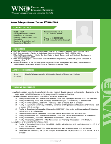 Associate professor Iwona KOWALSKA CONTACT DETAILS WULS - SGGW Faculty of Economic Sciences Department of Education Economics, Communication and Counselling Division of Organization and Economics of Education Nowoursynowska 166 St. 02-787 Warsaw, Poland Phone: + 48 22 5934185 E-mail: iwona_kowalska @sggw.pl EDUCATION • Associate Professor of Economics (Habilitation) – Faculty of Economic Sciences, WULS – SGGW, 2010 • Ph.D. field economics - Faculty of Agricultural Economics, University, WULS – SGGW, 1999 • M.Sc. field administration - Center for the Study of Local Government and Regional Development, University of Warsaw, 1997 • M.Sc. field pedagogics - Revalidation and Rehabilitation Department, School of Special Education in Warsaw, 1994 • Diploma specialized in the following areas: Organization and management education, Revalidation and Rehabilitation Department, School of Special Education in Warsaw, 1994 ACADEMIC POSITIONS Since 01/10/95 School of Warsaw Agricultural University - Faculty of Economics - Professor TEACHING EXPERIENCE 1. Application design expertise to complement the new master's degree majoring in: Economics - Economics of the public sector 2007/2008 (approval of the Departmental Committee on Teaching) 2. Develop education programmes for new fields of study and new courses: 2.1. Faculty of Horticulture and Landscape Architecture, 2003/2004 – pedagogical course – 120 h of exercises 2.2. Faculty of Veterinary, 2005/2006, Pedagogy and methodology – 15 h of lecture, 15 h of exercises 2.3. Faculty of Animal Sciences, 2005/2006 - Pedagogy – 15 h of lecture, 15 h of exercises 2.4. Faculty of Agricultural Economics, 2005/2006, Economics and Organization of Education and Culture – 15 h of lecture, 15 h of exercises 2.5. Faculty of Department of Agricultural Economics, 2006/2007 - Economics and Organization of Education – 15 h of lecture, 30 h of exercises 2.6. Faculty of Environmental Engineering, 2007/2008 – Public Administration – 30 h of lecture 2.7. Faculty of Horticulture and Landscape Architecture, 2007/2008 – Public Administration – 30 h of lecture 2.8. Faculty of Economics, 2007/2008 – Economics of Education – 18 h of lecture 2.9. Faculty of Economics, 2007/2008 – The Management and Financing of Education – 18 h of lecture 3. Adaptation of programs to altered study plans: 3.1. Faculty of Agricultural Economics, 2004/2005 – Public Administration and Local Government – 15 h of lecture, 20 h of exercises 3.2. Faculty of Humanities, 2006/2007 – Public Administration and Local Government – 15 h of lecture 3.3. Department of Economics, 2011/2012 – Expert assessment of EU proposals – 20 h of lecture, 10 h of exercises www.wne.sggw.pl 3.4. Faculty of Horticulture and Landscape Architecture, 2012/2013 – Modern methods and techniques of teaching theory and practice – 90 h of lecture 4. Performing the course: Public administration in college studies "Entrepreneurship and Knowledge Society" held at the Faculty of Economic Sciences Warsaw Agricultural University in the academic year 2010/2011 as an expression of appreciation of experience in the field of public administration and research in the field economics of education and teaching experience in the abovementioned areas. 5. Performing the course (two editions): Local Government Debt in Light of the Public Finance Law Academy under “Local Government Leaders” EU project implemented under the measure 5.2 OP HC, 2007-2013 at the Faculty of Law and Administration at Warsaw University. 6. Performing best-practice of inviting the local government level representative on the lecture on the subject of: Public Administration. The lecture was aimed at students from all fields of study at the Faculty of Economic Sciences, WULS - SGGW. Meeting the local government representative allows students to combine theory with practice, understands the functioning of local government at municipal level (eg in the framework of specialization: economics of the public sector in MA studies). RESEARCH INTERESTS Major interests – education, economics, public finance, political economy; specific problems (chronological approach): standardization of educational costs, the budget task force functions, public finances in the area of education, the absorption of EU funds for development (including human capital) Other interests: financial engineering PUBLICATIONS Habilitation thesis: Public funding of education in the country. Ed. WULS - SGGW, Warsaw 2010, pp. 214 1. Original published creative papers: 1.1.Kowalska I. 1999: Zdecentralizowany system finansowania zadań oświatowych na obszarze gmin wiejskich teraźniejszość i oczekiwania wobec przyszłości. W: Pedagogika i edukacja wobec nadziei i zagrożeń współczesności. Praca zbiorowa pod red. J. Gniteckiego i J. Rutkowiak, Wydawnictwo Instytutu Technologii Eksploatacji, Poznań, s. 78 - 93 1.2.Kowalska I. 1999: Finansowanie zadań oświatowych w gminach wiejskich. W: Procesy dostosowawcze szkolnictwa rolniczego do warunków gospodarki rynkowej. Praca pod red. naukową T. Wieczorka, Fundacja Rozwój SGGW, Warszawa, s. 307 - 314 1.3.Kowalska I. 1999: Inwestowanie w kapitał ludzki w świetle zasad finansowania zadań oświatowych. W: I Międzynarodowe Seminarium Naukowe Studentów i Młodych Pracowników Nauki. Praca pod red. naukową A. Jarosza, Wydawnictwo Naukowe Państwowej Wyższej Szkoły Zawodowej w Jarosławiu, Jarosław, s. 349 - 354 1.4.Kowalska I., Olszewski M., Reca A., Zahorska M. 2000: Analiza wykorzystania środków na oświatę na poziomie samorządu lokalnego i na poziomie szkoły. Seria: Raporty z badań (finansowane ze środków Banku Światowego). Instytut Spraw Publicznych, Warszawa, ss. 59 (współautor w 75%, w tym: metodologia badań w 100% i opracowanie wyników badań w 50%) 1.5.Kowalska I. 2001: Ekonomiczne wyznaczniki perspektyw kształcenia młodzieży wiejskiej, „Roczniki Naukowe Stowarzyszenia Ekonomistó