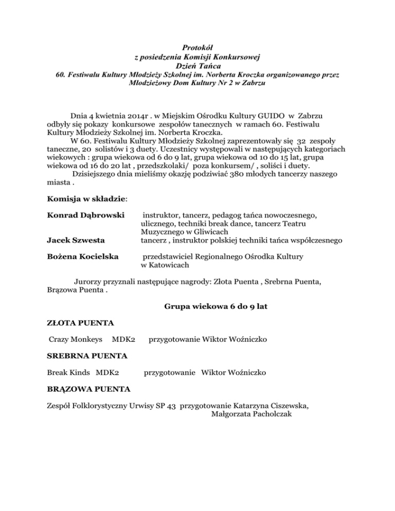 Protokół z posiedzenia Komisji Konkursowej Dzień Tańca 60. Festiwalu Kultury Młodzieży Szkolnej im. Norberta Kroczka organizowanego przez Młodzieżowy Dom Kultury Nr 2 w Zabrzu Dnia 4 kwietnia 2014r . w Miejskim Ośrodku Kultury GUIDO w Zabrzu odbyły się pokazy konkursowe zespołów tanecznych w ramach 60. Festiwalu Kultury Młodzieży Szkolnej im. Norberta Kroczka. W 60. Festiwalu Kultury Młodzieży Szkolnej zaprezentowały się 32 zespoły taneczne, 20 solistów i 3 duety. Uczestnicy występowali w następujących kategoriach wiekowych : grupa wiekowa od 6 do 9 lat, grupa wiekowa od 10 do 15 lat, grupa wiekowa od 16 do 20 lat , przedszkolaki/ poza konkursem/ , soliści i duety. Dzisiejszego dnia mieliśmy okazję podziwiać 380 młodych tancerzy naszego miasta . Komisja w składzie: Konrad Dąbrowski Jacek Szwesta Bożena Kocielska instruktor, tancerz, pedagog tańca nowoczesnego, ulicznego, techniki break dance, tancerz Teatru Muzycznego w Gliwicach tancerz , instruktor polskiej techniki tańca współczesnego przedstawiciel Regionalnego Ośrodka Kultury w Katowicach Jurorzy przyznali następujące nagrody: Złota Puenta , Srebrna Puenta, Brązowa Puenta . Grupa wiekowa 6 do 9 lat ZŁOTA PUENTA Crazy Monkeys MDK2 przygotowanie Wiktor Woźniczko SREBRNA PUENTA Break Kinds MDK2 przygotowanie Wiktor Woźniczko BRĄZOWA PUENTA Zespół Folklorystyczny Urwisy SP 43 przygotowanie Katarzyna Ciszewska, Małgorzata Pacholczak Kategoria wiekowa 10 do 15 lat ZŁOTA PUENTA Chaos Studio Tańca Eska Zabrze przygotowanie Agnieszka Fułek Fantasmagoria Zespół Tańca Nowoczesnego HIP-HOP Salezjański Ośrodek Szkolno-Wychowawczy Tarnowskie Góry przygotowanie Marta Błońska SREBRNA PUENTA Agressive Worms MDK2 przygotowanie W. Woźniczko BRĄZOWA PUENTA Zespół Taneczny Małe Graffiti Centrum Edukacji i Rehabilitacji Zabrze Joanna Adamczyk , Agnieszka Kulpa- Wieczorek Grupa wiekowa od 16 do 20 lat ZŁOTA PUENTA Scena Tańca Za Mgłą Ośrodek Edukacji Baletowej i Tańca Współczesnego Gronex przygotowanie Magdalena Wojnarowicz- Klimas SREBRNA PUENTA Młodzieżowy Teatr Tańca MDK2 przygotowanie Kamila Zduniak BRĄZOWA PUENTA Wydział Rytmiki Państwowa Szkoła Muzyczna I i II stopnia w Zabrzu przygotowanie Ewa Kudełka SOLIŚCI ZŁOTA PUENTA Patrycja Janusek Studio Tańca Ulicznego OPP4 przygotowanie Agata Zeliszek SREBRNA PUENTA Aleksandra Heder Studio Tańca Ulicznego OPP4 przygotowanie Agata Zeliszek BRĄZOWA PUENTA Patrycja Kamińska Studio Tańca Ulicznego OPP4 przygotowanie Agata Zeliszek DUETY ZŁOTA PUENTA Paulina Łaba Marta Stawiarska Ośrodek Edukacji Baletowej i Tańca Współczesnego Gronex przygotowanie Magdalena Wojnarowicz- Klimas SREBRNA PUENTA Daniela Kornas Liliana Kowalska Ośrodek Edukacji Baletowej i Tańca Współczesnego Gronex przygotowanie Karolina Kladziwa Serdecznie dziękujemy wszystkim uczestnikom, nauczycielom i instruktorom za współtworzenie kształtu artystycznego Festiwalu. Dziękuję Dyrekcji udostępnienie sali wraz pracownikom obsługi. Dziękuję Jurorom uczestników Festiwalu. Miejskiego Ośrodka Kultury za ze sprzętem nagłaśniającym oraz za fachowość i obiektywizm w ocenie Wioletta Muzykant Organizator Dnia Tańca Festiwalu 29 kwietnia 2014 r o gody. 17.00 na Koncert Galowy 60. Festiwalu Kultury Młodzieży Szkolnej im. Norberta Kroczka Jury wraz z organizatorami Festiwalu ,kierując się różnorodnością artystyczną zespołów zaprosiło następujących wykonawców : Zespól Folklorystyczny Urwisy SP 43 Crazy Monkeys MDK2 Studio Tańca Eska Chaos Make Some Noise MDK2 Małe Graffiti Centrum Edukacji i Rehabilitacji PSM I i II st. Wydział Rytmiki Scena Tańca Za mgłą Ośrodek Edukacji Baletowej i Tańca Współczesnego Gronex Zespół Mak MDK1 / jako gość specjalny, wieloletni laureat Festiwalu Soliści – Partycja Janusek, Ola Heder, Wojtek Mikociak, Kajetan Owczarek, Dawid oraz dwa duety Ośrodka Edukacji Baletowej i Tańca Współczesnego Gronex.