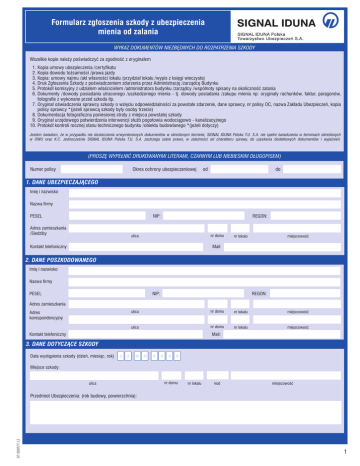 Formularz zgłoszenia szkody z ubezpieczenia mienia od zalania WYKAZ DOKUMENTÓW NIEZBĘDNYCH DO ROZPATRZENIA SZKODY Wszelkie kopie należy poświadczyć za zgodność z oryginałem 1. Kopia umowy ubezpieczenia /certyfikatu 2. Kopia dowodu tożsamości /prawa jazdy 3. Kopia: umowy najmu /akt własności lokalu /przydział lokalu /wypis z księgi wieczystej 4. Druk Zgłoszenia Szkody z poświadczeniem zdarzenia przez Administrację /zarządcę Budynku 5. Protokół komisyjny z udziałem właścicielem /administratora budynku /zarządcy /wspólnoty spisany na okoliczność zalania 6. D okumenty /dowody posiadania utraconego /uszkodzonego mienia - tj. dowody posiadania /zakupu mienia np: oryginały rachunków, faktur, paragonów, fotografie z wykonane przed szkoda itp. 7. O ryginał oświadczenia sprawcy szkody o wzięciu odpowiedzialności za powstałe zdarzenie, dane sprawcy, nr polisy OC, nazwa Zakładu Ubezpieczeń, kopia polisy sprawcy *(jeżeli sprawcą szkody były osoby trzecie) 8. Dokumentacja fotograficzna poniesionej straty z miejsca powstałej szkody 9. Oryginał urzędowego potwierdzenia interwencji służb pogotowia wodociągowo - kanalizacyjnego 10. Protokół kontroli rocznej stanu technicznego budynku /obiektu budowlanego *(jeżeli dotyczy) Jestem świadom, że w przypadku nie dostarczenia w/wymienionych dokumentów w określonym terminie, SIGNAL IDUNA Polska T.U. S.A. nie spełni świadczenia w terminach określonych w OWU oraz K.C. Jednocześnie SIGNAL IDUNA Polska T.U. S.A. zastrzega sobie prawo, w zależności od charakteru sprawy, do uzyskania dodatkowych dokumentów i wyjaśnień. (PROSZĘ WYPEŁNIĆ DRUKOWANYMI LITERAMI, CZARNYM LUB NIEBIESKIM DŁUGOPISEM) Numer polisy Okres ochrony ubezpieczeniowej od do 1. DANE UBEZPIECZAJĄCEGO Imię i nazwisko Nazwa firmy PESEL NIP: Adres zamieszkania /Siedziby Kontakt telefoniczny nr domu ulica REGON: nr lokalu miejscowość Mail: 2. DANE POSZKODOWANEGO Imię i nazwisko Nazwa firmy PESEL NIP: REGON: Adres zamieszkania Adres korespondencyjny Kontakt telefoniczny ulica nr domu nr lokalu miejscowość ulica nr domu nr lokalu miejscowość Mail: 3. DANE DOTYCZĄCE SZKODY Data wystąpienia szkody (dzień, miesiąc, rok) D D M M R R R R Miejsce szkody: ulica nr domu nr lokalu kod miejscowość SIT 0087/??.12 Przedmiot Ubezpieczenia: (rok budowy, powierzchnia): 1 Kto jest właścicielem uszkodzonego mienia? (własne, leasing, inne) 1. Budynków 2. Maszyn i urządzeń *(jeżeli dotyczy) 3. Środków obrotowych *(jeżeli dotyczy) 4. Inne Przyczyna Szkody: Opis zdarzenia: (PROSZĘ WYPEŁNIĆ PONIŻSZĄ TABELĘ) Rodzaj pomieszczenia np. kuchnia, duży pokój, wc,łazienka, przedpokój Wysokość pomieszczenia Powierzchnia okien lub powierzchnia drzwi Sufit Ściana .......................m .......................m .......................m Sufit Ściana .......................m .......................m .......................m Sufit Ściana .......................m .......................m .......................m Sufit Ściana .......................m .......................m Powierzchnia trwałego zacieku (łączna) Położenie zacieku** .......................m Długość x szerokość pomieszczenia (m) Rodzaj wykończenia; Tapeta, farba – podaj kolor farby i rodzaj tapety na; Sufit Ściana Podłoga Rok odnowienia W sytuacji, kiedy wystąpiły uszkodzenia, których nie można wpisać w powyżej umieszczoną tabelę, należy załączyć osobny arkusz z opisem uszkodzonego elementu (mieszkania, budynku, przedmioty itp.) z wskazaniem wieku, rozmiaru uszkodzenia oraz szacunkowej wartości mienia. Szczegółowy opis uszkodzeń: Szacunkowa wartość Szkody: zł Kogo Ubezpieczony powiadomił o zaistniałym zderzeniu? Administracje budynku, Komisariat policji, Inne (prosimy podać nazwę oraz dokładny adres) Nazwa Data powiadomienia: Adres Nazwa Adres **niepotrzebne skreślić 2 Data powiadomienia: Czy Poszkodowany posiada ubezpieczenie przedmiotu szkody w innym Towarzystwie i czy zgłosił tam szkodę? Nie Tak, w TU Działania podjęte przez Ubezpieczonego w celu zmniejszenia szkody: Uwaga: Zgodnie z zapisami OWU, Ubezpieczający nie może zmieniać stanu miejsca i przedmiotu szkody, chyba że zmiana jest niezbędna w celu zmniejszenia szkody lub zabezpieczenia mienia, gdyż Towarzystwo Ubezpieczeń zastrzegło sobie możliwość przeprowadzenia oględzin miejsca i przedmiotu szkód. Oświadczam, że jestem / nie jestem płatnikiem VAT Dyspozycja sposobu wypłaty świadczenia w przypadku ustalenia odpowiedzialności SIGNAL IDUNA Polska T.U. S.A. Przekaz pocztowy na adres Przelew na rachunek, nazwa banku, numer konta Załączniki do zgłoszenia szkody (złożone przez Ubezpieczającego/Poszkodowanego przy zgłaszaniu szkody) 4. OŚWIADCZENIE UBEZPIECZONEGO / POSZKODOWANEGO Oświadczam, że podane dane w niniejszym zgłoszeniu szkody są prawdziwe. Jestem świadomy odpowiedzialności karnej grożącej za udzielenie nieprawdziwych informacji lub zatajenie okoliczności mających istotny wpływ na proces likwidacji szkody. Jestem świadomy, że w razie ustalenia zatajenia okoliczności istotnych dla sprawy, SIGNAL IDUNA Polska może zmniejszyć odszkodowanie lub odmówić jego wypłaty. Jednocześnie upoważniam SIGNAL IDUNA Polska Towarzystwo Ubezpieczeń S. A. oraz wszystkie podmioty, działające na rzecz spółki w celu wykonywania zobowiązań wynikających z umów zawartych ze spółką, do wglądu we wszelką dokumentację związaną z niniejszym zdarzeniem, będącą w szczególności w posiadaniu organów Administracji Państwowej i wymiaru sprawiedliwości, placówek medycznych oraz dokonywania z nich niezbędnych odpisów. Wyrażam zgodę na przetwarzanie moich danych osobowych dla potrzeb niezbędnych do realizacji procesu likwidacji szkodyzgodnie z Ustawą z dn. 29.08.97 o Ochronie Danych Osobowych, Dz. Ust. Nr 133 poz. 883. Zgodnie z art. 6 kodeksu cywilnego „Ciężar udowodnienia faktu spoczywa na osobie, która z tego faktu wywo