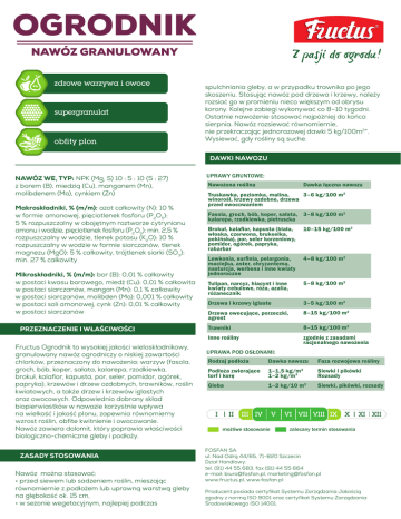 OGRODNIK NAWÓZ GRANULOWANY zdrowe warzywa i owoce supergranulat obfity plon Z pasji do ogrodu! spulchniania gleby, a w przypadku trawnika po jego skoszeniu. Stosując nawóz pod drzewa i krzewy, należy rozsiać go w promieniu nieco większym od obrysu korony. Kolejne zabiegi wykonywać co 8–10 tygodni. Ostatnie nawożenie stosować najpóźniej do końca sierpnia. Nawóz rozsiewać równomiernie, nie przekraczając jednorazowej dawki 5 kg/100m2*. Wysiewać, gdy rośliny są suche. DAWKI NAWOZU NAWÓZ WE, TYP: NPK (Mg, S) 10 : 5 : 10 (5 : 27) z borem (B), miedzią (Cu), manganem (Mn), molibdenem (Mo), cynkiem (Zn) Makroskładniki, % (m/m): azot całkowity (N): 10 % w formie amonowej, pięciotlenek fosforu (P2O5): 5 % rozpuszczalny w obojętnym roztworze cytrynianu amonu i wodzie, pięciotlenek fosforu (P2O5): min. 2,5 % rozpuszczalny w wodzie, tlenek potasu (K2O): 10 % rozpuszczalny w wodzie w formie siarczanów, tlenek magnezu (MgO): 5 % całkowity, trójtlenek siarki (SO3): min. 27 % całkowity Mikroskładniki, % (m/m): bor (B): 0,01 % całkowity w postaci kwasu borowego, miedź (Cu): 0,01 % całkowita w postaci siarczanów, mangan (Mn): 0,1 % całkowity w postaci siarczanów, molibden (Mo): 0,001 % całkowity w postaci soli amonowej, cynk (Zn): 0,01 % całkowity w postaci siarczanów PRZEZNACZENIE I WŁAŚCIWOŚCI Fructus Ogrodnik to wysokiej jakości wieloskładnikowy, granulowany nawóz ogrodniczy o niskiej zawartości chlorków, przeznaczony do nawożenia: warzyw (fasola, groch, bób, koper, sałata, kalarepa, rzodkiewka, brokuł, kalafior, kapusta, por, seler, pomidor, ogórek, papryka), krzewów i drzew ozdobnych, trawników, roślin kwiatowych, a także drzew i krzewów iglastych oraz owocowych. Odpowiednio dobrany skład biopierwiastków w nawozie korzystnie wpływa na wielkość i jakość plonu, zapewnia równomierny wzrost roślin, obfite kwitnienie i owocowanie. Nawóz zawiera dolomit, który poprawia właściwości biologiczno-chemiczne gleby i podłoży. ZASADY STOSOWANIA Nawóz można stosować: • przed siewem lub sadzeniem roślin, mieszając równomiernie z podłożem lub uprawną warstwą gleby na głębokość ok. 15 cm, • w sezonie wegetacyjnym, najlepiej podczas UPRAWY GRUNTOWE: Nawożona roślina Dawka łączna nawozu Truskawka, poziomka, malina, 3–6 kg/100 m2 winorośl, krzewy ozdobne, drzewa przed owocowaniem Fasola, groch, bób, koper, sałata, 3–8 kg/100 m2 kalarepa, rzodkiewka, pietruszka Brokuł, kalafior, kapusta (biała, włoska, czerwona, brukselka, pekińska), por, seler korzeniowy, pomidor, ogórek, papryka, rabarbar 10–15 kg/100 m2 Lewkonia, surfinia, pelargonia, maciejka, aster, chryzantema, nasturcja, werbena i inne kwiaty jednoroczne 4–8 kg/100 m2 Tulipan, narcyz, hiacynt i inne kwiaty cebulowe, róża, azalia, różanecznik 5–8 kg/100 m2 Drzewa i krzewy iglaste 3–5 kg/100 m2 Drzewa owocujące, porzeczki, agrest 8–15 kg/100 m2 Trawniki 8–15 kg/100 m2 Inne rośliny zgodnie z zasadami racjonalnego nawożenia UPRAWA POD OSŁONAMI: Rodzaj podłoża Dawka nawozu Faza rozwojowa rośliny Podłoża zwierające torf i korę 1–1,5 kg/m 1–2 kg/m3 Siewki i pikówki Rozsady Gleba 1–2 kg/10 m2 I II III IV możliwe stosowanie V 3 Siewki, pikówki, rozsady VI VII VIII IX X XI XII zalecany termin stosowania FOSFAN SA ul. Nad Odrą 44/65, 71-820 Szczecin Dział Handlowy: tel. (91) 44 55 683, fax (91) 44 55 664 e-mail: [email protected], [email protected] www.fructus.pl, www.fosfan.pl Producent posiada certyfikat Systemu Zarządzania Jakością zgodny z normą ISO 9001 oraz certyfikat Systemu Zarządzania Środowiskowego ISO 14001.