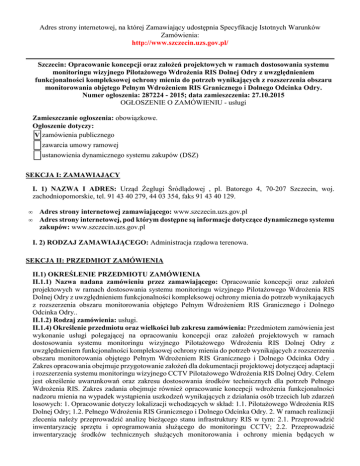 Adres strony internetowej, na której Zamawiający udostępnia Specyfikację Istotnych Warunków Zamówienia: http://www.szczecin.uzs.gov.pl/ Szczecin: Opracowanie koncepcji oraz założeń projektowych w ramach dostosowania systemu monitoringu wizyjnego Pilotażowego Wdrożenia RIS Dolnej Odry z uwzględnieniem funkcjonalności kompleksowej ochrony mienia do potrzeb wynikających z rozszerzenia obszaru monitorowania objętego Pełnym Wdrożeniem RIS Granicznego i Dolnego Odcinka Odry. Numer ogłoszenia: 287224 - 2015; data zamieszczenia: 27.10.2015 OGŁOSZENIE O ZAMÓWIENIU - usługi Zamieszczanie ogłoszenia: obowiązkowe. Ogłoszenie dotyczy: V zamówienia publicznego zawarcia umowy ramowej ustanowienia dynamicznego systemu zakupów (DSZ) SEKCJA I: ZAMAWIAJĄCY I. 1) NAZWA I ADRES: Urząd Żeglugi Śródlądowej , pl. Batorego 4, 70-207 Szczecin, woj. zachodniopomorskie, tel. 91 43 40 279, 44 03 354, faks 91 43 40 129. • • Adres strony internetowej zamawiającego: www.szczecin.uzs.gov.pl Adres strony internetowej, pod którym dostępne są informacje dotyczące dynamicznego systemu zakupów: www.szczecin.uzs.gov.pl I. 2) RODZAJ ZAMAWIAJĄCEGO: Administracja rządowa terenowa. SEKCJA II: PRZEDMIOT ZAMÓWIENIA II.1) OKREŚLENIE PRZEDMIOTU ZAMÓWIENIA II.1.1) Nazwa nadana zamówieniu przez zamawiającego: Opracowanie koncepcji oraz założeń projektowych w ramach dostosowania systemu monitoringu wizyjnego Pilotażowego Wdrożenia RIS Dolnej Odry z uwzględnieniem funkcjonalności kompleksowej ochrony mienia do potrzeb wynikających z rozszerzenia obszaru monitorowania objętego Pełnym Wdrożeniem RIS Granicznego i Dolnego Odcinka Odry.. II.1.2) Rodzaj zamówienia: usługi. II.1.4) Określenie przedmiotu oraz wielkości lub zakresu zamówienia: Przedmiotem zamówienia jest wykonanie usługi polegającej na opracowaniu koncepcji oraz założeń projektowych w ramach dostosowania systemu monitoringu wizyjnego Pilotażowego Wdrożenia RIS Dolnej Odry z uwzględnieniem funkcjonalności kompleksowej ochrony mienia do potrzeb wynikających z rozszerzenia obszaru monitorowania objętego Pełnym Wdrożeniem RIS Granicznego i Dolnego Odcinka Odry . Zakres opracowania obejmuje przygotowanie założeń dla dokumentacji projektowej dotyczącej adaptacji i rozszerzenia systemu monitoringu wizyjnego CCTV Pilotażowego Wdrożenia RIS Dolnej Odry. Celem jest określenie uwarunkowań oraz zakresu dostosowania środków technicznych dla potrzeb Pełnego Wdrożenia RIS. Zakres zadania obejmuje również opracowanie koncepcji wdrożenia funkcjonalności nadzoru mienia na wypadek wystąpienia uszkodzeń wynikających z działania osób trzecich lub zdarzeń losowych: 1. Opracowanie dotyczy lokalizacji wchodzących w skład: 1.1. Pilotażowego Wdrożenia RIS Dolnej Odry; 1.2. Pełnego Wdrożenia RIS Granicznego i Dolnego Odcinka Odry. 2. W ramach realizacji zlecenia należy przeprowadzić analizę bieżącego stanu infrastruktury RIS w tym: 2.1. Przeprowadzić inwentaryzację sprzętu i oprogramowania służącego do monitoringu CCTV; 2.2. Przeprowadzić inwentaryzację środków technicznych służących monitorowania i ochrony mienia będących w posiadaniu UŻŚ; 2.3. Przeprowadzić wywiad z operatorami Centrum RIS w celu pozyskania uwag zebranych w trakcie eksplantacji infrastruktury dostarczonej w ramach Wdrożenia Pilotażowego; 2.4. Weryfikacja dostępności komercyjnych usług telekomunikacyjnych, które mogą posłużyć jako podstawowe lub zapasowe medium transmisji danych - we wszystkich lokalizacjach wchodzących w skład Pilotażowego oraz Pełnego Wdrożenia RIS oraz dodatkowych lokalizacji wytypowanych podczas analizy uwarunkowań w ramach przedmiotowego Zlecenia. 3. Opracowana w ramach Zlecenia dokumentacja techniczna powinna obejmować swym zakresem takie elementy jak: 3.1. Koncepcję modernizacja sprzętowej i oprogramowania podsystemu CCTV dostarczonego w ramach Pilotażowego Wdrożenia RIS wraz z rozszerzeniem o nowe lokalizacje przewidziane Pełnym Wdrożeniem RIS - z podaniem przykładowych konfiguracji dostępnych obecnie na rynku produktów i usług (co najmniej dwa alternatywne rozwiązania); 3.2. Koncepcję wyposażenie wszystkich lokalizacji RIS w sensory kontroli dostępu i ochrony mienia - z podaniem przykładowych konfiguracji dostępnych obecnie na rynku produktów i usług (co najmniej dwa alternatywne rozwiązania); 3.3. Wytypowanie możliwości współpracy z agencjami ochrony mienia i obiektów (co najmniej trzy firmy prowadzące działalność na terenie województwa zachodniopomorskiego); 4. Wycena szacowanych kosztów wdrożenia oraz późniejszej eksploatacji wyszczególnieniem trzech wariantach cenowych: 4.1. Modernizacja oprogramowania systemowego, z wykorzystaniem istniejącej urządzeń (kamer CCTV) oraz doposażeniem nowych lokalizacji; 4.2. Modernizacja oprogramowania systemowego wraz z pełną wymianą zasobów sprzętowych; 4.3. Koszty doposażenia lokalizacji w środki kontroli dostępu i ochrony mienia. 5. Określenie zaleceń dla rutynowych i awaryjnych z rozdzieleniem na: 5.1. Procedury, które mogą być realizowane przez personel Zamawiającego, w tym: 5.1.1. Prowadzenie rutynowej eksploatacji (konfiguracja stref alarmowych, przeglądanie zasobów archiwalnych, wykonywanie kopi zapasowych, itp.); 5.1.2. Monitorowanie statusu zasobów sprzętowych, przeprowadzanie czynności potwierdzających sprawność systemu; 5.1.3. Wykonywanie rutynowych czynności utrzymaniowych (wymiana materiałów eksploatacyjnych, przeglądanie logów systemowych, optymalizacja zasobów dyskowych/bazodanowych, kalibracja urządzeń, itp.). 5.2. Procedury, które z uwagi na stopień trudności lub specyficzne wymagania muszę być realizowane przez podmioty zewnętrzne. 6. Przedmiot Umowy będzie dostarczony do siedziby UŻŚ w Szczecinie przy pl. Batorego 4: 6.1. w wersji papierowej, w języku polskim - 2 egzemplarze; 6.2. wersji elektronicznej na płytach CD/DVD w formacie ed