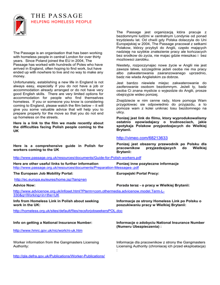 THE PASSAGE HELPING HOMELESS PEOPLE The Passage is an organisation that has been working with homeless people in central London for over thirty years. Since Poland joined the EU in 2004, The Passage has worked with hundreds of Poles who have arrived in England, often hoping to find work, but have ended up with nowhere to live and no way to make any money. Unfortunately, establishing a new life in England is not always easy, especially if you do not have a job or accommodation already arranged or do not have very good English skills. There are very limited options for accommodation for people who find themselves homeless. If you or someone you know is considering coming to England, please watch the film below – it will give you some valuable advice that will help you to prepare properly for the move so that you do not end up homeless on the streets. Here is a link to the film we made recently about the difficulties facing Polish people coming to the UK The Passage jest organizacją która pracuje z bezdomnymi ludźmi w centralnym Londynie od ponad trzydziestu lat. Od chwili gdy Polska dolaczyla do Uni Europejskiej w 2004, The Passage pracował z setkami Polakow, którzy przybyli do Anglii, często mających nadzieję na szybkie znalezienie pracy ale kończacych bez srodkow do zycia, nie majac gdzie mieszkac i bez mozliowsci zarobku. Niestety, rozpoczynajac nowe życie w Anglii nie jest zawsze latwe, szczególnie jeżeli osoba nie ma pracy albo zakwaterowania zaaranzowanego uprzednio, badz nie wlada Anglielskim za dobrze. Jest bardzo niewiele miejsc zakwaterowanie do zaoferowanie osobom bezdomnym. Jeżeli ty, badz osoba Ci znana myslicie o wyjezdzie do Anglii, prosze obejrzyjcie wideo ponizej. Znajdziecie w nim cenne rady, ktore pomoga Wam przygotowac sie odpowiednio do przyjazdu, a to pomoze wam z kolei uniknac losu bezdomnego na ulicy. Ponizej jest link do filmu, ktory wyprodukowalismy ostatnio opowiadajacy o trudnosciach, jakie spotykaja Polakow przyjezdzajacych do Wielkiej Brytanii. http://vimeo.com/68213633 Here is a comprehensive guide in Polish for workers coming to the UK Ponizej jest obszerny przewodnik po Polsku dla pracownikow przyjezdzajacych do Wielkiej Brytanii: http://www.passage.org.uk/resources/documents/Guide-for-Polish-workers.pdf Here are other useful links to further information Ponizej inne pozyteczne informacje http://www.passage.org.uk/resources/documents/Preparation-Messages-.pdf The European Job Mobility Portal: Europejski Portal Pracy: http://ec.europa.eu/eures/home.jsp?lang=en Advice Now: Porada teraz - o pracy w Wielkiej Brytanii: http://www.advicenow.org.uk/infoset.html?Pterm=com.othermedia.advicenow.model.Term-L330&q=Working+in+the+UK Info from Homeless Link in Polish about seeking work in the UK: Informacje ze strony Homeless Link po Polsku o poszukiwaniu pracy w Wielkiej Brytanii: http://homeless.org.uk/sites/default/files/recsforjobseekersPOL.doc Info on getting a National Insurance Number: Informacje o zdobyciu National Insurance Number (Numeru Ubezpieczenia) : http://www.hmrc.gov.uk/nic/work/ni-uk.htm Worker information from the Gangmasters Licensing Authority: http://gla.defra.gov.uk/Publications/Worker-Publications/ Informacje dla pracownikow z strony the Gangmasters Licensing Authority (chroniacej ich przed eksploatacja) :