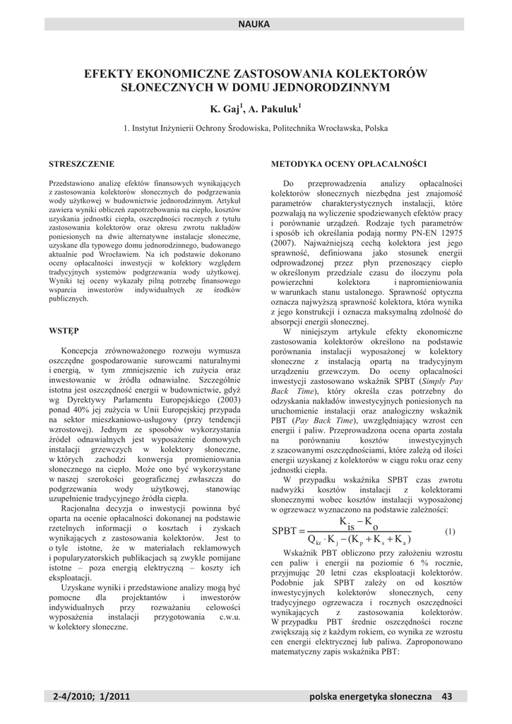 EFEKTY EKONOMICZNE ZASTOSOWANIA KOLEKTORÓW SŁONECZNYCH W DOMU JEDNORODZINNYM K. Gaj1, A. Pakuluk1 1. Instytut Inynierii Ochrony rodowiska, Politechnika Wrocławska, Polska STRESZCZENIE METODYKA OCENY OPŁACALNOCI Przedstawiono analiz efektów finansowych wynikaj cych z zastosowania kolektorów słonecznych do podgrzewania wody uytkowej w budownictwie jednorodzinnym. Artykuł zawiera wyniki oblicze zapotrzebowania na ciepło, kosztów uzyskania jednostki ciepła, oszczdnoci rocznych z tytułu zastosowania kolektorów oraz okresu zwrotu nakładów poniesionych na dwie alternatywne instalacje słoneczne, uzyskane dla typowego domu jednorodzinnego, budowanego aktualnie pod Wrocławiem. Na ich podstawie dokonano oceny opłacalnoci inwestycji w kolektory wzgldem tradycyjnych systemów podgrzewania wody uytkowej. Wyniki tej oceny wykazały piln potrzeb finansowego wsparcia inwestorów indywidualnych ze rodków publicznych. Do przeprowadzenia analizy opłacalnoci kolektorów słonecznych niezbdna jest znajomo parametrów charakterystycznych instalacji, które pozwalaj na wyliczenie spodziewanych efektów pracy i porównanie urz dze. Rodzaje tych parametrów i sposób ich okrelania podaj normy PN-EN 12975 (2007). Najwaniejsz cech kolektora jest jego sprawno, definiowana jako stosunek energii odprowadzonej przez płyn przenosz cy ciepło w okrelonym przedziale czasu do iloczynu pola powierzchni kolektora i napromieniowania w warunkach stanu ustalonego. Sprawno optyczna oznacza najwysz sprawno kolektora, która wynika z jego konstrukcji i oznacza maksymaln zdolno do absorpcji energii słonecznej. W niniejszym artykule efekty ekonomiczne zastosowania kolektorów okrelono na podstawie porównania instalacji wyposaonej w kolektory słoneczne z instalacj opart na tradycyjnym urz dzeniu grzewczym. Do oceny opłacalnoci inwestycji zastosowano wskanik SPBT (Simply Pay Back Time), który okrela czas potrzebny do odzyskania nakładów inwestycyjnych poniesionych na uruchomienie instalacji oraz analogiczny wskanik PBT (Pay Back Time), uwzgldniaj cy wzrost cen energii i paliw. Przeprowadzona ocena oparta została na porównaniu kosztów inwestycyjnych z szacowanymi oszczdnociami, które zale od iloci energii uzyskanej z kolektorów w ci gu roku oraz ceny jednostki ciepła. W przypadku wskanika SPBT czas zwrotu nadwyki kosztów instalacji z kolektorami słonecznymi wobec kosztów instalacji wyposaonej w ogrzewacz wyznaczono na podstawie zalenoci: WSTP Koncepcja zrównowaonego rozwoju wymusza oszczdne gospodarowanie surowcami naturalnymi i energi , w tym zmniejszenie ich zuycia oraz inwestowanie w ródła odnawialne. Szczególnie istotna jest oszczdno energii w budownictwie, gdy wg Dyrektywy Parlamentu Europejskiego (2003) ponad 40% jej zuycia w Unii Europejskiej przypada na sektor mieszkaniowo-usługowy (przy tendencji wzrostowej). Jednym ze sposobów wykorzystania ródeł odnawialnych jest wyposaenie domowych instalacji grzewczych w kolektory słoneczne, w których zachodzi konwersja promieniowania słonecznego na ciepło. Moe ono by wykorzystane w naszej szerokoci geograficznej zwłaszcza do podgrzewania wody uytkowej, stanowi c uzupełnienie tradycyjnego ródła ciepła. Racjonalna decyzja o inwestycji powinna by oparta na ocenie opłacalnoci dokonanej na podstawie rzetelnych informacji o kosztach i zyskach wynikaj cych z zastosowania kolektorów. Jest to o tyle istotne, e w materiałach reklamowych i popularyzatorskich publikacjach s zwykle pomijane istotne – poza energi elektryczn – koszty ich eksploatacji. Uzyskane wyniki i przedstawione analizy mog by pomocne dla projektantów i inwestorów indywidualnych przy rozwaaniu celowoci wyposaenia instalacji przygotowania c.w.u. w kolektory słoneczne. K SPBT = −K is o Q kr ⋅ K j − (K p + K s + K a ) (1) Wskanik PBT obliczono przy załoeniu wzrostu cen paliw i energii na poziomie 6 % rocznie, przyjmuj c 20 letni czas eksploatacji kolektorów. Podobnie jak SPBT zaley on od kosztów inwestycyjnych kolektorów słonecznych, ceny tradycyjnego ogrzewacza i rocznych oszczdnoci wynikaj cych z zastosowania kolektorów. W przypadku PBT rednie oszczdnoci roczne zwikszaj si z kadym rokiem, co wynika ze wzrostu cen energii elektrycznej lub paliwa. Zaproponowano matematyczny zapis wskanika PBT: " PBT = K is − K o , 20 i 1 3 − − ¦ [(1,06) (Q kr ⋅ c1 + K st − Pp ⋅ 10 ⋅ ⋅ d1)] i =1 − (K s + K a ) 20 (2) Opłacalno przeanalizowano równie na podstawie wyników oblicze kosztów uzyskania jednostki ciepła za pomoc rónych systemów grzewczych i paliw. DOBÓR KOLEKTORÓW Dobrano dwa rozwi zania typowych systemów z kolektorami słonecznymi, przeznaczonych do podgrzewania wody uytkowej. Systemy wyposaone były alternatywnie w kolektory płaskie lub prónioworurowe oferowane przez dwie wiod ce w tej dziedzinie firmy. Podstaw doboru elementów instalacji było roczne zapotrzebowanie na ciepło oraz dane z ogólnodostpnych ofert tych firm. Obliczenia zapotrzebowania mocy wykonano na przykładzie aktualnie budowanego domu jednorodzinnego w Szewcach k. Wrocławia. Jest to typowy dom wolnostoj cy, parterowy z uytkowym poddaszem, przeznaczony dla 4 osobowej rodziny (powierzchnia uytkowa - 151 m2, kubatura - 664 m3). Dom posiada dach dwuspadowy o jednej połaci skierowanej na południe (rys. 1). Kolektory płaskie Zapotrzebowanie na powierzchni absorbera w przypadku płaskiego kolektora o redniorocznej sprawnoci ηk = 40 % i powierzchni pojedynczego absorbera w zestawie 2,32 m2 wynosi: Qkt·(qr·ηk)-1 = 4,03 m2 Na tej podstawie przyjto dwa kolektory j.w., które zapewni powinny rzeczywisty roczny uzysk energetyczny na poziomie Qkr = 2047 kWh (co stanowi 69% pokrycia zapotrzebowania). Kolektory pró niowo-rurowe W przypadku kolektorów próniowo-rurowych minimalny, gwarantowany przez producenta, roczny uzysk energii z 1 m2 absorbera wynosi 525 kWh, a powierzchnia pojedynczego absorbera w zestawie – 1,93 m2. W oparciu o te dane przyjto dwa kolektory j.w. Za