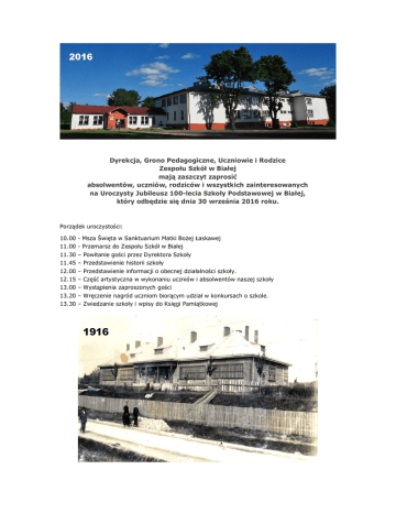 Dyrekcja, Grono Pedagogiczne, Uczniowie i Rodzice Zespołu Szkół w Białej mają zaszczyt zaprosić absolwentów, uczniów, rodziców i wszystkich zainteresowanych na Uroczysty Jubileusz 100-lecia Szkoły Podstawowej w Białej, który odbędzie się dnia 30 września 2016 roku. Porządek uroczystości: 10.00 11.00 11.30 11.45 12.00 12.15 13.00 - Msza Święta w Sanktuarium Matki Bożej Łaskawej - Przemarsz do Zespołu Szkół w Białej – Powitanie gości przez Dyrektora Szkoły – Przedstawienie historii szkoły – Przedstawienie informacji o obecnej działalności szkoły. – Część artystyczna w wykonaniu uczniów i absolwentów naszej szkoły – Wystąpienia zaproszonych gości 13.20 – Wręczenie nagród uczniom biorącym udział w konkursach o szkole. 13.30 – Zwiedzanie szkoły i wpisy do Księgi Pamiątkowej