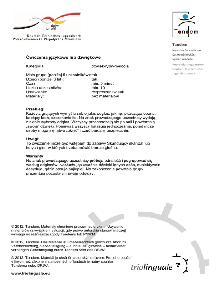 Tandem Ćwiczenia językowe lub dźwiękowe Kategoria: dźwięk-rytm-melodia Mała grupa (poniżej 5 uczestników): tak Dzieci (poniżej 6 lat): tak Czas: min. 5 minut Liczba uczestników: min. 10 Ustawienie: rozproszeni w sali Materiały: bez materiałów Przebieg: Każdy z grających wymyśla sobie jakiś odgłos, jak np. piszcząca opona, kapiący kran, szczekanie itd. Na znak prowadzącego uczestnicy wydają z siebie wybrany odgłos. Wszyscy przechadzają się po sali i powtarzają „swoje” dźwięki. Ponieważ wszyscy hałasują jednocześnie, pojedyncze osoby mogą się łatwo „ukryć” i czuć bardziej bezpiecznie. Uwagi: To ćwiczenie może być wstępem do zabawy Skandujący skandal lub innych gier, w których trzeba mówić bardzo głośno. Warianty: Na znak prowadzącego uczestnicy próbują odnaleźć i pogrupować się według odgłosów. Nasłuchując uważnie dźwięki innych osób, subiektywnie decydują, gdzie pasują najlepiej. Na zakończenie powstałe grupy prezentują pozostałym swoje odgłosy. © 2012, Tandem. Materiały chronione prawem autorskim. Używanie materiałów (z wyjątkiem sytuacji, gdy prawo autorskie stanowi inaczej) wymaga wcześniejszej zgody Tandemu lub PNWM. © 2012, Tandem. Das Material ist urheberrechtlich geschützt. Abdruck, Veröffentlichung, Vervielfältigung – auch auszugsweise – bedarf einer vorherigen Genehmigung durch Tandem oder das DPJW. © 2012, Tandem. Materiál je chráněn autorským právem. Pro jeho použití v jiných než zákonem stanovených případech je nutný souhlas Tandemu nebo DPJW. www.triolinguale.eu Koordinační centrum česko-německých výměn mádeže Koordinierungszentrum Deutsch-Tschechischer Jugendaustausch