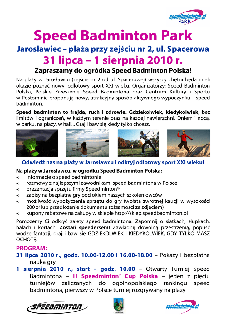 Speed Badminton Park Jarosławiec – plaża przy zejściu nr 2, ul. Spacerowa 31 lipca – 1 sierpnia 2010 r. Zapraszamy do ogródka Speed Badminton Polska! Na plaży w Jarosławcu (zejście nr 2 od ul. Spacerowej) wszyscy chętni będą mieli okazję poznać nowy, odlotowy sport XXI wieku. Organizatorzy: Speed Badminton Polska, Polskie Zrzeszenie Speed Badmintona oraz Centrum Kultury i Sportu w Postominie proponują nowy, atrakcyjny sposób aktywnego wypoczynku – speed badminton. Speed badminton to frajda, ruch i zdrowie. Gdziekolwiek, kiedykolwiek, bez limitów i ograniczeń, w każdym terenie oraz na każdej nawierzchni. Dniem i nocą, w parku, na plaży, w hali... Graj i baw się kiedy tylko chcesz. Odwiedź nas na plaży w Jarosławcu i odkryj odlotowy sport XXI wieku! Na plaży w Jarosławcu, w ogródku Speed Badminton Polska: • informacje o speed badmintonie • rozmowy z najlepszymi zawodnikami speed badmintona w Polsce • prezentacja sprzętu firmy Speedminton® • zapisy na bezpłatne gry pod okiem naszych szkoleniowców • możliwość wypożyczenia sprzętu do gry (wpłata zwrotnej kaucji w wysokości 200 zł lub przedłożenie dokumentu tożsamości ze zdjęciem) • kupony rabatowe na zakupy w sklepie http://sklep.speedbadminton.pl Pomożemy Ci odkryć zalety speed badmintona. Zapomnij o siatkach, słupkach, halach i kortach. Zostań speedersem! Zawładnij dowolną przestrzenią, popuść wodze fantazji, graj i baw się GDZIEKOLWIEK i KIEDYKOLWIEK, GDY TYLKO MASZ OCHOTĘ. PROGRAM: 31 lipca 2010 r., godz. 10.00-12.00 i 16.00-18.00 – Pokazy i bezpłatna nauka gry 1 sierpnia 2010 r., start – godz. 10.00 – Otwarty Turniej Speed Badmintona – II Speedminton® Cup Polska – jeden z pięciu turniejów zaliczanych do ogólnopolskiego rankingu speed badmintona, pierwszy w Polsce turniej rozgrywany na plaży II Speedminton® Cup Polska 1 sierpnia 2010 r., Jarosławiec Ogłoszenie Organizatorzy: Centrum Kultury i Sportu w Postominie, Polskie Zrzeszenie Speed Badmintona, Speed Badminton Polska Miejsce: Plaża przy zejściu nr 2 (zejście dla os. niepełnosprawnych, ul. Spacerowa) w Jarosławcu Data: 1 sierpnia 2010 r. Program: Początek: godz. 10:00 Lotki: Lotki MATCH firmy Speedminton® Rakiety: Rakiety Speedminton®, długość: 57-61cm, waga: 155-180g Boisko: Oryginalne wymiary boiska do speed badmintona (dwa kwadraty, każdy o boku 5,5m w odległości 12,8m - bez siatki) Nawierzchnia: Piasek Kategorie: singiel kobiet singiel mężczyzn singiel seniorów (40+) singiel juniorów (poniżej 16 lat) * * Uwaga: kategoria jest tworzona, gdy zgłosi się min. 6 uczestników System rozgrywek: Zależnie od ilości zgłoszeń, rozgrywki grupowe i prosty system KO Zasady uczestnictwa: Zapraszamy wszystkich zainteresowanych. Uczestnik turnieju może startować tylko w jednej konkurencji Opłata startowa: Uczestnictwo bezpłatne Zasady rozgrywek: Reguły dla speed badmintona według standardów DSBV 2010. Dostępne na stronie: www.dsbv.net Rejestracja: On-line na stronie: www.speedbadminton.pl , w zakładce „turnieje” lub w dniu turnieju od godz. 9.30 Adres do kontaktu: Speed Badminton Polska ul. Przy Parku 12, O5-080 Lipków tel. +48 606 66 18 04 e-mail: [email protected] Osoba do kontaktu: Lidia Pomirska e-mail: [email protected] Kierownictwo turnieju: Filip Wróblewski Agnieszka Czarnuch Różne: Organizatorzy rezerwują sobie prawo do zmian lub odwołania rozgrywek. Rejestrując się uczestnik akceptuje ustalenia zawarte w ogłoszeniu Lipków, lipiec 2010, Speed Badminton Polska Notka prasowa: Speed Badminton Park Jarosławiec 2010 - to propozycja aktywnego wypoczynku dla każdego, kto w dniach 31 lipca – 1 sierpnia 2010 r. zaplanował pobyt na plaży w JAROSŁAWCU. Organizatorzy: Speed Badminton Polska, Polskie Zrzeszenie Speed Badmintona oraz Centrum Kultury i Sportu w Postominie zapraszają do aktywnej zabawy – gry w speed badmintona. Speed badminton jako dyscyplina sportowa został zarejestrowany w Niemczech w 2002 roku. Sport ten można uprawiać bez względu na porę dnia i panujące warunki atmosferyczne. Gra ta łączy w sobie najlepsze cechy tenisa, badmintona i squasha. Innowacyjne rozwiązania techniczne zastrzeżone pod nazwą Speedminton® dotyczą sprzętu używanego w tej grze. Dzięki odpowiedniej budowie lotka charakteryzuje się wysoką stabilnością na wietrze, a specjalnie skonstruowane lekkie rakiety z silnym naciągiem nadają jej prędkość do 290km/h. Całkowitą nowością jest możliwość gry w ciemności przy zastosowaniu świecących lotek. Wielką zaletą speed badmintona jest pełna mobilność i uniwersalność terenowa. Nie potrzeba siatki, słupków, boiska, kortu. Grać można gdziekolwiek i kiedykolwiek – w parku, w hali, na plaży, na śniegu. Pole gry da się wyznaczyć niemal w każdym miejscu i na wiele sposobów: patykiem na piasku, kredą na asfalcie, taśmą na trawie lub plaży. Speed badminton nie wymaga specjalnych umiejętności, jest łatwy jak kometka, dynamiczny jak tenis oraz szybki jak squash. Wszystko to sprawia, iż wyraźnie wzrasta popularność i masowość tej formy aktywności fizycznej na świecie. Zgodnie z programem, każdy odwiedzający Speed Badminton Park Jarosławiec 2010 będzie mógł skorzystać z bezpłatnej nauki gry w speed badmintona pod opieką wykwalifikowanych instruktorów oraz obejrzeć w akcji najlepszych polskich zawodników, notowanych w międzynarodowym rankingu. Profesjonalny sprzęt firmy Speedminton GmbH oraz najlepsi szkoleniowcy czekać będą na wszystkich chętnych w ogródku Speed Badminton Polska na plaży w Jarosławcu w dniach 31 lipca – 1 sierpnia 2010 r. Zwycięzcy turnieju: „II Speedminton® Cup Polska” otrzymają puchary i nagrody ufundowane przez organizatorów. Speed badminton to nie tylko sport - to przede wszystkim zdrowy styl życia i modna gra towarzyska. Szczegółowe informacje dotyczące imprezy: www.speedbadminton.pl www.postomino.pl Serdecznie zaprasza