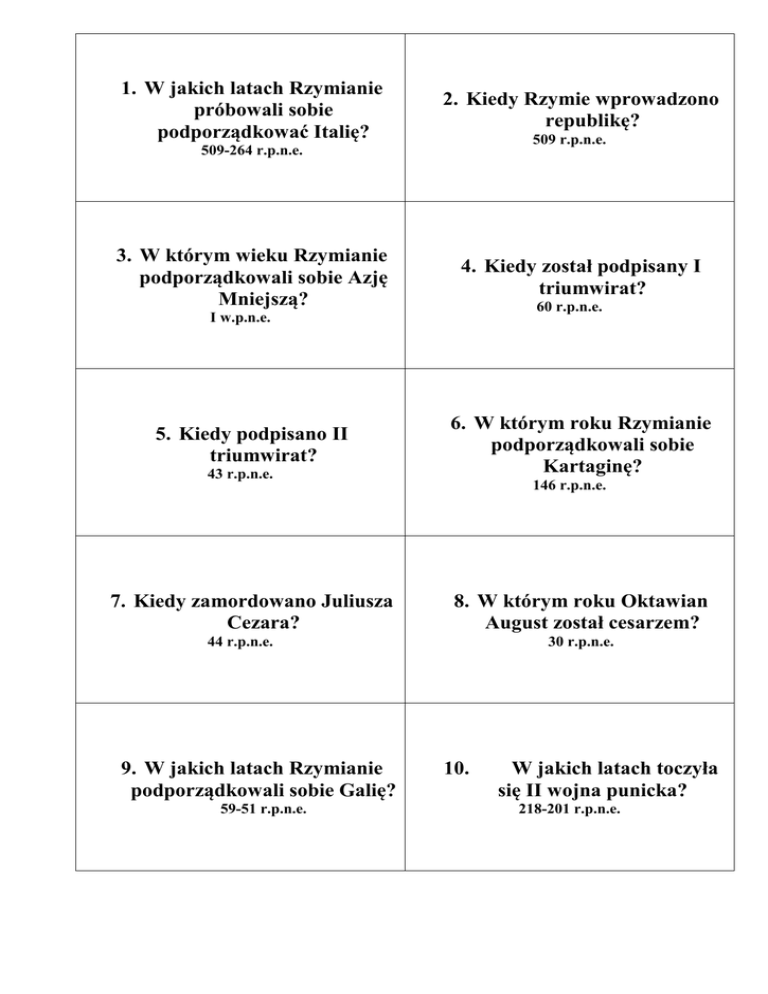 1. W jakich latach Rzymianie próbowali sobie podporządkować Italię? 2. Kiedy Rzymie wprowadzono republikę? 509 r.p.n.e. 509-264 r.p.n.e. 3. W którym wieku Rzymianie podporządkowali sobie Azję Mniejszą? 4. Kiedy został podpisany I triumwirat? 60 r.p.n.e. I w.p.n.e. 5. Kiedy podpisano II triumwirat? 43 r.p.n.e. 7. Kiedy zamordowano Juliusza Cezara? 6. W którym roku Rzymianie podporządkowali sobie Kartaginę? 146 r.p.n.e. 8. W którym roku Oktawian August został cesarzem? 44 r.p.n.e. 9. W jakich latach Rzymianie podporządkowali sobie Galię? 59-51 r.p.n.e. 30 r.p.n.e. 10. W jakich latach toczyła się II wojna punicka? 218-201 r.p.n.e. 11. W jakich latach toczyła się I wojna punicka? 12. 264-241 r.p.n.e 13. W którym roku Juliusz Cezar pokonał Pompejusza pod Farsalos? 30 r.p.n.e. 14. W którym roku Scypion Afrykański wygrał bitwę pod Zamą? 48 r.p.n.e. 15. W którym roku Hannibal pokonał Rzymian pod Kannami? 202 r.p.n.e. 16. W którym roku Rzymianie podporządkowali sobie Egipt? 216 r.p.n.e. 17. W którym roku Rzymianie podporządkowali sobie Grecję? 31 r.p.n.e. 18. 31 r.p.n.e. W jakich latach toczyła się III wojna punicka? 149-146 r.p.n.e. 146 r.p.n.e. 19. W którym roku Rzymianie zwyciężyli pod Akcjum? Kiedy w Rzymie upadła Republika? 20. W którym roku Juliusz Cezar pokonał Galów pod Alezją? 52 r.p.n.e. 21. W którym roku Rzymianie zdobyli Sycylię, Sardynię i Korsykę? 22. W którym roku Rzymianie zdobyli półwysep Iberyjski? 241 r.p.n.e. 23. W którym roku stłumiono powstanie Spartakusa? 201 r.p.n.e. 24. Kiedy nastąpił upadek republiki i początek cesarstwa rzymskiego? 71 r.p.n.e. 25. Kto i kiedy ustanowił pryncypat? 30 r. p.n.e. 26. Oktawian August 30 r.p.n.e. 27. Kiedy nastąpił koniec podboju Italii przez Rzym? 264 r. p.n.e. 29. Na podstawie decyzji, którego z cesarzy rzymskich chrześcijaństwo stało się religią panującą w Rzymie? Edyktu Teodozjusza Wielkiego. Jaka data wyznacza koniec cesarstwa zachodniorzymskiego? 476 r. n.e. 28. Kiedy Chrześcijaństwo stało się religią panującą w Rzymie? 392 r. n.e. 30. Kiedy miał miejsce Najazd Gotów na imperium rzymskie i zdobycie Rzymu? 410 r.n.e. 31. W wyniku, jakich działań Rzymianie podbili półwysep iberyjski (Hiszpania)? II wojny punickiej. 33. Jakim wydarzeniem zakończyła się III wojna punicka? 32. Jakie ziemie opanowali Rzymianie w wyniku I wojny punickiej? Podbój Sycylii, Sardynii i Korsyki. 34. Kiedy miał miejsce najazd Galów i zdobycie Rzymu? Zburzeniem Kartaginy. 35. Kiedy nastąpiło wygnanie ostatniego króla rzymskiego Tarkwiniusza Pysznego? 389 r.p.n.e. Kiedy nastąpił podział cesarstwa rzymskiego na wschodniorzymskie i zachodniorzymskie? 36. 509 r. p.n.e 37. Kto dokonał podziału cesarstwa rzymskiego na wschodniorzymskie i zachodniorzymskie? 395 r. n.e. 38. Kto dokonał podboju Egiptu? Oktawian August. Cesarz Teodozjusz Wielki. Który z cesarzy rzymskich nadał chrześcijanom te same prawa, co wyznawcom innych religii? 40. 39. Kiedy został podpisany Edykt mediolański? 313 r. n.e. Konstantyn Wielki. 41. Kiedy miało miejsce Powstanie Spartakusa? 73-71 r.p.n.e. 42. Jaka warstwa społeczna w Rzymie wywołała powstanie Spartakusa? Gladiatorzy i niewolnicy. Pod wodzą Attyli wodza zwanego „biczem bożym” organizowali najazdy na Imperium Rzymskie w V w.n.e. Uważani za wysłanników piekieł. 44. 43. Podaj datę legendarnego założenia Rzymu. 753 r. p.n.e. Hunowie. 45. Wykarmiła legendarnych bliźniaków Romulusa i Remusa. 46. Apenińskim. Wilczyca. 47. Rzym znajduje się nad rzeką? 48. Na nie dzieliła się armia rzymska. Legiony Rzym obecnie jest stolicą…. Włoch. Tyber. 49. Rzym znajduje się na Półwyspie… 50. Jak nazywa się zjazd biskupów? Sobór. 51. Ustrój polityczny wprowadzony przez Oktawiana Augusta. 52. Niewolników (gladiatorów). Pryncypat. 53. Niewolnicy szkoleni do walki na arenie to... 54. 56. Akwedukty. 57. Rzymska łaźnia publiczna to...? Termy. 59. Za pierwszy zbiór prawa rzymskiego uznaje się…? Prawo XII tablic. Powstanie Spartakusa zakończyło się… Klęską. Gladiatorzy. 55. Wodociągi doprowadzające wodę do miast rzymskich to…? W I w. p.n.e. wybuchło w Rzymie powstanie…? Oglądano w nim walki gladiatorów, walki dzikich zwierząt i walki ludzi z dzikimi zwierzętami.? Amfiteatr. 58. Na nie podzielone były legiony rzymskie. Manipuły. 60. Kodeks praw spisany w VI w.n.e. na polecenie cesarza Justyniana to…? Kodeks Justyniana. 61. Miasta na terenie Imperium Rzymskiego były połączone doskonałymi drogami, które zbiegały się w Rzymie stąd powstało powiedzenie…? 62. Nazywano tak najważniejsze pomieszczenie w domu rzymskim. Na środku znajdował się basen z wodą. Atrium „Wszystkie drogi prowadzą do Rzymu” 63. Wewnętrzny dziedziniec domu rzymskiego otoczony kolumnami z ogrodem. 64. Perystyl 65. Lud, który zamieszkiwał północ półwyspu Apeninińskiego to…? Limes 66. Wzorem w dziedzinie kultury byli dla Rzymian…? Grecy Etruskowie 67. Tak nazywano Punijczyków, mieszkańców Kartaginy. Kartagińczycy 69. O tym zwycięstwie mówimy, gdy poniesione straty przewyższają uzyskane korzyści. Pyrrusowe zwycięstwo. Jak nazywane były umocnienia na granicy cesarstwa rzymskiego? 68. W 389 r.p.n.e. najechali i zdobyli Rzym. Pokonani w bitwie pod Alezją w 52r.p.n.e. przez Juliusza Cezara. Galowie 70. Upadek znaczenia władzy cesarskiej, najazdy plemion germańskich, podział imperium, wielka wędrówka ludów to przyczyny? Kryzysu cesarstwa rzymskiego. 71. Rodzaj bramy wznoszony dla upamiętnienia wybitnej osoby lub ważnego wydarzenia. 72. Rządy Oktawiana Augusta zakończyły w Rzymie okres…? Republiki Łuk triumfalny 73. Wzrost znaczenia wodzów rzymskich popieranych przez legiony, niezadowolenie plebejuszy z rządów senatu, wojny domowe, to przyczyny? 74. Lud podbity przez cesarza Trajana w II w.n.e. Pochodzili z dzisiejszej Rumunii. Dakowie Kryzysu republiki rzymskiej. 75. Lud barbarzyński przy