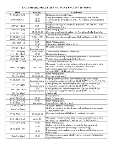 KALENDARZ PRACY ZSE NA ROK SZKOLNY 2015/2016 Data 01.09.2015 [wt] Godzina 9:00 8.09.2015 [wt] 12:00 14:00 12.09.2015 [so] 8:00 14.09.2015 [pn] 17:00 17:00-19:00 19:00 9:00, 15:00 9:00 9:00 12:00 Wg harmonogramu 17:00-19:00 17:00 Wg planu Wg planu --- 17.09.2015 [czt] 05.10.2015 [pn] 06.10. 2015[wt] 14.10. 2015 [śr] 10.10.2015 [sb] 18.11.2015 [śr] 21.11.2015 [sb] grudzień 2015 22.12.2015 [wt] 23.12.-31.12.2015 08.01.2016 [pt] 12.01.2016 [wt] 13.01.2016 [śr] 14.01.2016 [czt] 15.01.2016 [pt] 16.01-26.02.2016 15.01.2016 [pt] 18-31. 01.2016 08.02.2016 [pn] 01.03.2016 [wt] 03.03.2016 [czt] 24-29. 03. 2016 30.03.2016 [śr] 07.04.2016 [czt] Rada Pedagogiczna. Powiatowe obchody DEN w ZSzE Bieg dla Szymona. Śródokresowe zebrania z rodzicami. Koncert dla Szymona Rekolekcje (lub inny termin po uzgodnieniu z katechetami). Wigilie klasowe, rekolekcje (jeden dzień). Zimowa przerwa świąteczna. Ostateczny termin wystawienia ocen i poinformowania o nich uczniów klas młodzieżowych oraz ostateczny termin do 15:00 zakończenia egzaminów i wystawienia ocen w klasie III LO dla Dorosłych. 17:00 Rada Pedagogiczna. 17:00-19:00 Zebrania z rodzicami. Wg Część pisemna egzaminu potwierdzającego kwalifikacje harmonogramu w zawodzie- sesja poprawkowa dla kl. II-IV TE, TL, Ti, TS, TH. Wg Część praktyczna egzaminu potwierdzającego kwalifikacje harmonogramu w zawodzie- sesja poprawkowa dla kl. II-IV TL, TS. Wg Część praktyczna egzaminu potwierdzającego kwalifikacje harmonogramu w zawodzie- sesja poprawkowa dla kl. II-IV TE, TH, Ti. Studniówka --Ferie zimowe. 17:00 Rada Pedagogiczna. 17:00 Rada Pedagogiczna. Wg planu Święto Szkoły (lekcje + apel). --Wiosenna przerwa świąteczna. Odbiór dyplomów potwierdzających kwalifikacje w zawodzie - sesja poprawkowa. Zebrania z rodzicami (dla klas 4 – ostatnie zebrania). 17:00-19:00 25.04.2016 [pn] do 15:00 26.04.2016 [wt] 17:00 10:30 28.04.2016 [czt] 11:30 29.04.2016 [pt] Wydarzenie Rozpoczęcie roku szkolnego. Część pisemna egzaminu potwierdzającego kwalifikacje w zawodzie dla kwalifikacji A. 65, A. 36 (kurs kwalifikacyjny) s. luster Rozpoczęcie zajęć w szkole dla dorosłych- klasa III LO i kurs kwalifikacyjny A. 65 Rada Pedagogiczna. Zebrania z rodzicami i wybory do Prezydium Rady Rodziców. Zebranie Rady Rodziców. Egzaminy zawodowe praktyczne dla kwalifikacji: A. 65, A. 36 13:00 Ostateczny termin wystawienia ocen i poinformowania o nich uczniów klas maturalnych i słuchaczy LO dla Dorosłych. Rada Pedagogiczna Ogłoszenie wyników ukończenia szkoły. Przypomnienie procedur egzaminów maturalnego i zawodowego. Próba uroczystości zakończenia szkoły (po próbie absolwenci mierzą togi). Uroczystość pożegnania absolwentów (po uroczystości dalsze zajęcia wg planu). 24.06.2016 [pt] Egzamin maturalny część ustna. Egzamin maturalny część pisemna Praktyka zawodowa klasy III technik ekonomista (III Ei) Praktyka zawodowa klasy III technik informatyk i logistyk --(III Ei, III Li) 17:00- 18:00 Zebrania z rodzicami. 18:00 Rada Pedagogiczna Ostateczny termin wystawienia ocen i poinformowania o nich do 14:00 uczniów oraz rodziców. Wg Część pisemna egzaminu potwierdzającego kwalifikacje harmonogramu w zawodzie -kl. II- IV. Etap pisemny egzaminu potwierdzającego kwalifikacje 12:00 zawodowe dla absolwentów technikum-egzamin poprawkowy. do 9:00 Składanie wniosków o egzaminy klasyfikacyjne. 15:00 Rada Pedagogiczna. Etap praktyczny egzaminu potwierdzającego kwalifikacje Wg planu zawodowe dla absolwentów technikum- egzamin poprawkowy. Wg planu Egzaminy klasyfikacyjne. Wg Część praktyczna egzaminu potwierdzającego kwalifikacje harmonogramu w zawodzie kl. II-IV TL, TS Wg Część praktyczna egzaminu potwierdzającego kwalifikacje harmonogramu w zawodzie kl. II- IV TE, Ti, TH. Uroczystość zakończenia roku szkolnego. 9:00 5. 07.2016 [wt] od godz. 12:00 Odbiór świadectw dojrzałości. 9.-21.05.2016 4.- 24.05.2016 02.05.-10.06. 2016 16.05.-10.06.2016 23.05.2016 [pn] 16.06.2016 [czt] 17.06.2016[ pt] 20.06.2016 [pn] 20.06.2016 [pn] 20.06.2016 [pn] 21-22.06.2016 [wt,śr] 21-22.06.2016 [wt, śr] 23.06.2016 [czt] 30.05.-4.07. 2016 Wg planu Wg planu --- 23.08.2016 [wt] 24.08.2016 [śr] 25-26.08.2016 [czt,pt] 9:00 9:00 Wg planu 26.08.2016 [pt] od 13:00 01.09.2016 [czt] 9:00 Poprawkowe, pisemne egzaminy maturalne. Poprawkowe, ustne egzaminy maturalne. Egzaminy poprawkowe. Odbiór dyplomów potwierdzających kwalifikacje zawodowe i kwalifikacje w zawodzie. Rozpoczęcie roku szkolnego 2016/2017.