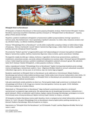 Olimpijski Dzień na Narodowym 29 listopada na Stadionie Narodowym w Warszawie pojawią olimpijskie atrakcje. Polski Komitet Olimpijski i Stadion Narodowy zapraszają wszystkich miłośników sportów zimowych na "Olimpijski Dzień na Narodowym" - imprezę jakiej w Polsce jeszcze nie było. Wspólnie z polskimi medalistami olimpijskimi w łyżwiarstwie szybkim przeprowadzimy treningi i opowiemy o technice jazdy. Nasi bohaterowie z Soczi opowiedzą o tajnikach sukcesów: Co zrobić, żeby z łyżwiarza amatora stać się członkiem kadry, a w efekcie medalistą olimpijskim? Podczas "Olimpijskiego Dnia na Narodowym" coś dla siebie znajdą także sympatycy hokeja na lodzie (obecni będą olimpijczycy - Mariusz Czerkawski i Leszek Tokarz) i łyżwiarstwa figurowego, a także chętni do próby rozpędzenia bobsleja (pomoże olimpijczyk Dawid Kupczyk). Dla amatorów "białych sportów" przygotowaliśmy pięć stref odpowiadających zimowym dyscyplinom olimpijskim. Będą to: łyżwiarstwo szybkie, biathlon, łyżwiarstwo figurowe, hokej na lodzie, sporty saneczkowe i bobsleje. W programie znajdą się także gry i zabawy, konkursy z nagrodami, konkurencje sprawnościowe, spotkania z medalistami, prezentacja sprzętu, warsztaty edukacji olimpijskiej oraz wystawa zdjęć z Zimowych Igrzysk Olimpijskich w Soczi. Całość dopełnią rozmowy z polskimi medalistami olimpijskimi ostatnich zimowych igrzysk. Nie zabraknie także Stref: Edukacji i Nadziei Olimpijskich, a także popisów wrotkarzy i rolkarzy. Jedną z największych atrakcji "Olimpijskiego Dnia na Narodowym" będzie trening przeprowadzony przez samego mistrza olimpijskiego w łyżwiarstwie szybkim z Soczi - Zbigniewa Bródkę! Udzieli on cennych wskazówek wszystkim miłośnikom tego sportu. Jak się uczyć, to od mistrza, więc nie można tego przegapić! Bezpłatne wejściówki na Olimpijski Dzień na Narodowym są do odebrania w internetowym Sklepie Stadionu Narodowego pod adresem sklep.stadionnarodowy.org.pl. Każda osoba może otrzymać maksymalnie cztery bilety. Ich liczba jest ograniczona. Warunkiem wejścia na Olimpijski Dzień na Narodowym jest posiadanie wydrukowanego biletu lub biletu w telefonie komórkowym. Cała pula wejściówek została podzielna na dwie tury. Pierwsi goście będą mogli uczestniczyć w atrakcjach dnia olimpijskiego od 9:30 do 11:30. Druga tura również trwa dwie godziny i kończy się o godz. 13:30. Dokładna informacja znajduje się na każdym bilecie. Wejściówki na "Olimpijski Dzień na Narodowym" dają możliwość uczestniczenia wyłącznie w atrakcjach wymienionych w programie tego wydarzenia. Nie upoważniają one do bezpłatnego korzystania z lodowisk oraz z górek lodowych. Bilety na lodowiska i górki lodowe, będące częścią Zimowego Narodowego są dostępne na stronie internetowej www.zimowynarodowy.pl. Będzie można je kupić również na miejscu, w kasach. 29 listopada na Stadion Narodowy można wejść dowolną z bram a następnie przez sekcje kołowrotów wskazaną na bilecie: B, C lub D. Dla gości Olimpijskiego Dnia na Narodowym otwarty będzie płatny parking zewnętrzny, na błoniach Stadionu Narodowego. Bilety do kupienia na miejscu. Zapraszamy na "Olimpijski Dzień Na Narodowym" już 29 listopada. Przyjdź i spotkaj Zbigniewa Bródkę! Warto być razem z nami! www.olimpijski.pl/top Foto i grafika: Szymon Sikora