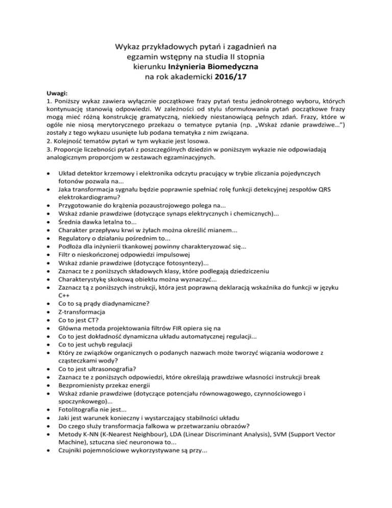 Wykaz przykładowych pytań i zagadnień na egzamin wstępny na studia II stopnia kierunku Inżynieria Biomedyczna na rok akademicki 2016/17 Uwagi: 1. Poniższy wykaz zawiera wyłącznie początkowe frazy pytań testu jednokrotnego wyboru, których kontynuację stanowią odpowiedzi. W zależności od stylu sformułowania pytań początkowe frazy mogą mieć różną konstrukcję gramatyczną, niekiedy niestanowiącą pełnych zdań. Frazy, które w ogóle nie niosą merytorycznego przekazu o tematyce pytania (np. „Wskaż zdanie prawdziwe…”) zostały z tego wykazu usunięte lub podana tematyka z nim związana. 2. Kolejność tematów pytań w tym wykazie jest losowa. 3. Proporcje liczebności pytań z poszczególnych dziedzin w poniższym wykazie nie odpowiadają analogicznym proporcjom w zestawach egzaminacyjnych. Układ detektor krzemowy i elektronika odczytu pracujący w trybie zliczania pojedynczych fotonów pozwala na... Jaka transformacja sygnału będzie poprawnie spełniać rolę funkcji detekcyjnej zespołów QRS elektrokardiogramu? Przygotowanie do krążenia pozaustrojowego polega na... Wskaż zdanie prawdziwe (dotyczące synaps elektrycznych i chemicznych)... Średnia dawka letalna to... Charakter przepływu krwi w żyłach można określić mianem... Regulatory o działaniu pośrednim to... Podłoża dla inżynierii tkankowej powinny charakteryzować się... Filtr o nieskończonej odpowiedzi impulsowej Wskaż zdanie prawdziwe (dotyczące fotosyntezy)... Zaznacz te z poniższych składowych klasy, które podlegają dziedziczeniu Charakterystykę skokową obiektu można wyznaczyć... Zaznacz tą z poniższych instrukcji, która jest poprawną deklaracją wskaźnika do funkcji w języku C++ Co to są prądy diadynamiczne? Z-transformacja Co to jest CT? Główna metoda projektowania filtrów FIR opiera się na Co to jest dokładność dynamiczna układu automatycznej regulacji... Co to jest uchyb regulacji Który ze związków organicznych o podanych nazwach może tworzyć wiązania wodorowe z cząsteczkami wody? Co to jest ultrasonografia? Zaznacz te z poniższych odpowiedzi, które określają prawdziwe własności instrukcji break Bezpromienisty przekaz energii Wskaż zdanie prawdziwe (dotyczące potencjału równowagowego, czynnościowego i spoczynkowego)... Fotolitografia nie jest... Jaki jest warunek konieczny i wystarczający stabilności układu Do czego służy transformacja falkowa w przetwarzaniu obrazów? Metody K-NN (K-Nearest Neighbour), LDA (Linear Discriminant Analysis), SVM (Support Vector Machine), sztuczna sieć neuronowa to... Czujniki pojemnościowe wykorzystywane są przy... Jakie właściwości systemu biologicznego wynikają z występowania w modelu biocybernetycznym schematu ze sprzężeniem zwrotnym określonego rodzaju (dodatnim lub ujemnym)? Czym się charakteryzują skutki deterministyczne działania promieniowania jonizującego na organizm... Jakie typy detektorów są najczęściej używane w dozymetrii indywidualnej... Realizacja obszarów półprzewodnikowych o określonym typie przewodnictwa odbywa się na drodze... Zaznacz tę z poniższych odpowiedzi, która określa prawdziwą własność dziedziczenia wielokrotnego Cechą znamienną sygnału analogowego jest Jakie metody pomiaru przepływu stosowane są w badaniu wydolności układu oddechowego? Które z poniższych stwierdzeń dotyczących procesu trawienia mokrego przy produkcji czujników MEMS jest prawdziwe... Jakie równanie ruchu określa wymuszone drgania tłumione układu o jednym stopniu swobody? Co to jest binaryzacja? Główną składową prądu tranzystora bipolarnego jest/są... Porównując detektory półprzewodnikowe wykonane z różnych materiałów można powiedzieć, że Cienkie membrany w technologii MEMS wykonuje się... Detektory półprzewodnikowe stosowane w detekcji promieniowania X mogą być wykorzystywane do pomiaru... Różnica napięć na dwóch diodach krzemowych pracujących z różną gęstością prądu w zakresie temperatur 250 K - 350 K charakteryzuje się... Filtry IIR Jaki jest wzajemny kierunek przepływu krwi i płynu dializacyjnego w dializatorze? Na czym polega rozszerzenie możliwości diagnostycznych oferowanych przez wektokardiografię w porównaniu do elektrokardiografii? Modelem matematycznym obrazu analogowego jest Wskaż warunek pętli nieskończonej w języku C++ Co to jest otwarcie? Efekt modulacji długości kanału w tranzystorze MOS związany jest z... W systemach ze sprzężeniem zwrotnym występuje niestabilność. Od czego zależy możliwość jej pojawienia się? Które z poniższych stwierdzeń dotyczących chromatografii jest prawdziwe ... Jaki sposób planowania leczenia jest wykorzystywany w technice IMRT (Intensity-Modulated Radiation Therapy)... Dyskretna transformacja Fouriera Poniżej temperatury Tg termoplasty są materiałami... Jaki rodzaj dyspersji występuje w światłowodach jednomodowych... Co to jest przesuniecie wirtualne? Jakie kolimatory są wykorzystywane w technice IMRT (Intensity-Modulated Radiation Therapy)... Jak definiowany jest ruch płaski? Podłoże/skaffold w inżynierii tkankowej to... Co mówi zasada superpozycji Główną składową prądu tranzystora NMOS pracującego w silnej inwersji jest/są... Ułożenie atomów w krysztale idealnym jest uwarunkowane... Ze względu na właściwości reologiczne krew należy do grupy cieczy... Głównym prawem (zadaniem) układu regulacji jest... Co to jest ruchliwość mechanizmu? Zaznacz te z poniższych odpowiedzi, które określają prawdziwe własności instrukcji continue Klirens nerkowy... W typowaniu dawcy do transplantacji wątroby istotna jest; Które z podanych zdań odnoszących się do reagentów elektrofilowych jest prawdziwe? Zaznacz tą z poniższych odpowiedzi, która określa prawdziwe własności dziedziczenia chronionego Głównymi osiami bezwładności nie są… Rusztowania kompozytowe; polimerowo-ceramiczne stosuje się do wypełniania ub