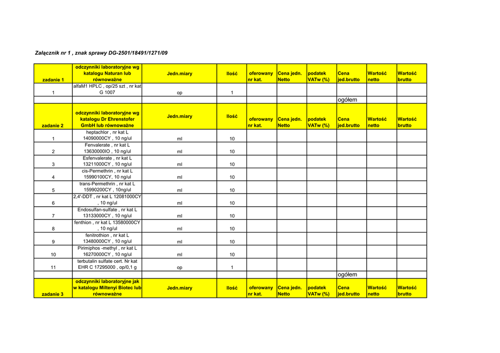 Załącznik nr 1 , znak sprawy DG-2501/18491/1271/09 zadanie 1 1 odczynniki laboratoryjne wg katalogu Naturan lub równowaŜne alfaM1 HPLC , op/25 szt , nr kat G 1007 Jedn.miary Ilość op 1 oferowany Cena jedn. nr kat. Netto podatek VATw (%) Cena jed.brutto Wartość netto Wartość brutto Wartość netto Wartość brutto Wartość netto Wartość brutto ogółem 11 odczynniki laboratoryjne wg katalogu Dr Ehrenstofer GmbH lub równowaŜne heptachlor , nr kat L 14090000CY , 10 ng/ul Fenvalerate , nr kat L 13630000IO , 10 ng/ul Esfenvalerate , nr kat L 13211000CY , 10 ng/ul cis-Permethrin , nr kat L 15990100CY, 10 ng/ul trans-Permethrin , nr kat L 15990200CY , 10ng/ul 2,4'-DDT , nr kat L 12081000CY , 10 ng/ul Endosulfan-sulfate , nr kat L 13133000CY , 10 ng/ul fenthion , nr kat L 13580000CY , 10 ng/ul fenitrothion , nr kat L 13480000CY , 10 ng/ul Pirimiphos -methyl , nr kat L 16270000CY , 10 ng/ul terbutalin sulfate cert. Nr kat EHR C 17295000 , op/0,1 g zadanie 3 odczynniki laboratoryjne jak w katalogu Miltenyi Biotec lub równowaŜne zadanie 2 1 2 3 4 5 6 7 8 9 10 Jedn.miary Ilość ml 10 ml 10 ml 10 ml 10 ml 10 ml 10 ml 10 ml 10 ml 10 ml 10 op 1 oferowany Cena jedn. nr kat. Netto podatek VATw (%) Cena jed.brutto ogółem Jedn.miary Ilość oferowany Cena jedn. nr kat. Netto podatek VATw (%) Cena jed.brutto 1 Goat Anti-mouse IgG Microbeads , nr kat 130-048401 ,op/2 ml zadanie 4 odczynniki laboratoryjne jak w katalogu VMRD lub równowaŜne 1 Mouse Mab anti-bovine granulocytes ( G1 cluster)+ endothelium , 1 mg/ml , nr kat MM20A op 1 ogółem Jedn.miary Ilość op 1 oferowany Cena jedn. nr kat. Netto podatek VATw (%) Cena jed.brutto Wartość netto Wartość brutto Wartość netto Wartość brutto ogółem zadanie 5 odczynniki laboratoryjne jak w katalogu Fermentas lub równowaŜne 1 Gene ruler TM , 100bp , DNA Ladder , nr kat SM0244 , 250(5x50) concentration 0,1 op 1 2 enzym Bam HI , nr kat ER0052 szt 1 3 Enzym HindIII, nr kat ER0502 szt 1 szt 1 op 3 op 2 op 2 op 1 op 1 op 4 op 1 op 1 4 5 6 7 8 9 10 11 12 enzym restrykcyjny FastDigest SpeI , nr kat FD1254 enzym restrykcyjny XhoI (2000 U) , nr kat ER0691 enzym restrykcyjny Eco721 (2000 U) , nr kat ER0361 dNTP Mix 25 mM , 1 ml/op , nr kat R1122 10 X Taq Buffer with (NH4) 2 SO4 , # B33,5 ml , (5x1 ml) 10 X Tag buffer with KCI , #B38 , 5 ml (5x1 ml ) Rnasin Ribonuclease Inhibitor , nr kat E00382 TrueStar Taq DNA Polymerase , 5x500 , nr kat EP0613 Taq DNA Polymerase , 10x500 u , nr kat EP0406 Jedn.miary Ilość oferowany Cena jedn. nr kat. Netto podatek VATw (%) Cena jed.brutto ogółem zadanie 6 1 2 3 4 odczynniki laboratoryjne jak w katalogu Qiagen lub równowaŜne QiaEX II Gel Extracion Kit (150) , nr kat 20021 QIAquick Gel Extraction Kit , nr kat 28706 Plasmid Midi Kit , nr kat 12145 Rnase-Free Dnase Set , nr kat 79254 Jedn.miary Ilość szt 1 szt 1 szt 1 szt 1 oferowany Cena jedn. nr kat. Netto podatek VATw (%) Cena jed.brutto Wartość netto Wartość brutto Wartość netto Wartość brutto Wartość netto Wartość brutto Wartość netto Wartość brutto ogółem zadanie 7 1 odczynniki laboratoryjne jak w katalogu Prona lub równowaŜne Agarosa Plus (op/100 g) , nr kat P100 , Jedn.miary Ilość op 1 oferowany Cena jedn. nr kat. Netto podatek VATw (%) Cena jed.brutto ogółem 1 odczynniki laboratoryjne jak w katalogu Bio-Rad lub równowaŜne Lambda Ladder Standard , nr kat 170-3635 2 agar Listeria according to Ottaviani Agosti , nr kat 356 4043 ,op/500 g zadanie 8 Jedn.miary Ilość szt 1 op 2 oferowany Cena jedn. nr kat. Netto podatek VATw (%) Cena jed.brutto ogółem 1 odczynniki laboratoryjne jak w katalogu Sigma Aldrich lub równowaŜne Lysosyme from chicken egg white L6876 , op/5 g op 1 2 Ethylenediaminetetraacetic acid disodium salt , op/50 g , nr kat E5134 ,op/50 g op 1 3 sodium dodecyl sulfate solution (SDS) 10 % , nr kat 71736-100 ML op 1 zadanie 9 Jedn.miary Ilość oferowany Cena jedn. nr kat. Netto podatek VATw (%) Cena jed.brutto 4 Agarose for pulsed field electrophoresis running gell op/100g , nr kat A2929-100g op 1 5 Phenol TE-saturated for molecular biology , nr kat 77607250ML op 1 6 chloroform :izoamyl alcohol (24:1) mixture for molecular biology , nr kat 25666 op 1 7 Ammonium-iron(III) cirate , brown , nr kat 09714 ,op/50 g op 1 8 Anti-Rabbit IgG (whole molecule)-FITC antibody produced in goat , dokumenty: certyfikat z datą waŜności odczynnika , karta charakterystyki w j.polskim , op/1 ml , nr kat F0382 op 1 op 1 op 1 op 1 op 1 op 1 12 mapenterol hydrochloride cert. Nr kat FL-49358 , op/5 mg trisma hydrochloride , nr kat T3253 , op/250 g pyrogallol , nr kat 254002 , op/50 mg urea 98 ± % , nr kat U-5378 , op/500 mg 13 serva-temed (tetramethylethylenediamine) , nr kat 35925.01 , op/100 ml zadanie 10 odczynniki laboratoryjne jak w katalogu Agilent lub równowaŜne 9 10 11 ogółem 1 2 kolumna , nr kat 959990-902 APCI/APPI calibrant solution , nr kat G2432A Jedn.miary Ilość szt 1 op 1 oferowany Cena jedn. nr kat. Netto podatek VATw (%) Cena jed.brutto ogółem Wartość netto Wartość brutto zadanie 11 odczynniki laboratoryjne jak w katalogu Oxoid lub równowaŜne 3 Brillant Green Bile 2 % (Broth) , nr kat CM 0031 , op/500 g EC Broth , nr kat CM 0853 , op/500 g SET-RPLA toin detection kit , nr kat TD0900 zadanie 12 odczynniki laboratoryjne jak w katalogu J.Baker lub równowaŜne 1 1-butanol Ultra Resi analyzed , nr kat 8017.1000,op/1 l zadanie 13 odczynniki laboratoryjne jak w katalogu gibco lub równowaŜne 1 glutamine 200 mM x 100 liquid , nr kat 25230-024 ,op/100 ml 1 2 Jedn.miary Ilość op 1 op 2 op 1 oferowany Cena jedn. nr kat. Netto podatek VATw (%) Cena jed.brutto Wartość netto Wartość brutto Wartość netto Wartość brutto Wartość netto Wartość brutto Wartość netto Wartość brutto Wartość netto Wartość brutto ogółem Jedn.miary Ilość op 1 oferowany Cena jedn. nr kat. Netto podatek VATw (%) Cena jed.brutto ogółem Jedn.miary Ilość op 1 oferowany Cena jedn. nr kat. Netto podatek VATw (%)