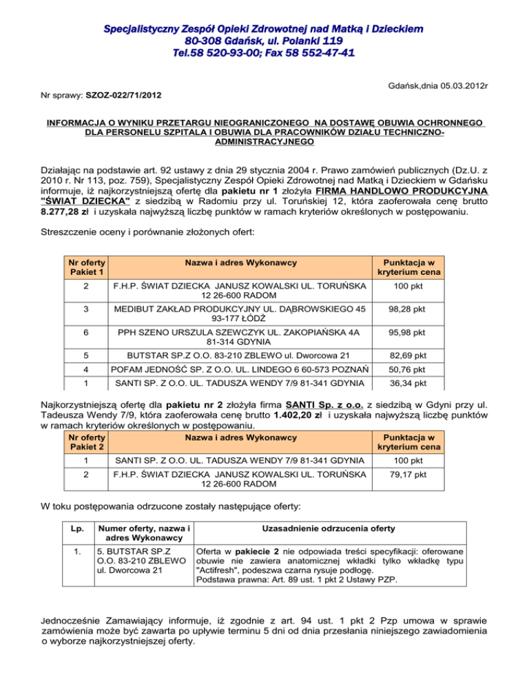 Specjalistyczny Zespół Opieki Zdrowotnej nad Matką i Dzieckiem 80-308 Gdańsk, ul. Polanki 119 Tel.58 520-93-00; Fax 58 552-47-41 Gdańsk,dnia 05.03.2012r Nr sprawy: SZOZ-022/71/2012 INFORMACJA O WYNIKU PRZETARGU NIEOGRANICZONEGO NA DOSTAWĘ OBUWIA OCHRONNEGO DLA PERSONELU SZPITALA I OBUWIA DLA PRACOWNIKÓW DZIAŁU TECHNICZNOADMINISTRACYJNEGO Działając na podstawie art. 92 ustawy z dnia 29 stycznia 2004 r. Prawo zamówień publicznych (Dz.U. z 2010 r. Nr 113, poz. 759), Specjalistyczny Zespół Opieki Zdrowotnej nad Matką i Dzieckiem w Gdańsku informuje, iż najkorzystniejszą ofertę dla pakietu nr 1 złożyła FIRMA HANDLOWO PRODUKCYJNA "ŚWIAT DZIECKA" z siedzibą w Radomiu przy ul. Toruńskiej 12, która zaoferowała cenę brutto 8.277,28 zł i uzyskała najwyższą liczbę punktów w ramach kryteriów określonych w postępowaniu. Streszczenie oceny i porównanie złożonych ofert: Nr oferty Pakiet 1 Nazwa i adres Wykonawcy Punktacja w kryterium cena 2 F.H.P. ŚWIAT DZIECKA JANUSZ KOWALSKI UL. TORUŃSKA 12 26-600 RADOM 100 pkt 3 MEDIBUT ZAKŁAD PRODUKCYJNY UL. DĄBROWSKIEGO 45 93-177 ŁÓDŹ 98,28 pkt 6 PPH SZENO URSZULA SZEWCZYK UL. ZAKOPIAŃSKA 4A 81-314 GDYNIA 95,98 pkt 5 BUTSTAR SP.Z O.O. 83-210 ZBLEWO ul. Dworcowa 21 82,69 pkt 4 POFAM JEDNOŚĆ SP. Z O.O. UL. LINDEGO 6 60-573 POZNAŃ 50,76 pkt 1 SANTI SP. Z O.O. UL. TADUSZA WENDY 7/9 81-341 GDYNIA 36,34 pkt Najkorzystniejszą ofertę dla pakietu nr 2 złożyła firma SANTI Sp. z o.o. z siedzibą w Gdyni przy ul. Tadeusza Wendy 7/9, która zaoferowała cenę brutto 1.402,20 zł i uzyskała najwyższą liczbę punktów w ramach kryteriów określonych w postępowaniu. Nr oferty Pakiet 2 Nazwa i adres Wykonawcy Punktacja w kryterium cena 1 SANTI SP. Z O.O. UL. TADUSZA WENDY 7/9 81-341 GDYNIA 100 pkt 2 F.H.P. ŚWIAT DZIECKA JANUSZ KOWALSKI UL. TORUŃSKA 12 26-600 RADOM 79,17 pkt W toku postępowania odrzucone zostały następujące oferty: Lp. 1. Numer oferty, nazwa i adres Wykonawcy 5. BUTSTAR SP.Z O.O. 83-210 ZBLEWO ul. Dworcowa 21 Uzasadnienie odrzucenia oferty Oferta w pakiecie 2 nie odpowiada treści specyfikacji: oferowane obuwie nie zawiera anatomicznej wkładki tylko wkładkę typu "Actifresh", podeszwa czarna rysuje podłogę. Podstawa prawna: Art. 89 ust. 1 pkt 2 Ustawy PZP. Jednocześnie Zamawiający informuje, iż zgodnie z art. 94 ust. 1 pkt 2 Pzp umowa w sprawie zamówienia może być zawarta po upływie terminu 5 dni od dnia przesłania niniejszego zawiadomienia o wyborze najkorzystniejszej oferty. Powyższą informację wywieszono na tablicy ogłoszeń, stronie internetowej www.szozmd.pl Specjalistycznego Zespołu Opieki Zdrowotnej nad Matką i Dzieckiem w Gdańsku oraz wysłano listem poleconym do wszystkich uczestników postępowania w dniu 05.03.2012r.