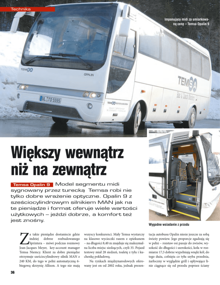 Temat Technika Imponujący midi za umiarkowaną cenę – Temsa Opalin 9 Większy wewnątrz niż na zewnątrz Temsa Opalin 9 Model segmentu midi sygnowany przez turecką Temsa robi nie tylko dobre wrażenie optyczne. Opalin 9 z sześciocylindrowym silnikiem MAN jak na te pieniądze i format oferuje wiele wartości użytkowych – jeździ dobrze, a komfort też jest znośny. Z a takie pieniądze dostaniecie gdzie indziej dobrze rozbudowanego Sprintera – mówi podczas rozmowy Jean-Jacques Meyer, key-account manager Temsa Niemcy. Klient za dobre pieniądze otrzymuje sześciocylindrowy silnik MAN z 240 KM, do tego w pełni automatyczną 6biegową skrzynię Allison. A tego nie mają 36 wszyscy konkurenci. Mały Temsa wystarczy na klasowe wycieczki razem z opiekunem – na długości 8,40 m znajduje się maksymalna liczba miejsc siedzących, czyli 35. Pojazd testowy miał 28 siedzeń, toaletę z tyłu i kuchenkę pokładową. Na rynkach międzynarodowych oferowany jest on od 2002 roku, jednak prezen- Wygodne wsiadanie z przodu tacja autobusu Opalin niesie jeszcze za sobą świeży powiew. Jego proporcje zgadzają się w pełni – rozstaw osi pasuje do zwisów, wysokość do długości i szerokości, koła w rozmiarze 17,5 dobrze wypełniają wnęki kół, do tego duża, cofnięta co tyłu szyba przednia, żarłoczny w wyglądzie grill i opływające linie ciągnące się od przodu poprzez ściany boczne do tyłu. Budowa pojazdu nie zawiera wielu elementów ozdobnych. Midi z Adana nie musi ukrywać się przed swoją droższą konkurencją, gdyż swój design zawdzięcza Bobowi Lee, a to bez wątpienia znak jakości w branży. A co jeśli chodzi o jakość? – Autobus jest wtedy autobusem, jeśli swój silnik ma z tyłu – tak prowokacyjnie wyraża się wielu praktyków. Opalin nie pasuje do tego myślenia, silnik ma z przodu. Mały sześciocylindrowy silnik MAN znajduje się delikatnie z lewej strony nad osią przednią i razem z automatem Allison równomiernie obciąża obie osie. Przez to tył może być dodatkowym bagażnikiem, jeśli nie ma tam toalety, to jest nawet sporo przestrzeni. Z drugiej strony może to spowodować utrudniony dostęp do silnika – w warsztacie trzeba odsłonić napęd. Klient Opalina nie musi martwić się o przeładowanie pojazdu, które często występuje w tym segmencie pojazdów. Cały pojazd waży 8460 kg – rezerwy tego pojazdu o dopuszczalnej masie całkowitej 12,5 t wystarczą na wszystkie możliwe warunki. Skromne wnętrze jest wyjątkowo przestrzenne. Szerokie siedzenia Kiel zapewniają duży komfort w czasie podróży, tylko wąskie przejście pośrodku jest oznaką tego, że nawet Adana nie jest cudotwórcą. 28 pasażerów znajdzie tu wygodne miejsca, choć może cztery miejsca przed toaletą z tyłu są mniej pożądane. Jednak wbudowanie toalety w tylny prawy róg jest świetnym rozwiązaniem, choć jej wypukłe kształty nie oszczędzają sporo miejsca. Powierzchnie pokryte są raczej tanim tworzywem sztucznym o niezbyt wysokiej jakości. Opalin jest jednak pojazdem użytkowym a nie limuzyną – wszystko ma swoją cenę. Z drugiej strony ma on wszystko, czego klient mógłby oczekiwać po midi. Konwektory razem z ogrzewaniem dachu (opcjonalnym) grzeją dobrze, a latem chłodzi klimatyzacja dachu o mocy 16 kW. Dzięki stabilizatorom na dwóch osiach zakręty pokonuje z nieznacznym przechyleniem. Zawieszenie jest znośne, nawet jeśli pojazd jeździ pusty. Choć nie jest to może komfort porównywalny z tym, jaki oferuje Mercedes Tourino. Opalin ze swoją długością 8,40 m idealnie wpasowuje się w wąskie ulice. Jest zwinny i łatwy w prowadzeniu, chociaż średnica koła skrętu wypada o 2 m gorzej niż w Tourino. Na pozytywną ocenę zasługuje zintegrowany retarder skrzyni Allison, który przejmuje sporo opóźnień, a nie wymaga hamulców kół. Hamulce kół pracują całkiem nieźle, chociaż bez ESP – a to chybiony pomysł. A jeszcze odnośnie komfortu podróżujących, na tylnej osi monitujemy narastający hałas ogumienia dla transportu regionalnego (typ LDR Continental). Powiew nostalgii. Niezbyt nowe rozwiązanie prezentuje miejsce pracy kierowcy. Odnajdą się tu od razu kierowcy MAN – ogromna kierownica (z półki MAN) regulowana jest za pomocą dwóch śrub radełkowanych, dla wysokich kierowców może być ona zbyt głęboko osadzona. Siedzenie kierowcy nie należy do pierwszej klasy jakości, jego pas bezpieczeństwa zacina się już po kilku kilometrach. Przejrzysta deska pochodzi z leciwej wersji ciężarówki MAN – co jednak nie musi być wadą. Kto dziś zamówi nowego Opalina, otrzyma 250-konny, sześciocylindrowy silnik MAN, który spełnia srogą normę EEV. Opalin z odpowiednią liczbą foteli może być użyty także w transporcie międzymiastowym. Dzięki 5 m³ bagażnika dorównuje swoim większym kolegom. Niezależne zawieszenie kół na osi przedniej zostało przesunięte na następną generację Opalin, także na system EBS i ESC trzeba jeszcze poczekać. Nasze podsumowanie. Widać, że pod względem optycznym Temsa Opalin 9 trzyma rękę na pulsie, nawet po kilku latach jest w formie. Jest to porządny i atrakcyjny w jeździe Midi, bez ozdóbek i glamouru. Dzięki sprawdzonym komponentom może przejechać wiele kilometrów. Jego naprawy i konserwacji może podjąć się każdy zdolny warsztat, jeśli tylko będzie wyposażony w części zamienne. Wolfgang Tschakert U góry: kokpit ze starymi komponentami od MAN – nie jest to pierwszy krzyk mody U dołu: skromne wnętrze z prostym pokryciem – powierzchnie z tworzyw sztucznych z wadami Sprawdzona technika pojazdu. Jeśli chodzi o techniczne komponenty autobusu Opalin, Temsa sięga tak jak wcześniej po znajome części z półki MAN. Sztywna oś przednia ma oznaczenie MAN VOK 05, hypoidalna oś to MAN HY 0925, a o dynamikę dba sześciocylindrowy silnik D08 o mocy 240 KM i 1000 Nm. Mimo małych kół i sztywnej osi przedniej Opalin trzyma się prostego 
