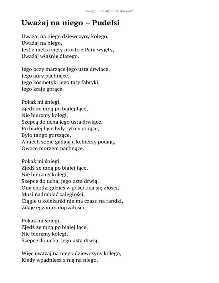 iSing.pl - Każdy może śpiewać! Uważaj na niego – Pudelsi Uważaj na niego dziewczyny kolego, Uważaj na niego, Jest z metra cięty prosto z Pani wyjęty, Uważaj właśnie dlatego. Jego oczy marzące jego usta drwiące, Jego aury pachnące, Jego kosmetyki jego taty fabryki, Jego kraje gorące. Pokaż mi śniegi, Zjedź ze mną po białej łące, Nie bierzmy kolegi, Szepcą do ucha jego usta drwiące. Po białej łące były rytmy gorące, Było tango gorszące, A niech sobie gadają a kelnerzy podają, Owoce morzem pachnące. Pokaż mi śniegi, Zjedź ze mną po białej łące, Nie bierzmy kolegi, Szepce do ucha, jego usta drwią. Ona chodzi gdzieś w gości ona się złości, Musi nadrabiać zaległości, Ciągle u koleżanki nie ma czasu na randki, Zdaje egzamin dojrzałości. Pokaż mi śniegi, Zjedź ze mną po białej łące, Nie bierzmy kolegi, Szepce do ucha, jego usta drwią. Więc uważaj na niego dziewczyny kolego, Kiedy wpadniesz z nią na niego, Jest z metra cięty prosto z Pani wyjęty, Uważaj właśnie dlatego. Pokaż mi śniegi, Zjedź ze mną po białej łące, Nie bierzmy kolegi, Szepcą do ucha jego usta drwiące. Pokaż mi śniegi, Zjedź ze mną po białej łące, Nie bierzmy kolegi, Szepce do ucha, jego usta drwią. Słowa: Maleńczuk, Bieniasz, Dreadhunter Muzyka: Maleńczuk, Bieniasz, Dreadhunter Rok wydania: brak danych Płyta: brak danych